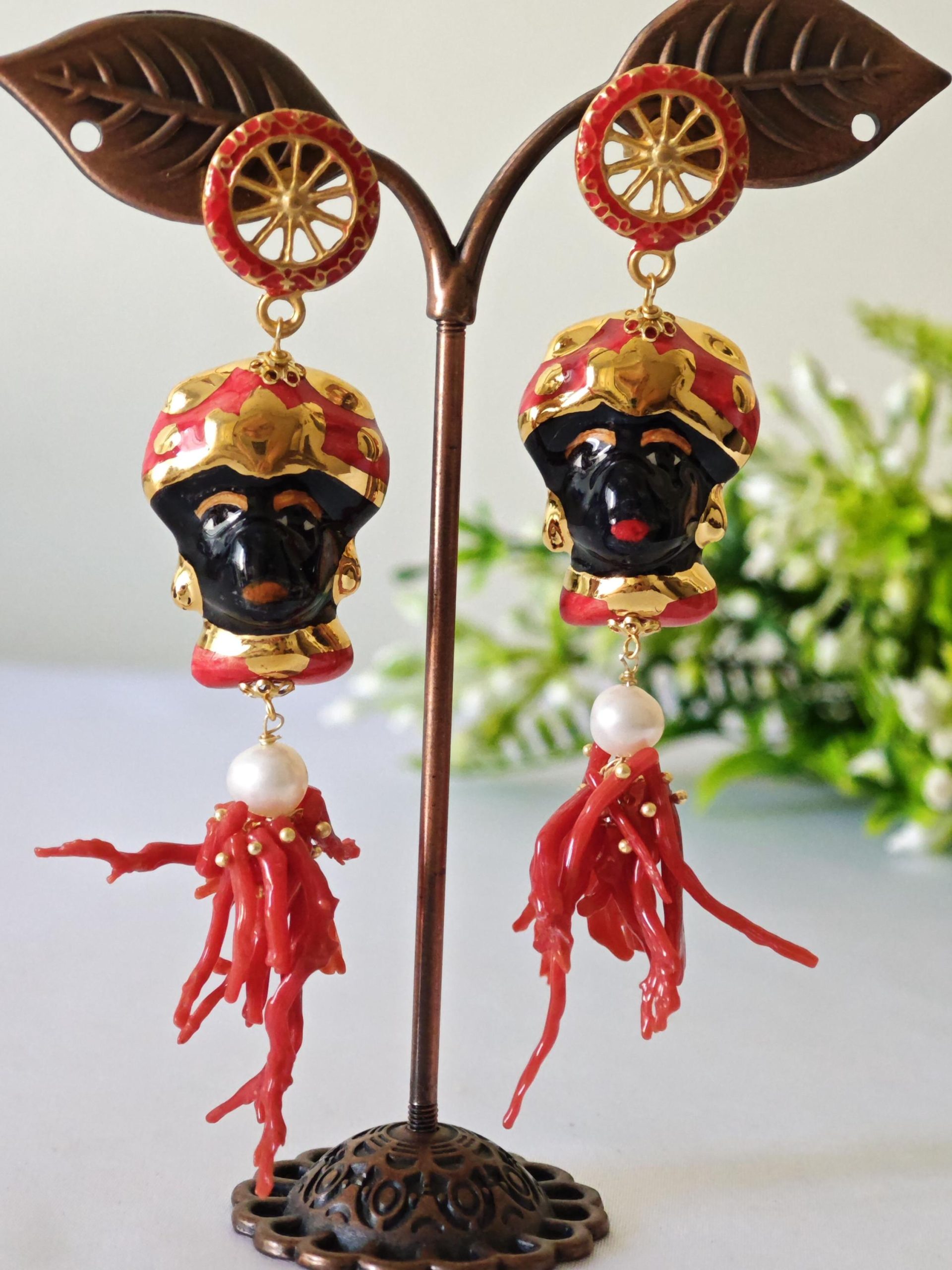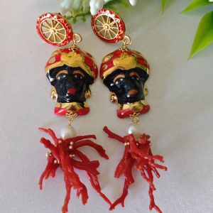 Orecchini teste di moro ceramica Caltagirone e corallo rosso mediterraneo, orecchini siciliani