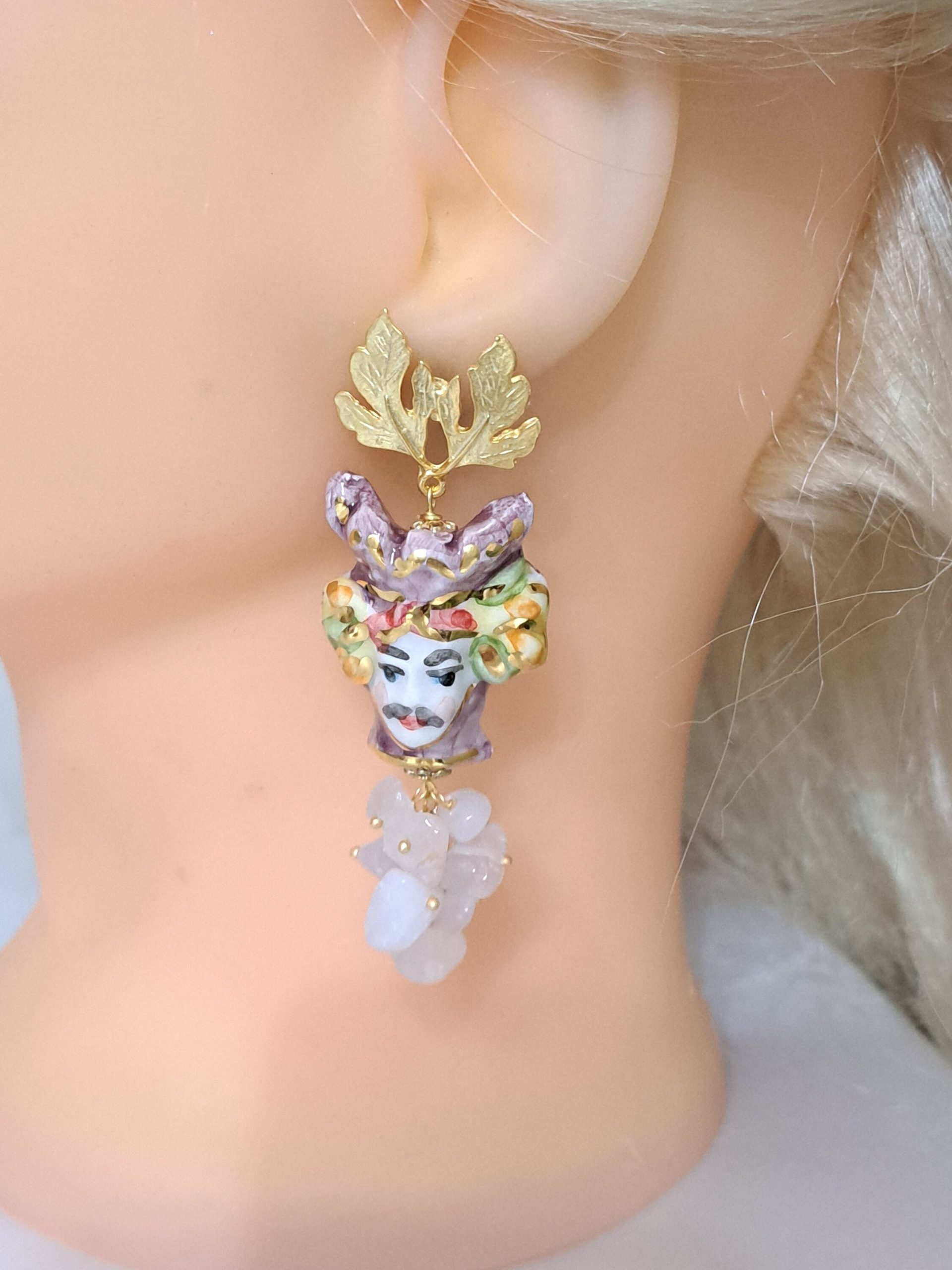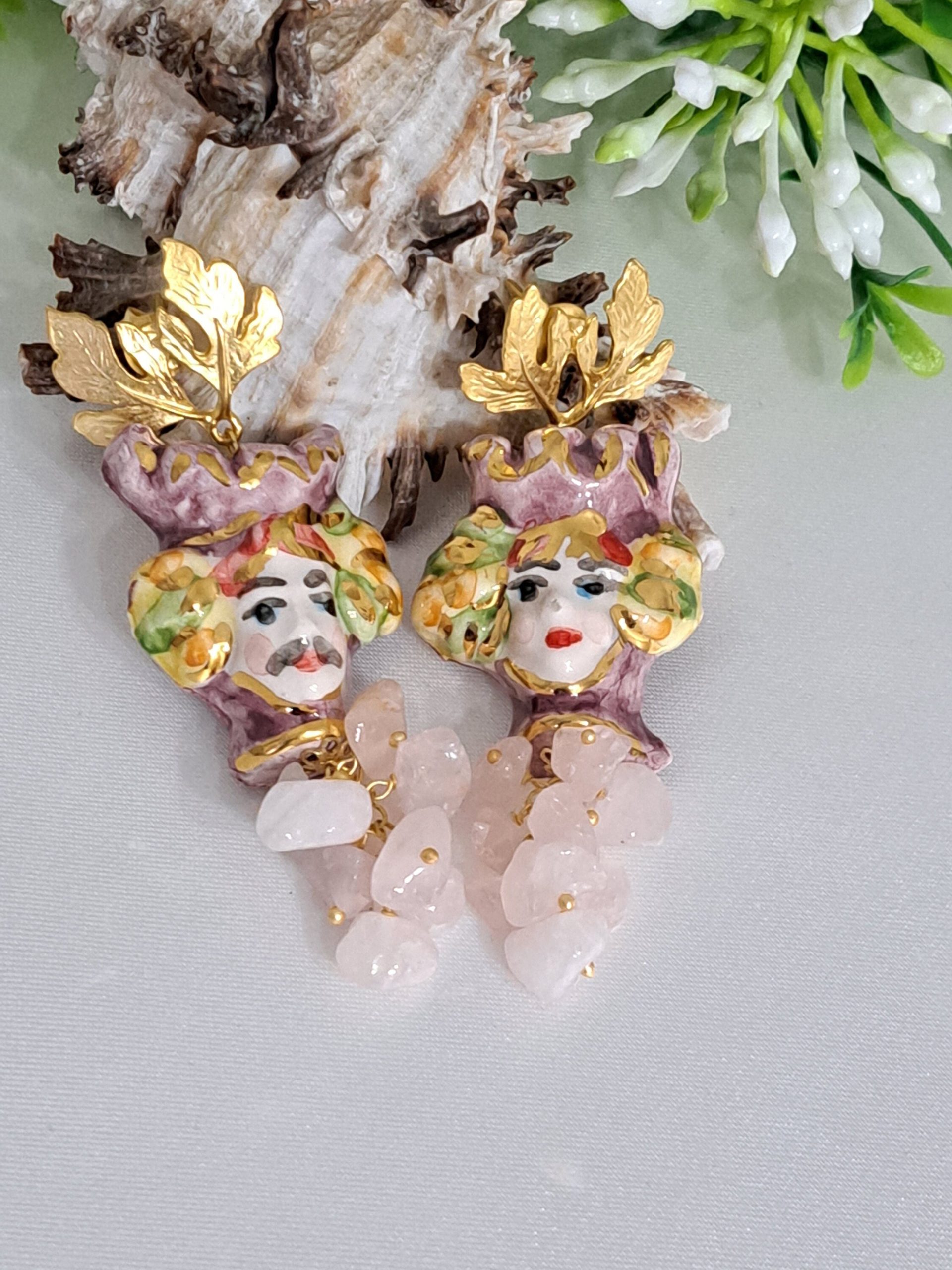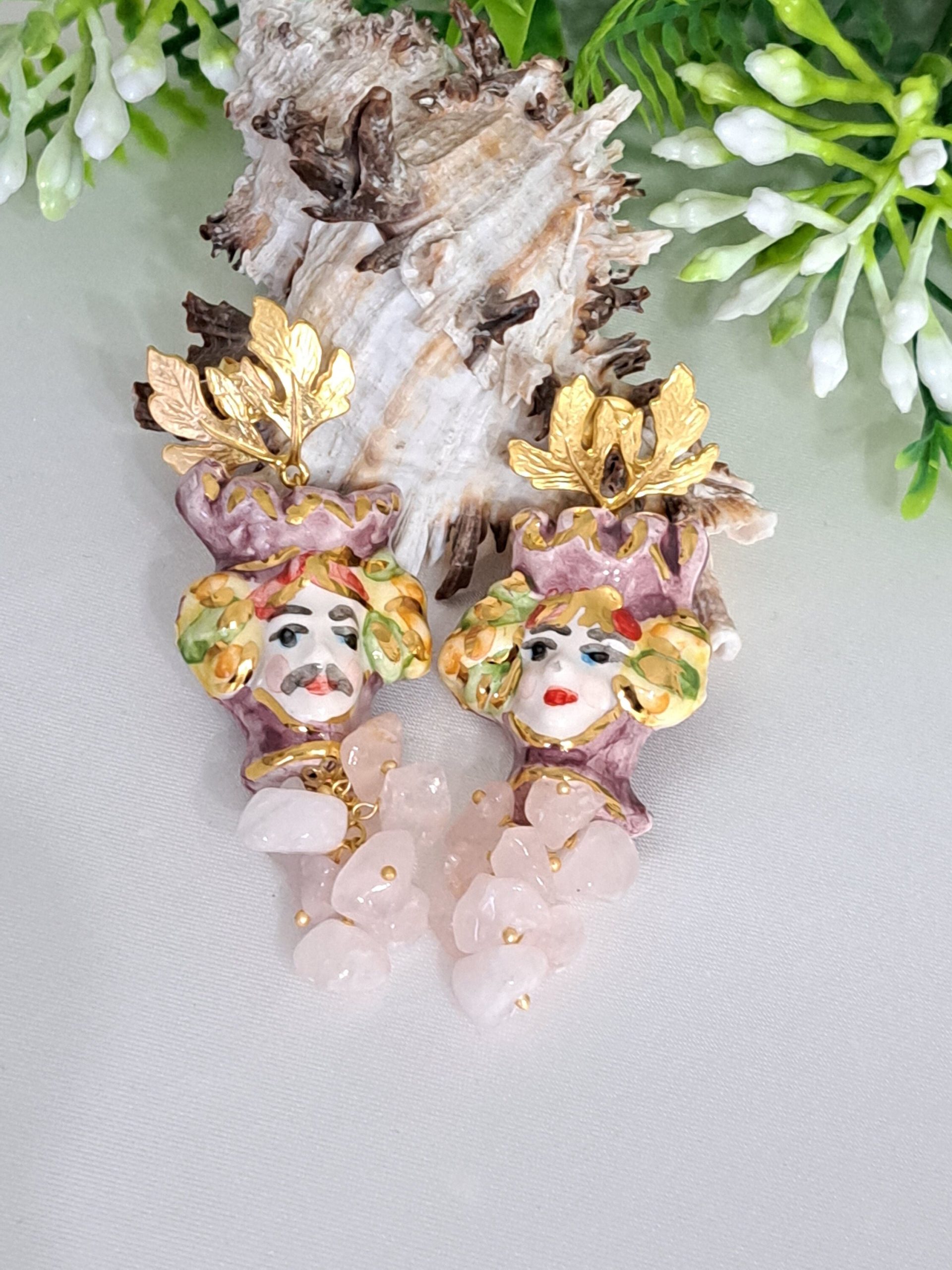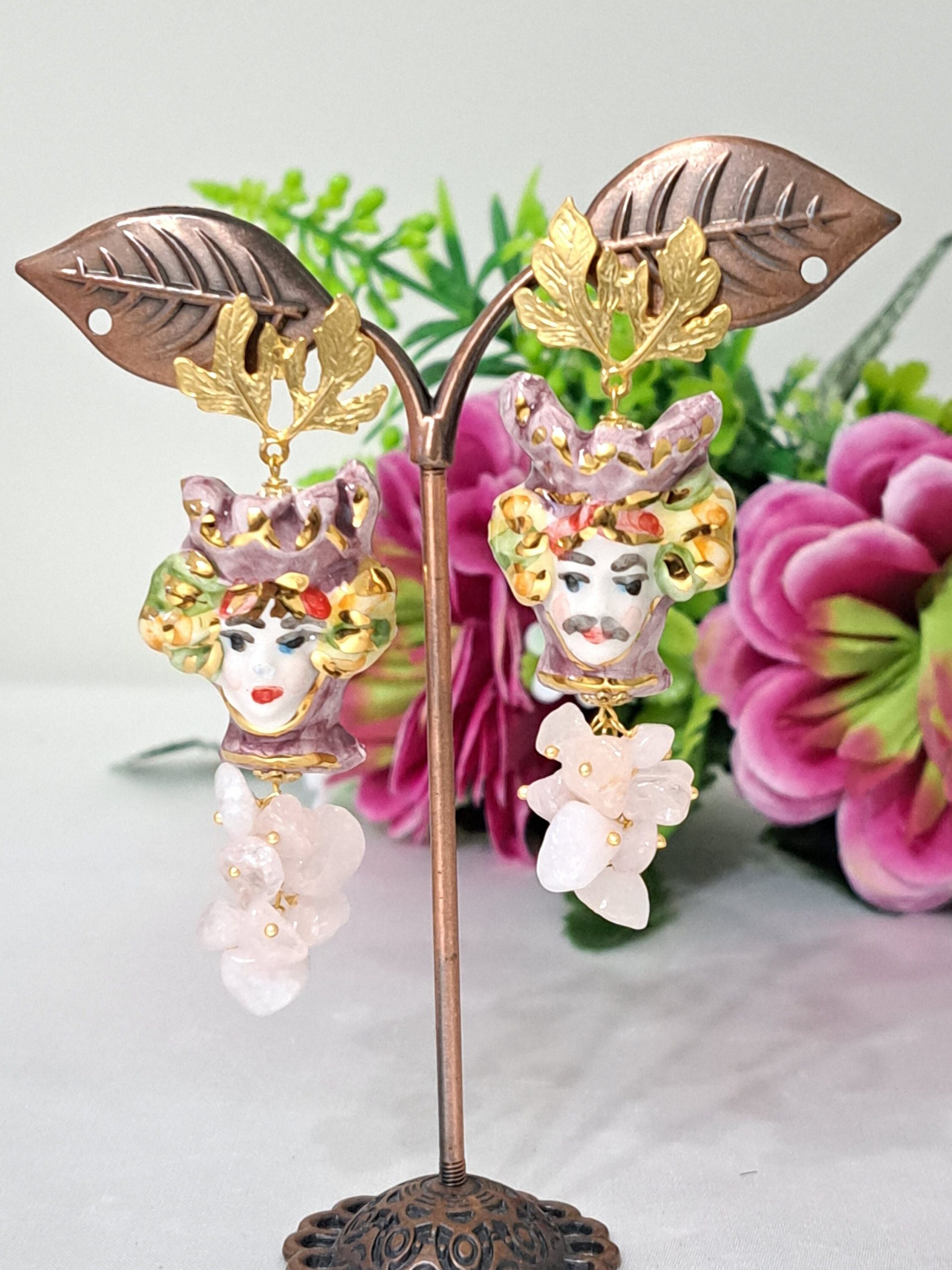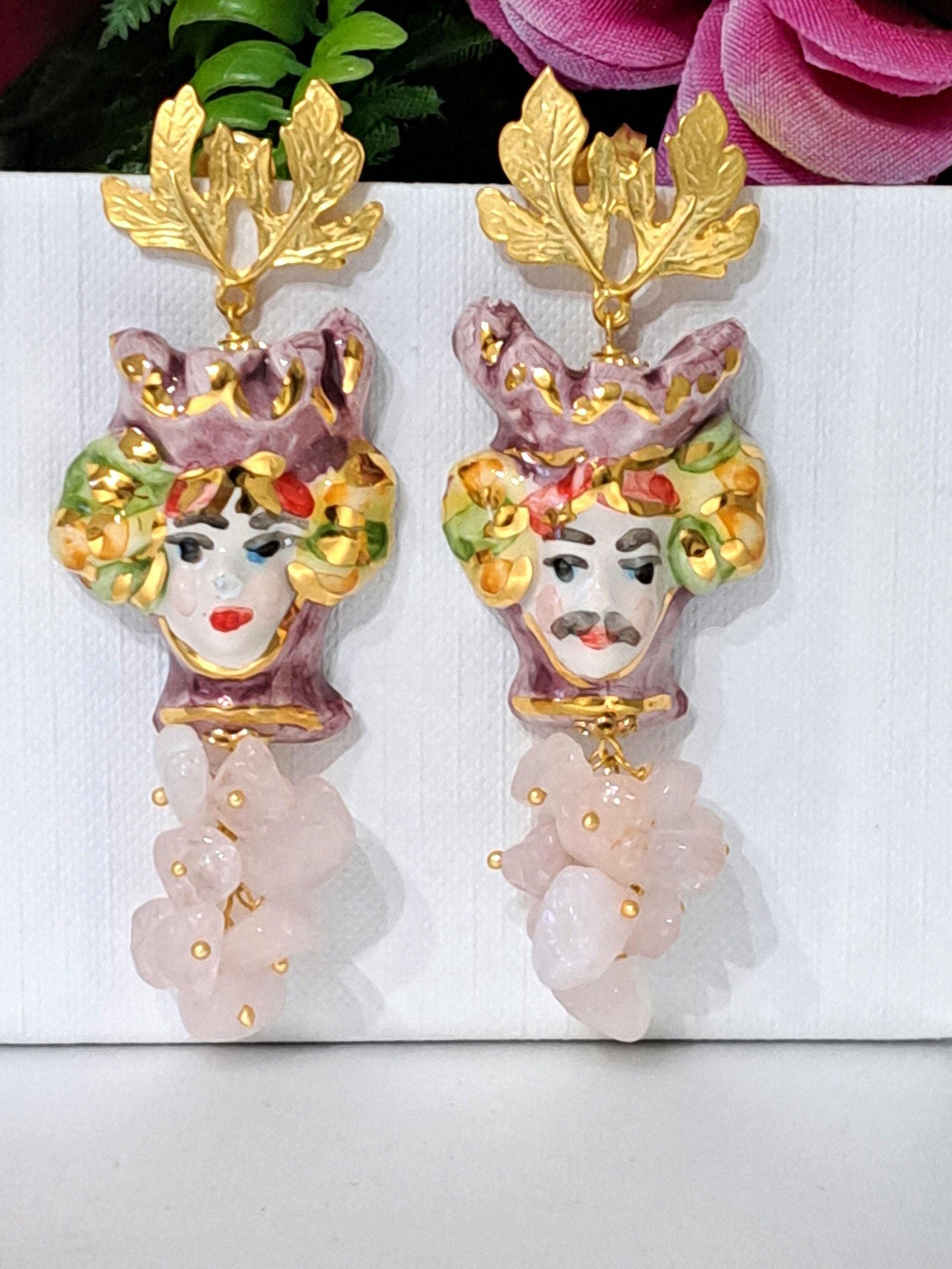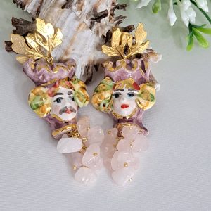 Orecchini teste di moro ceramica Caltagirone e pietre dure quarzo rosa, orecchini siciliani