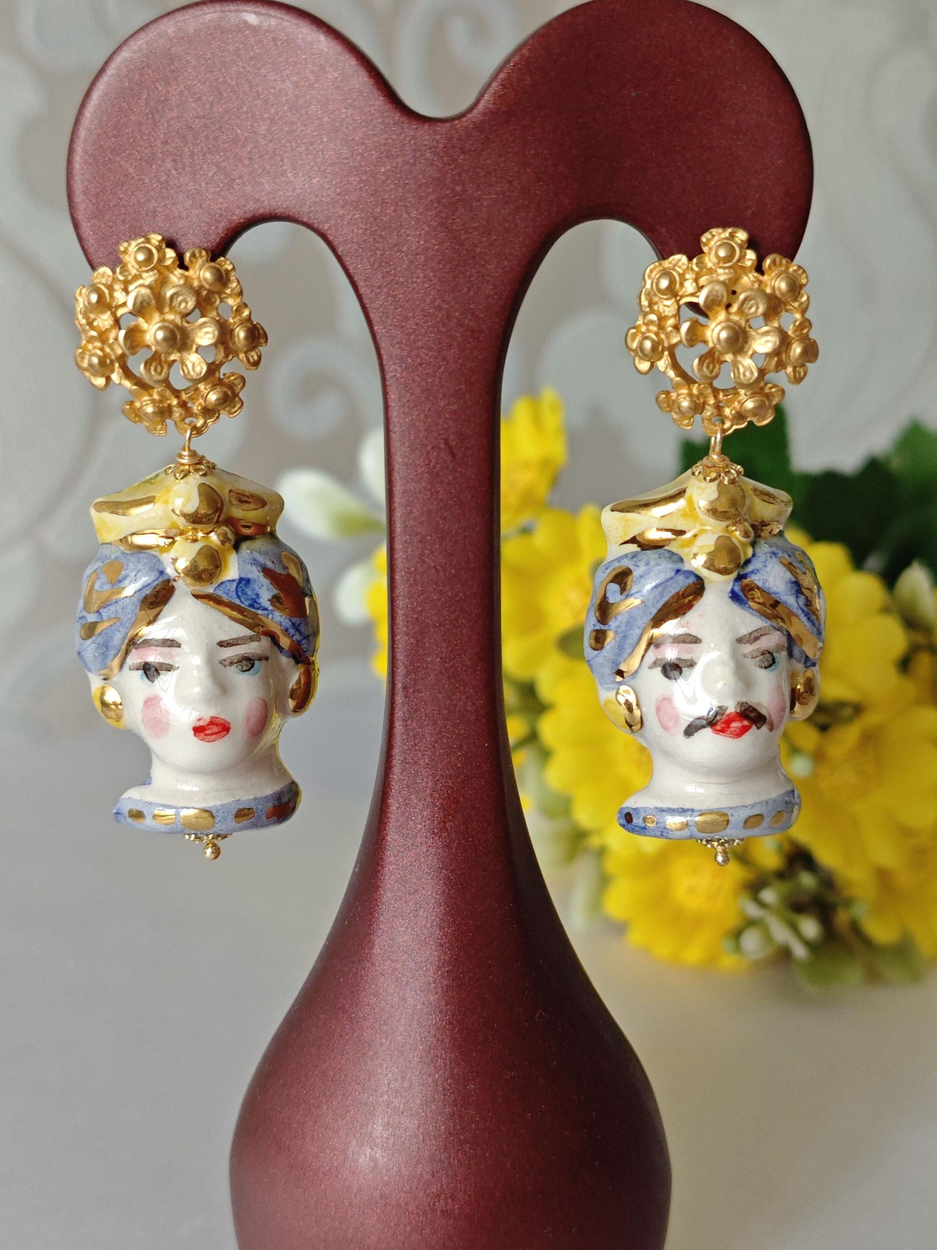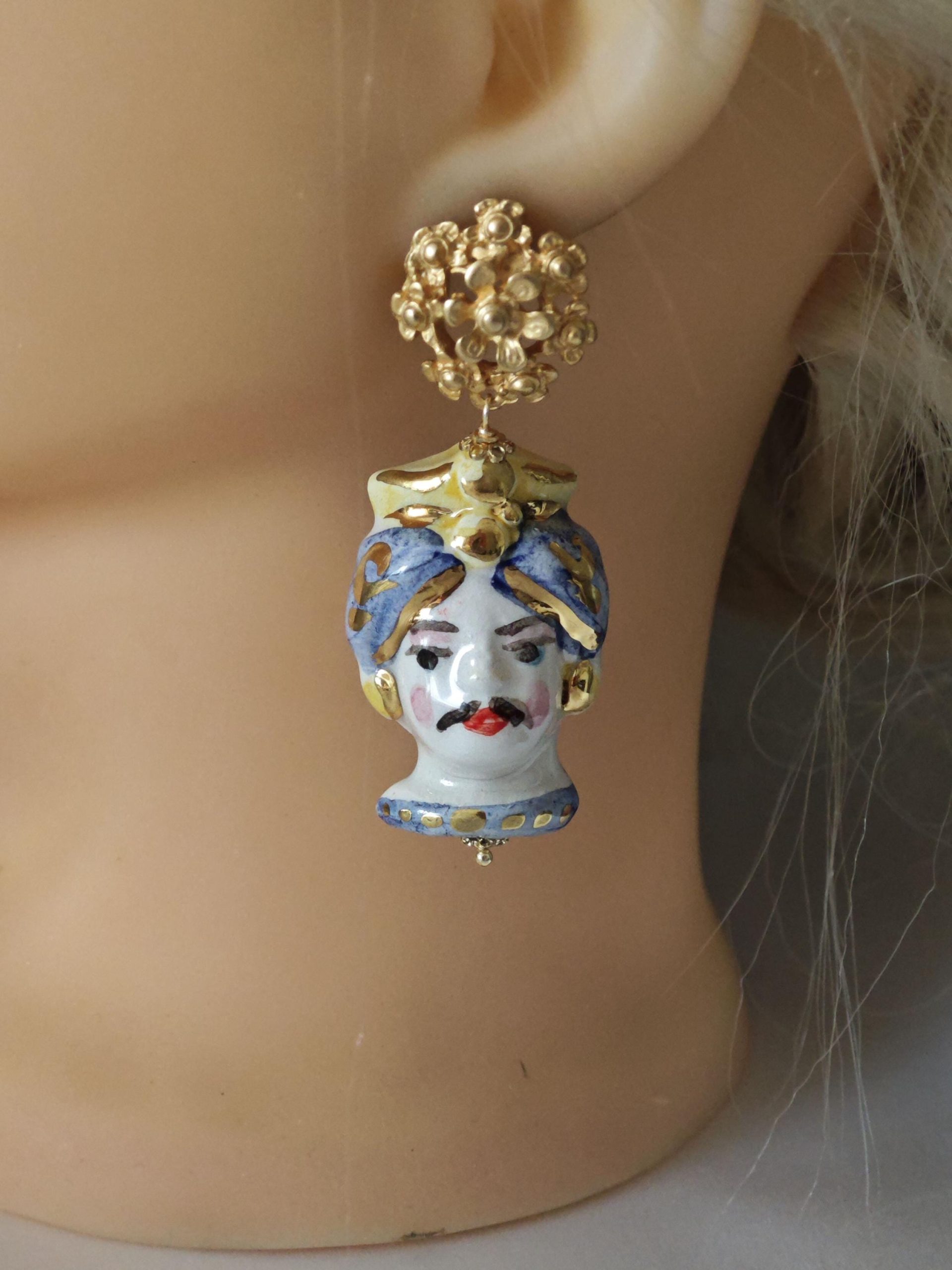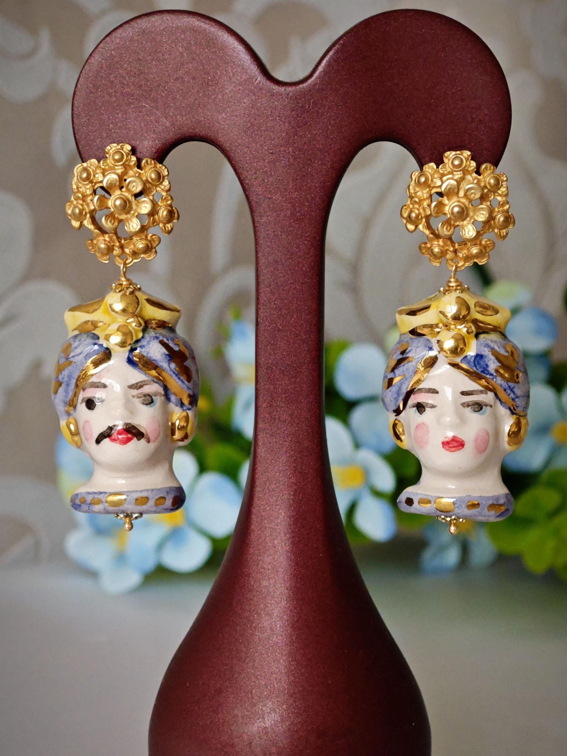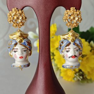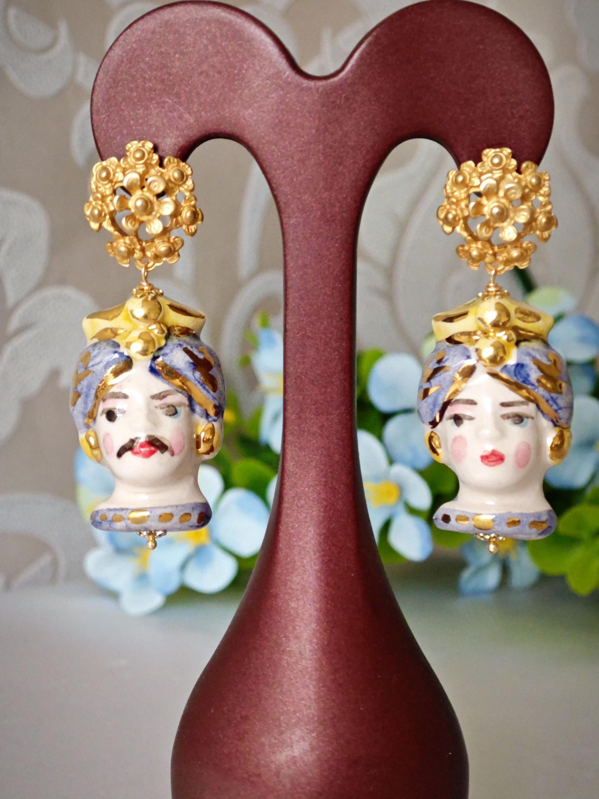 Orecchini teste di moro ceramica Caltagirone, orecchini fiori , orecchini siciliani, orecchini maxi