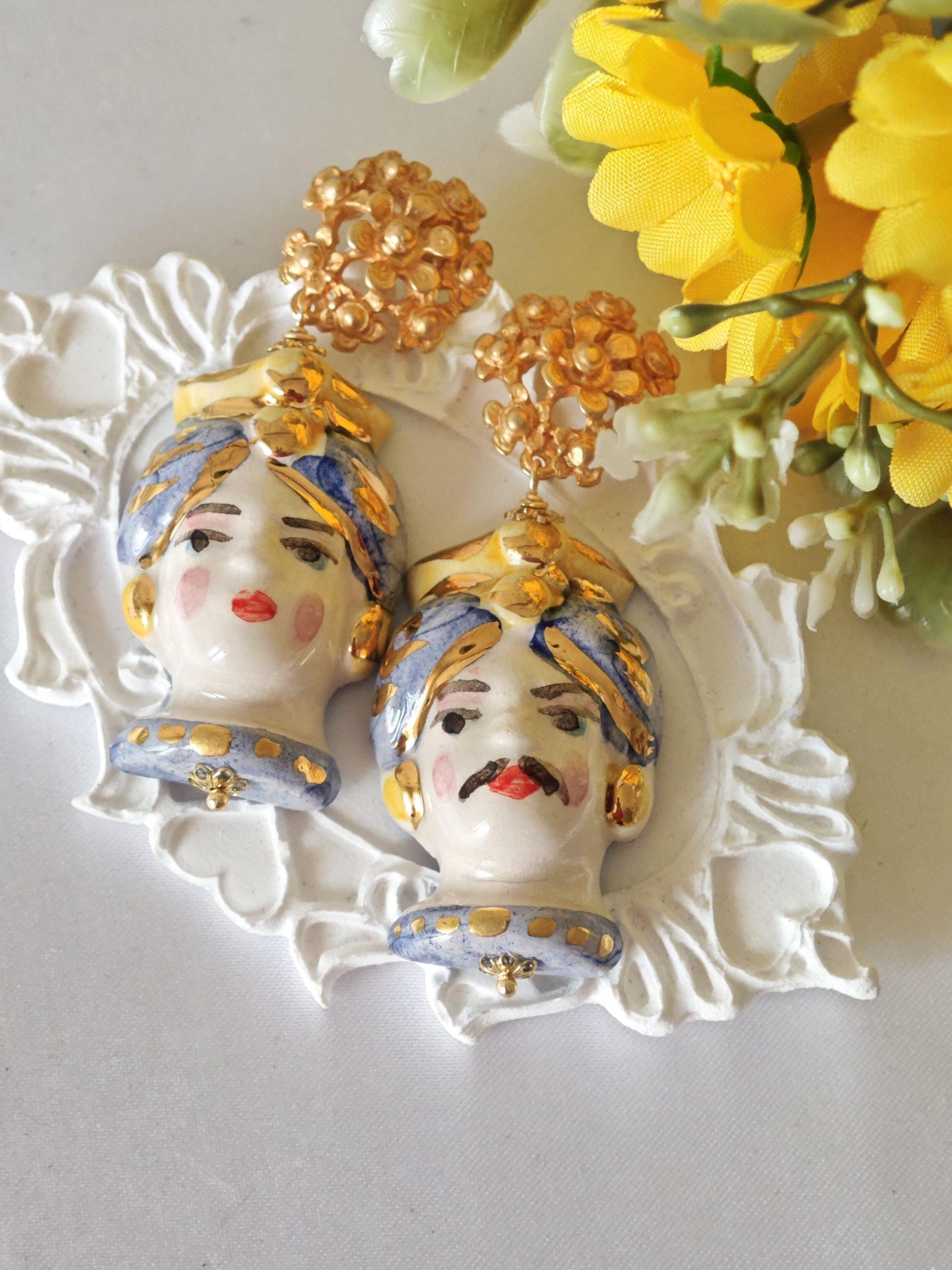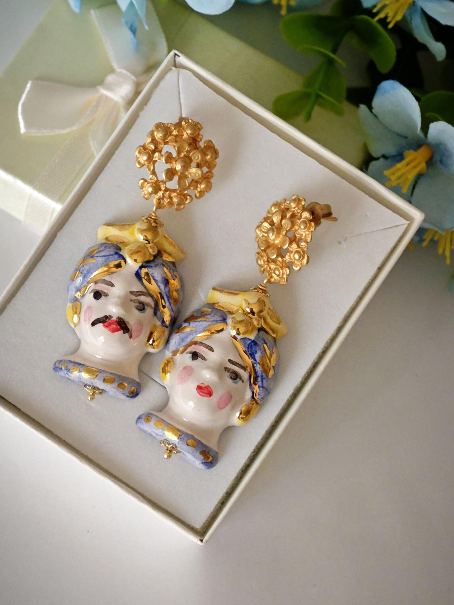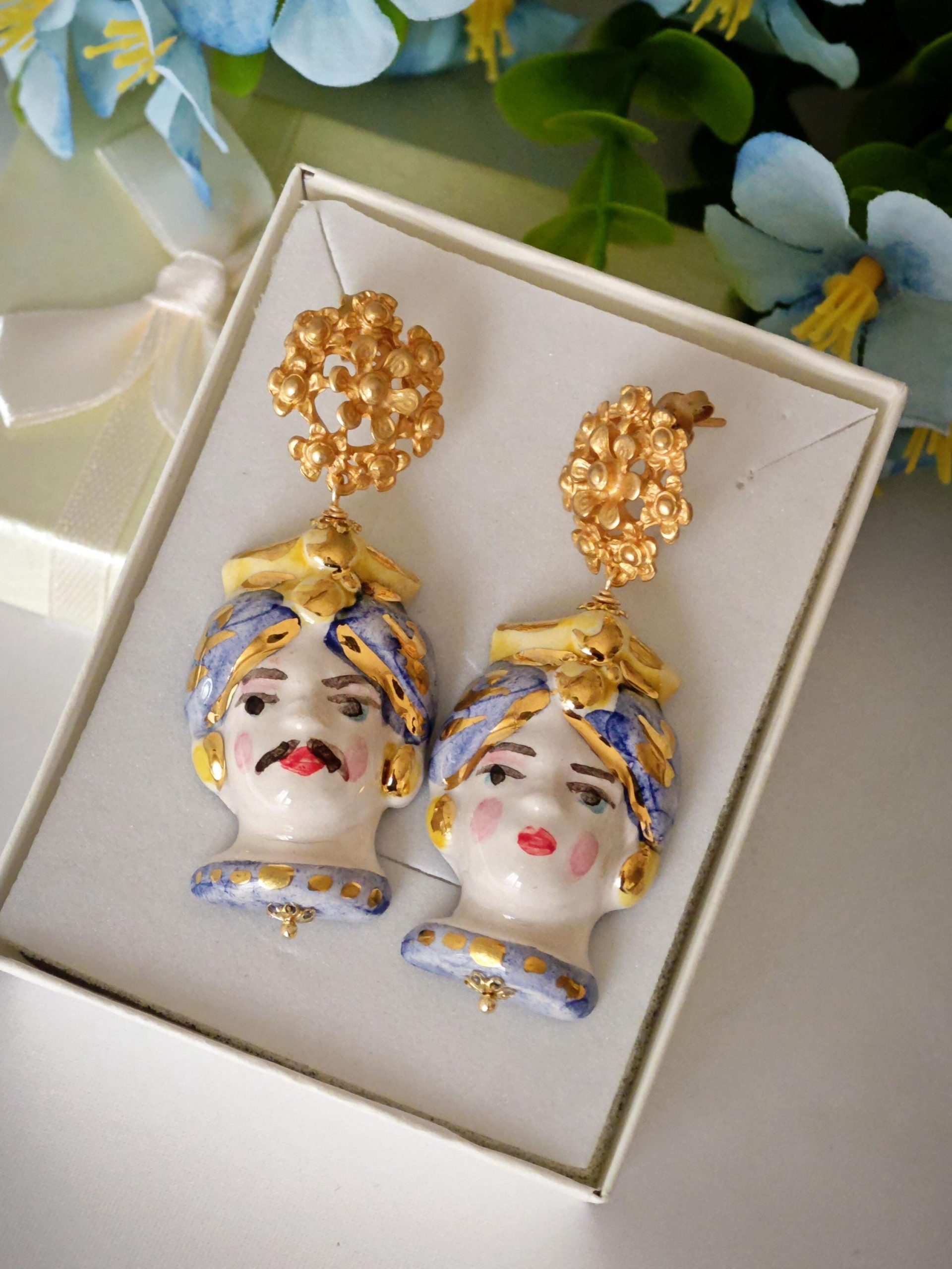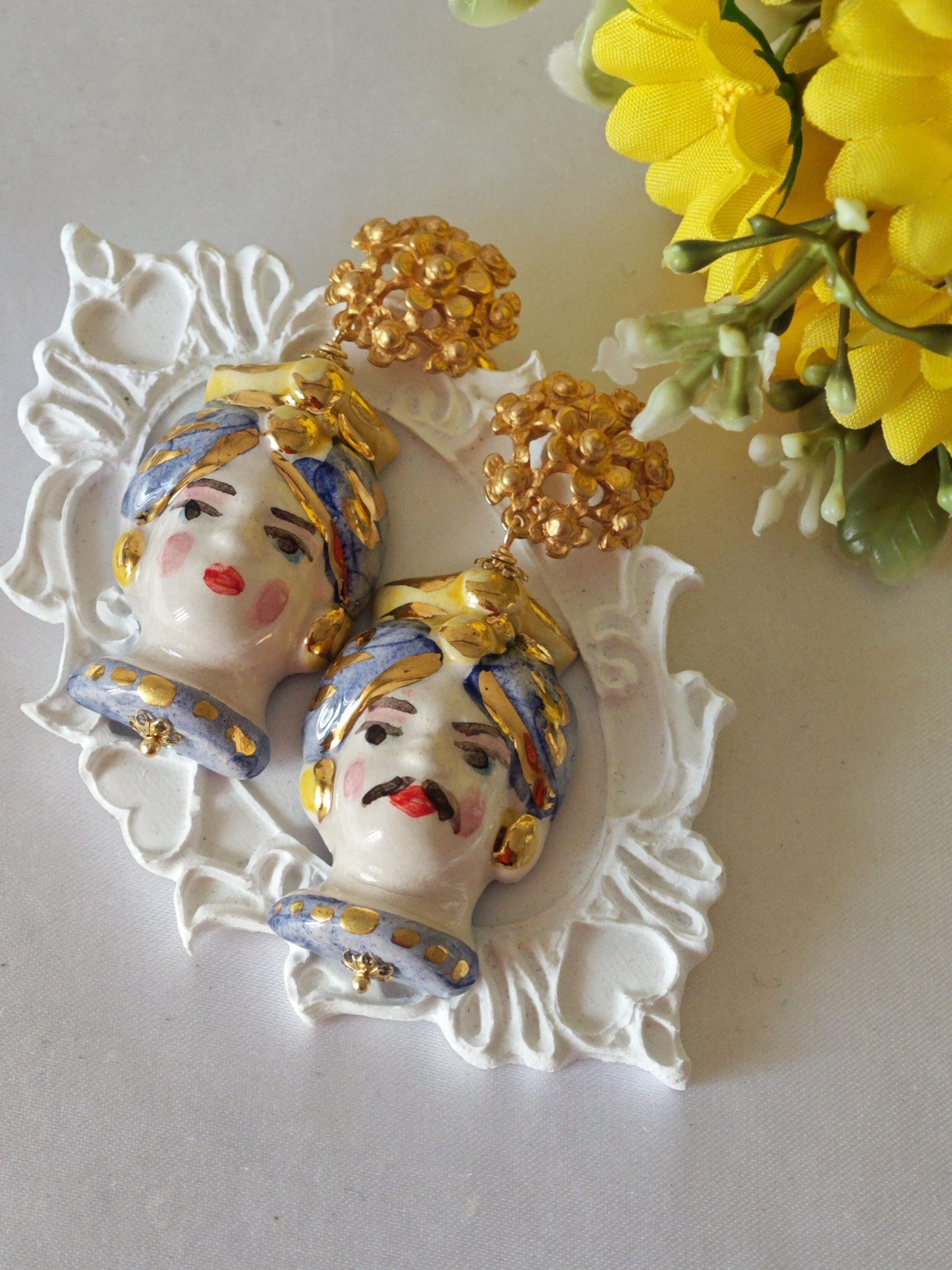 Orecchini teste di moro ceramica Caltagirone, orecchini fiori , orecchini siciliani, orecchini maxi