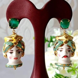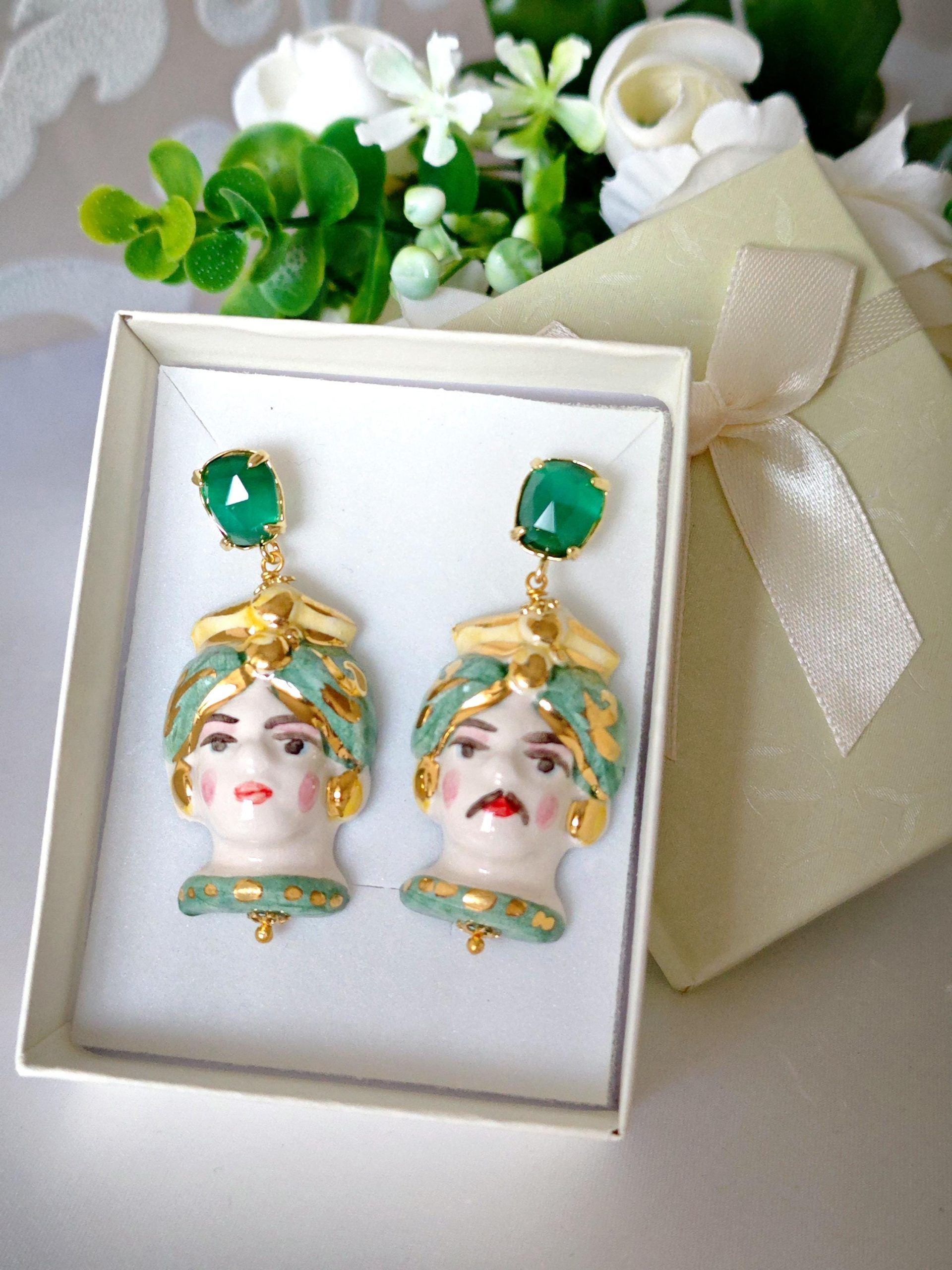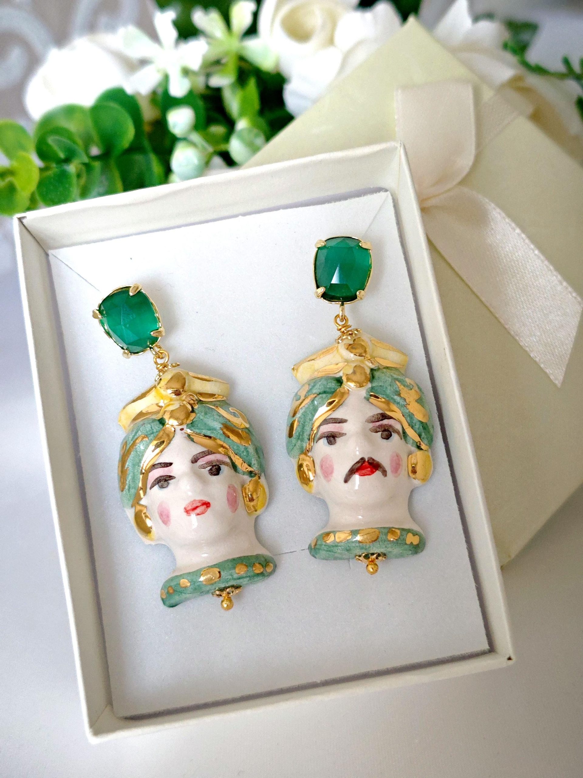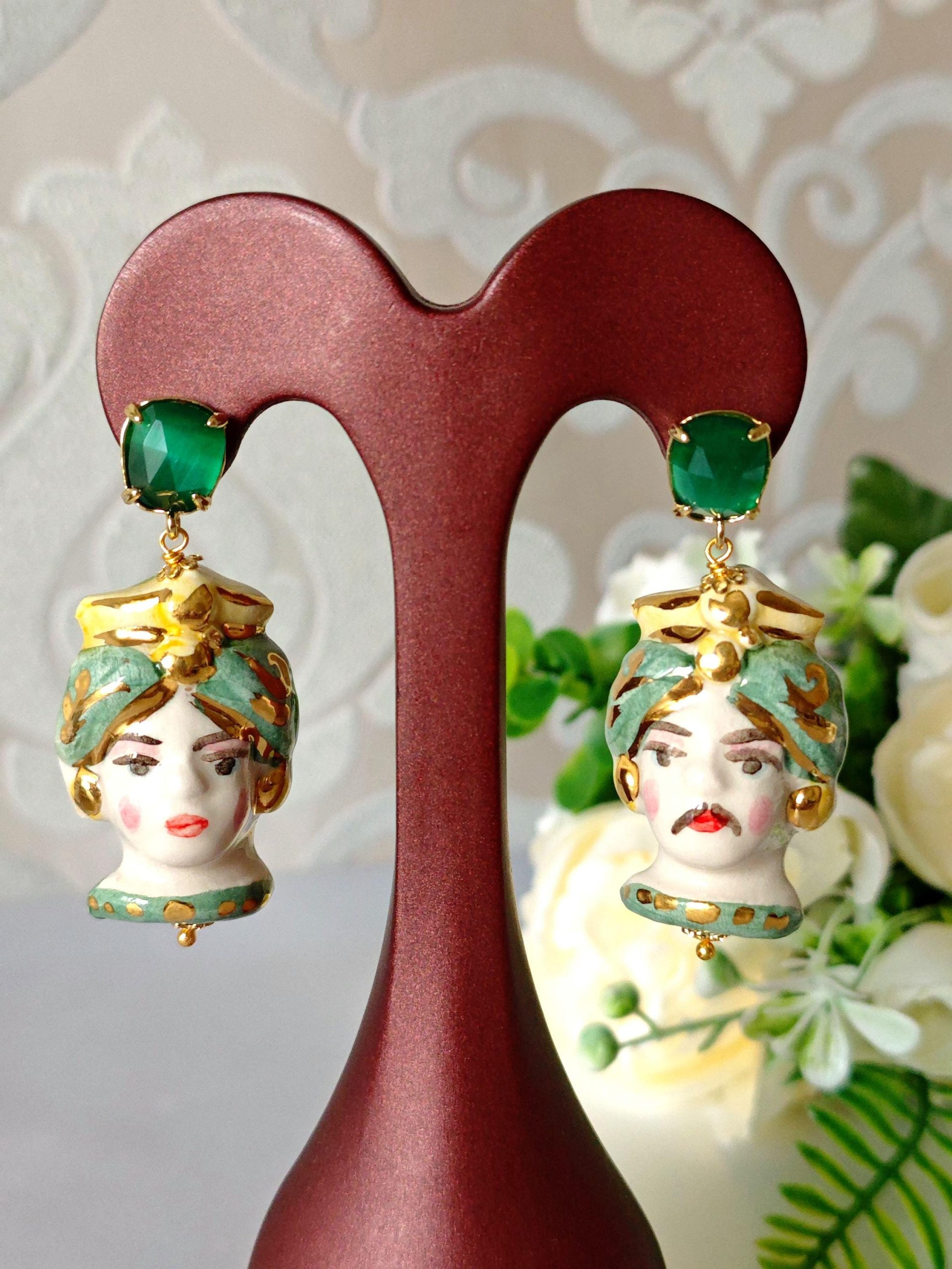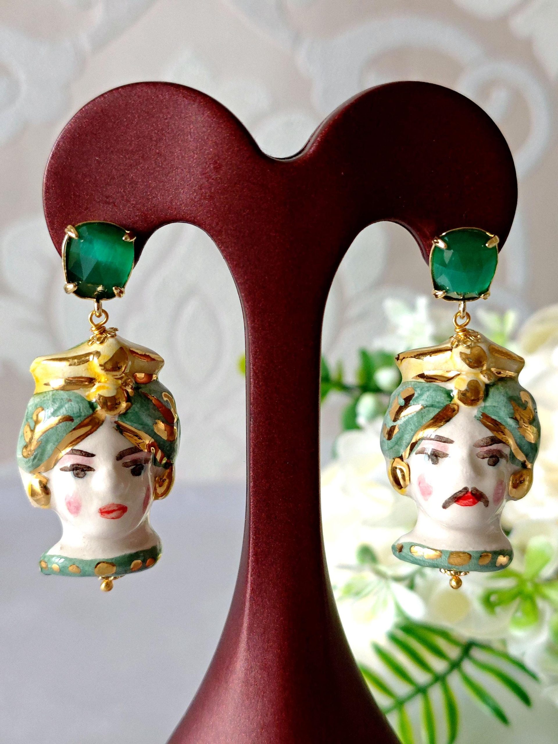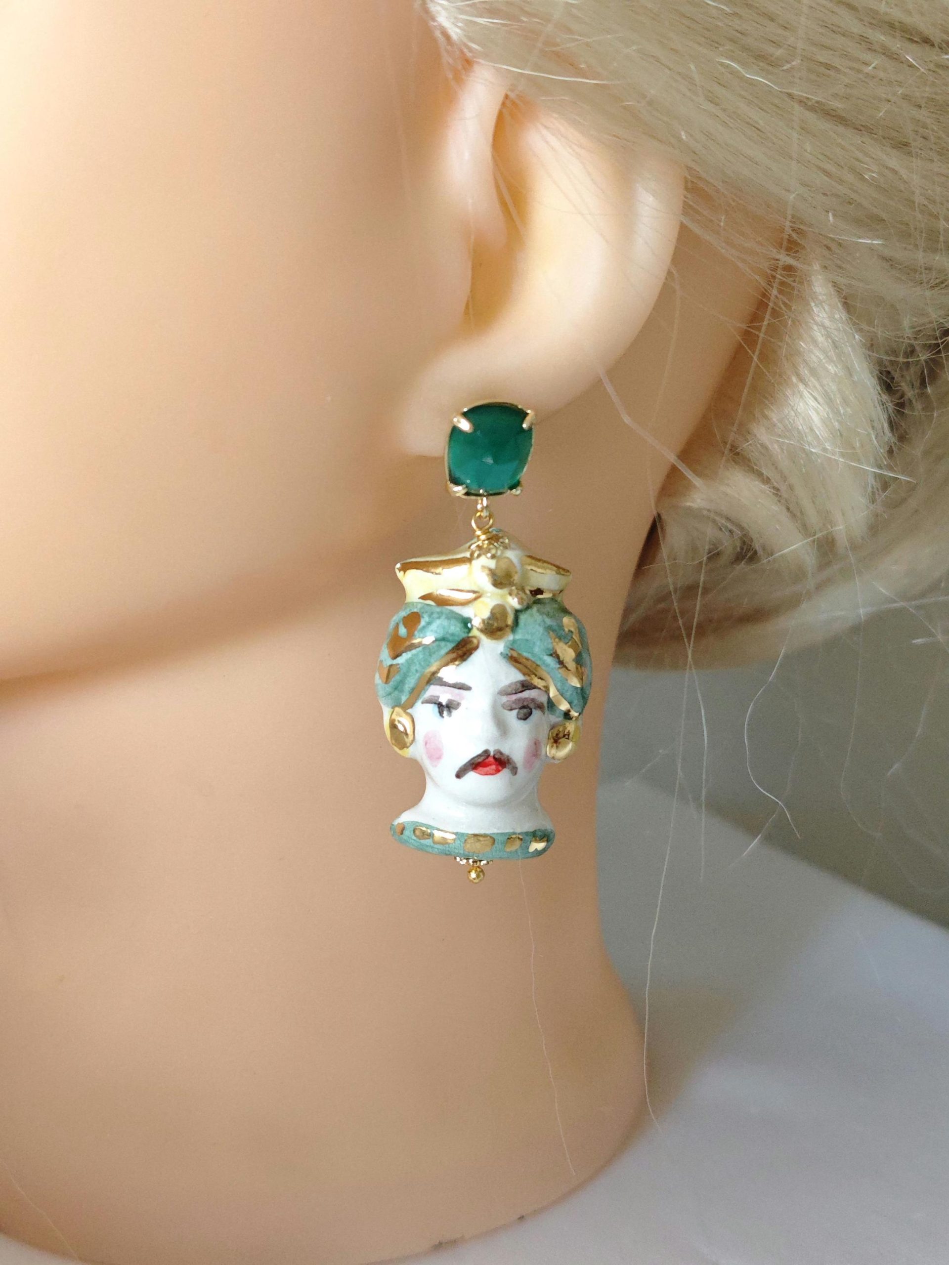 Orecchini pendenti con teste di moro in ceramica di Caltagirone realizzata e dipinta a mano,con applicazioni foglia d’oro 22 kt, 3,5 cm dimensioni , chiusura a perno con farfallina in ottone con pietre quarzo verde occhio di gatto .