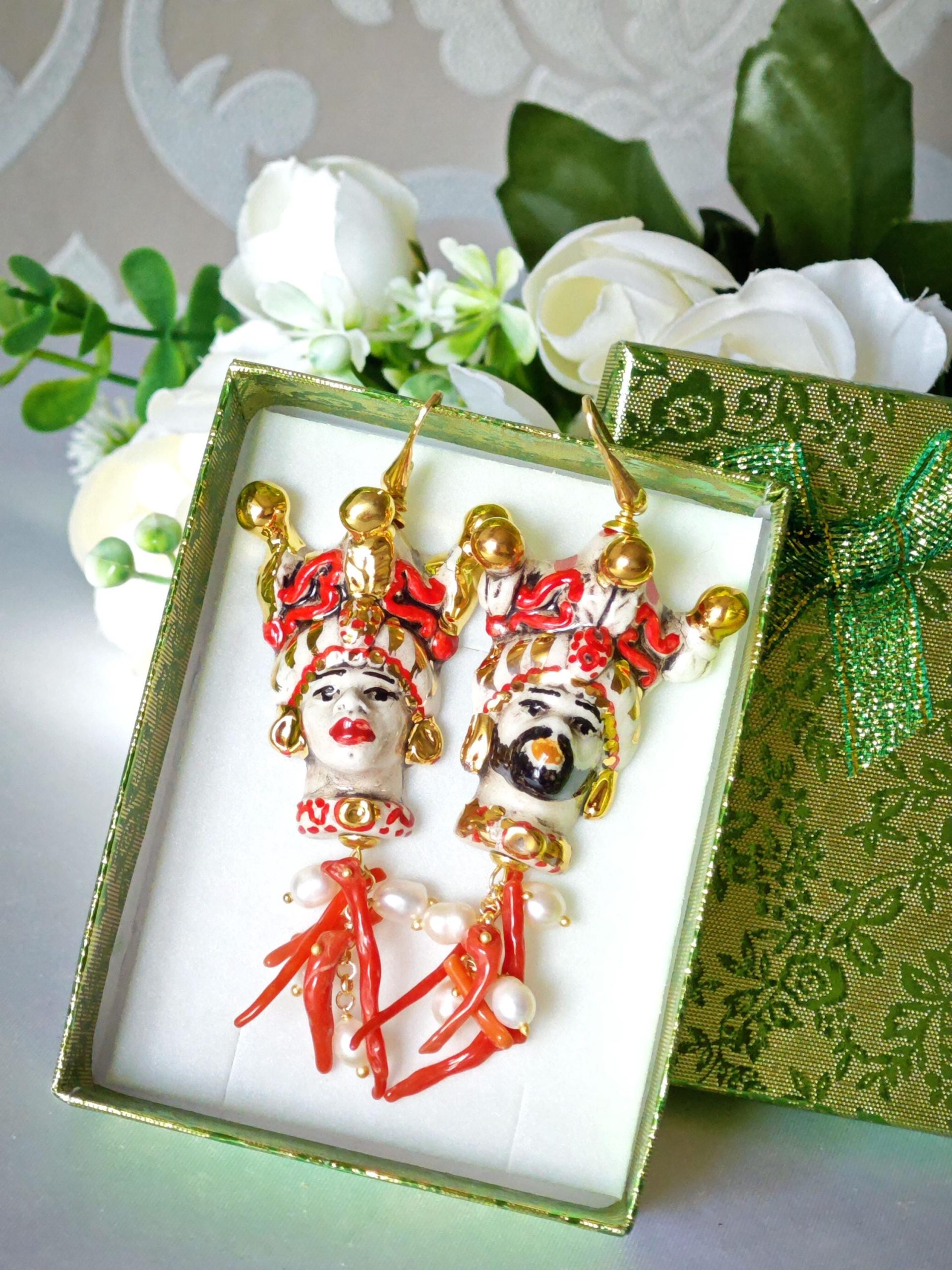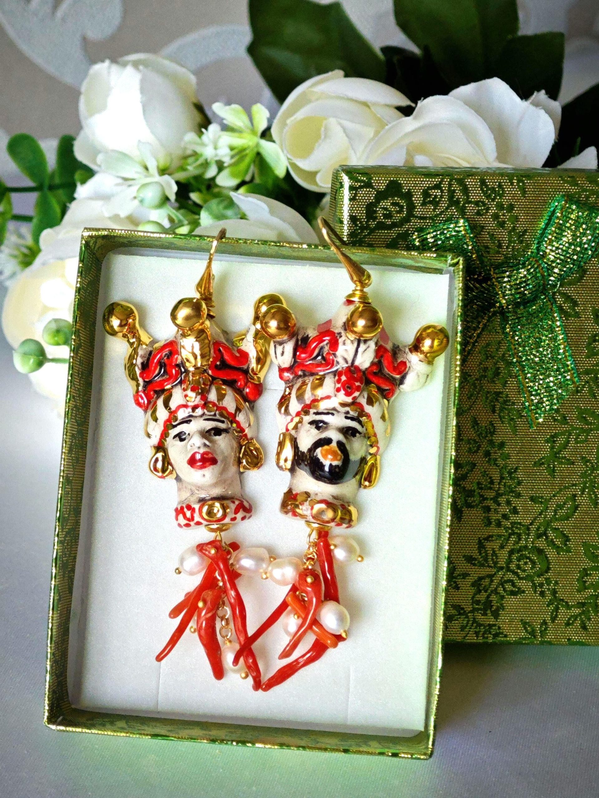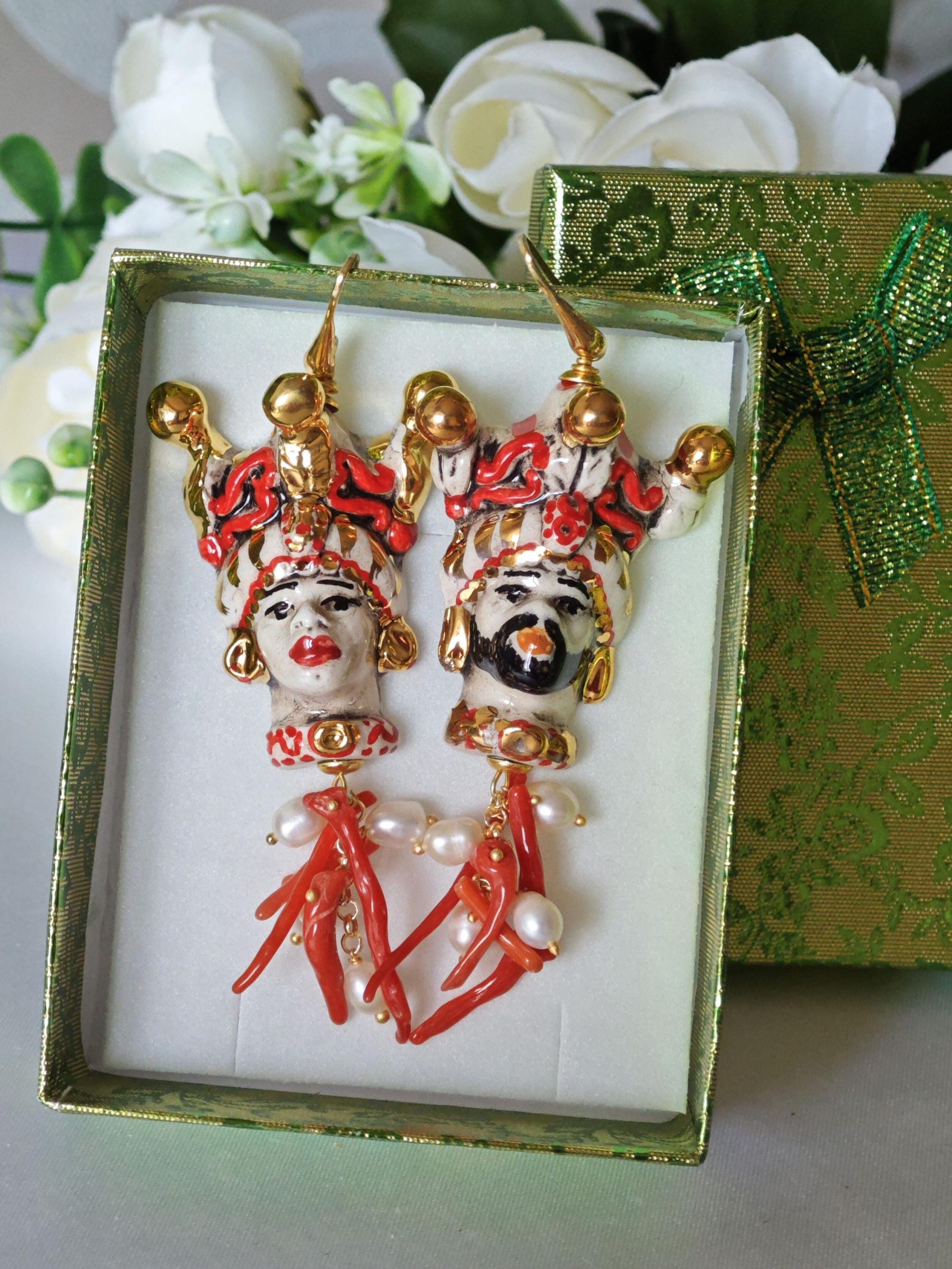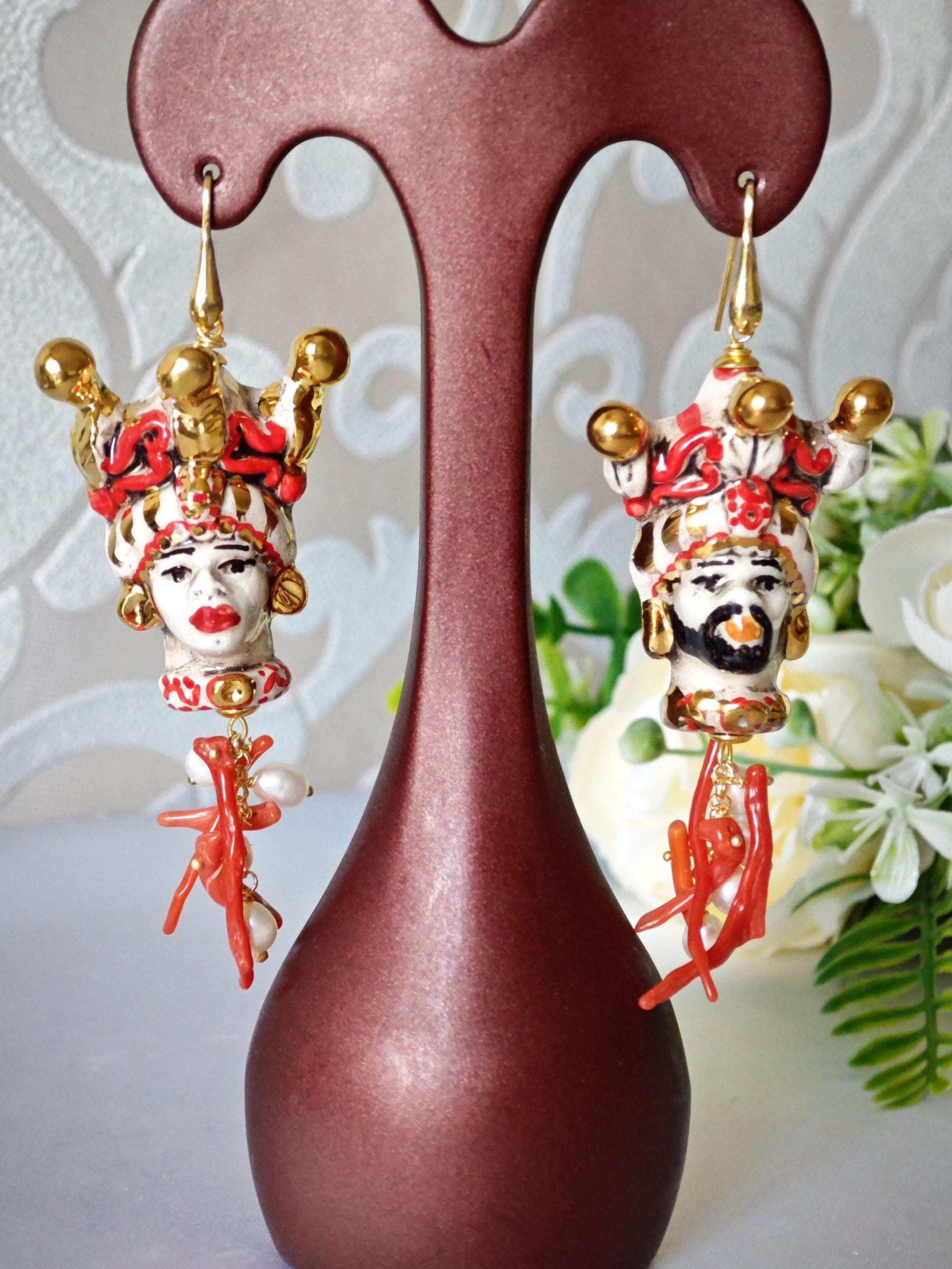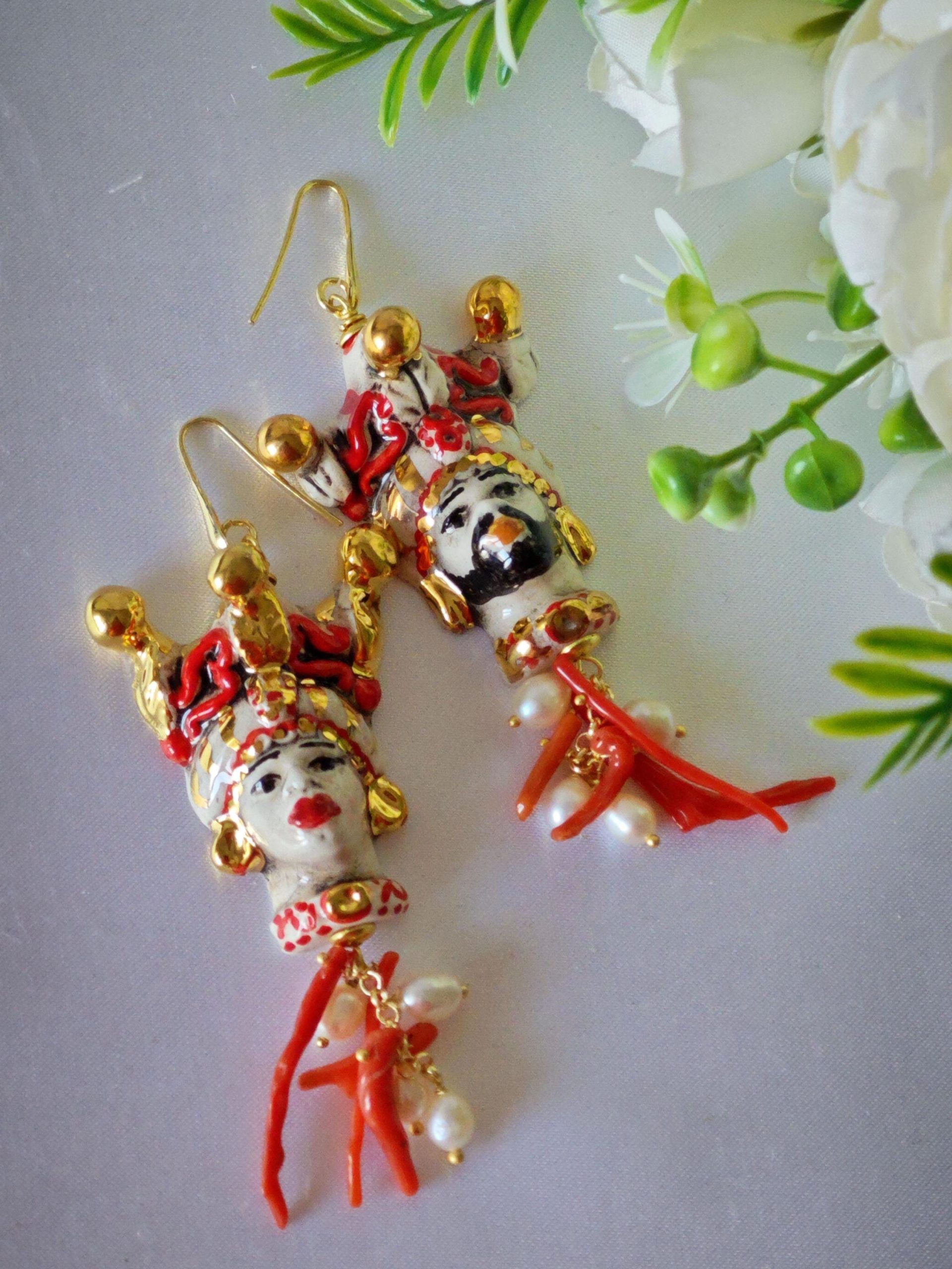 Orecchini pendenti con teste di moro in ceramica di Caltagirone realizzata e dipinta a mano, 4 cm dimensioni, grappolo perle naturali bianche e rametti corallo rosso mediterraneo .