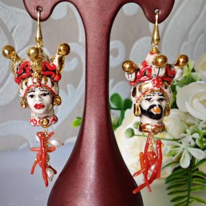 Orecchini teste di moro ceramica Caltagirone, perle bianche e corallo rosso mediterraneo, orecchini siciliani argento 925