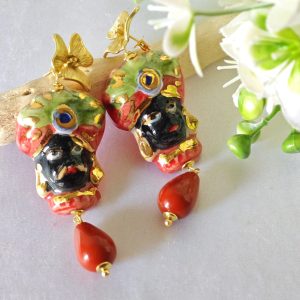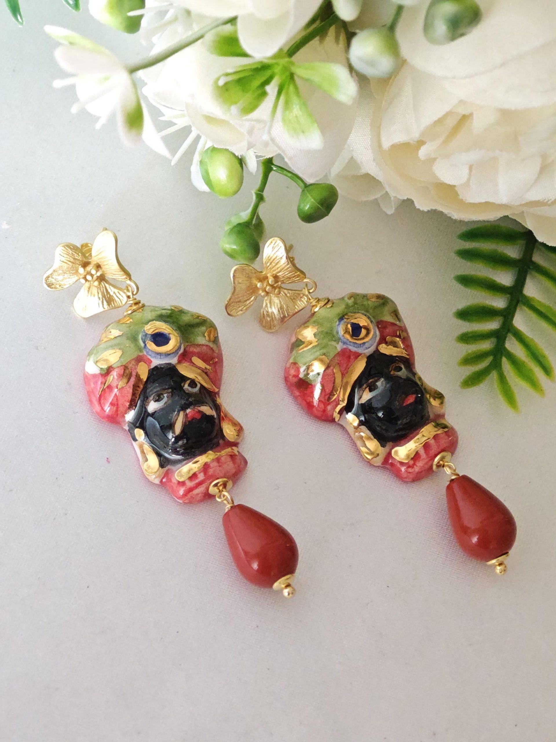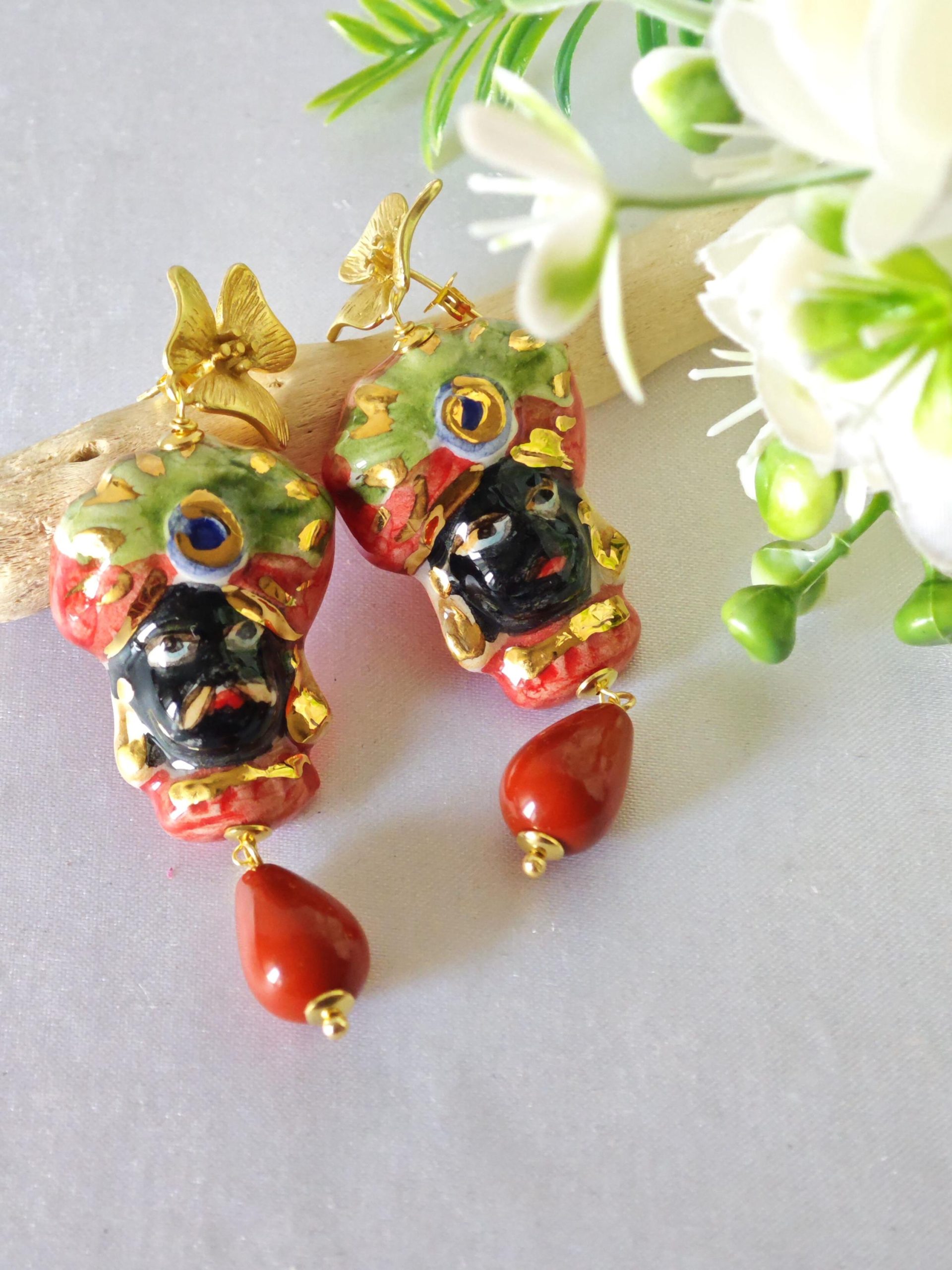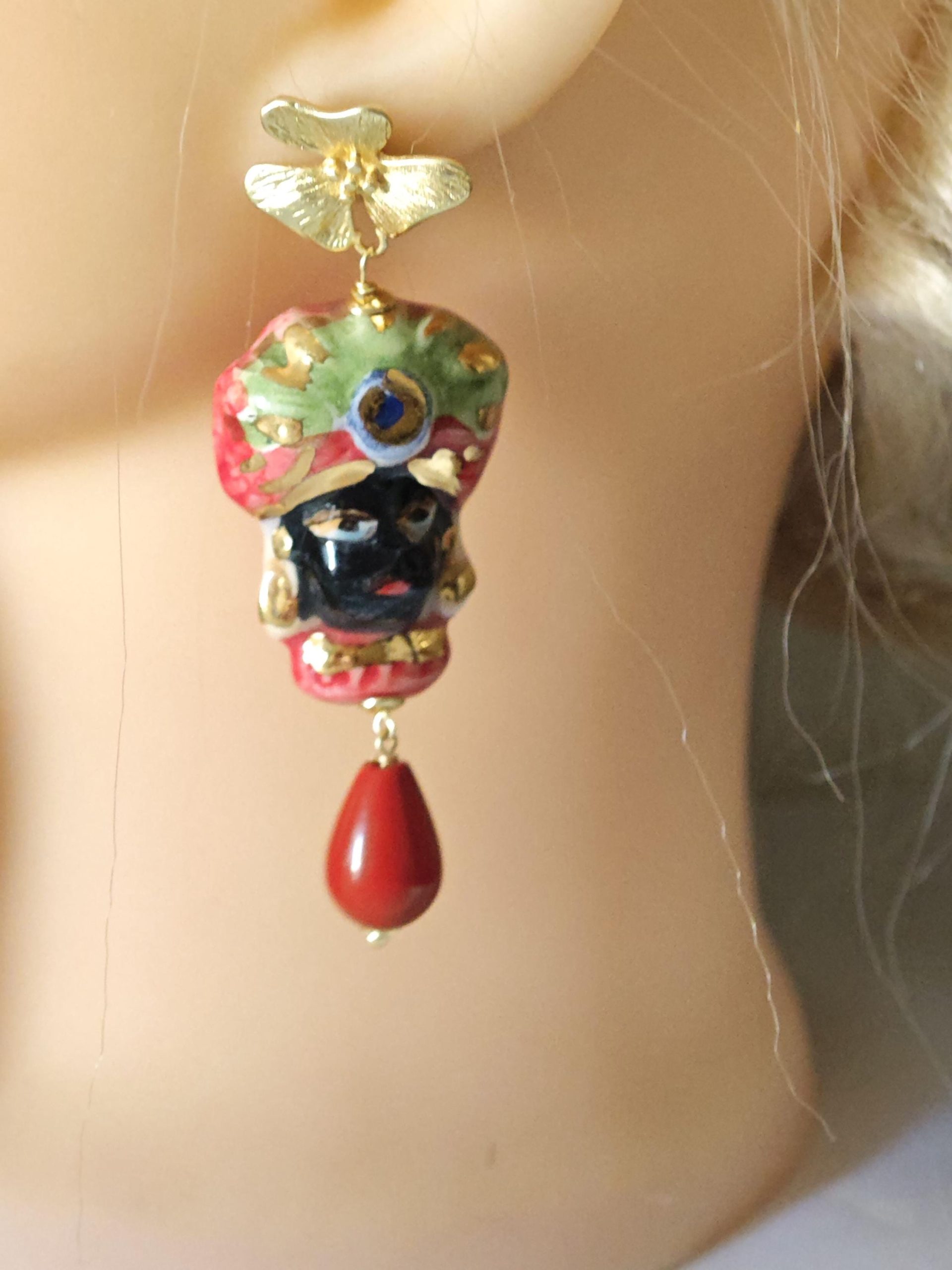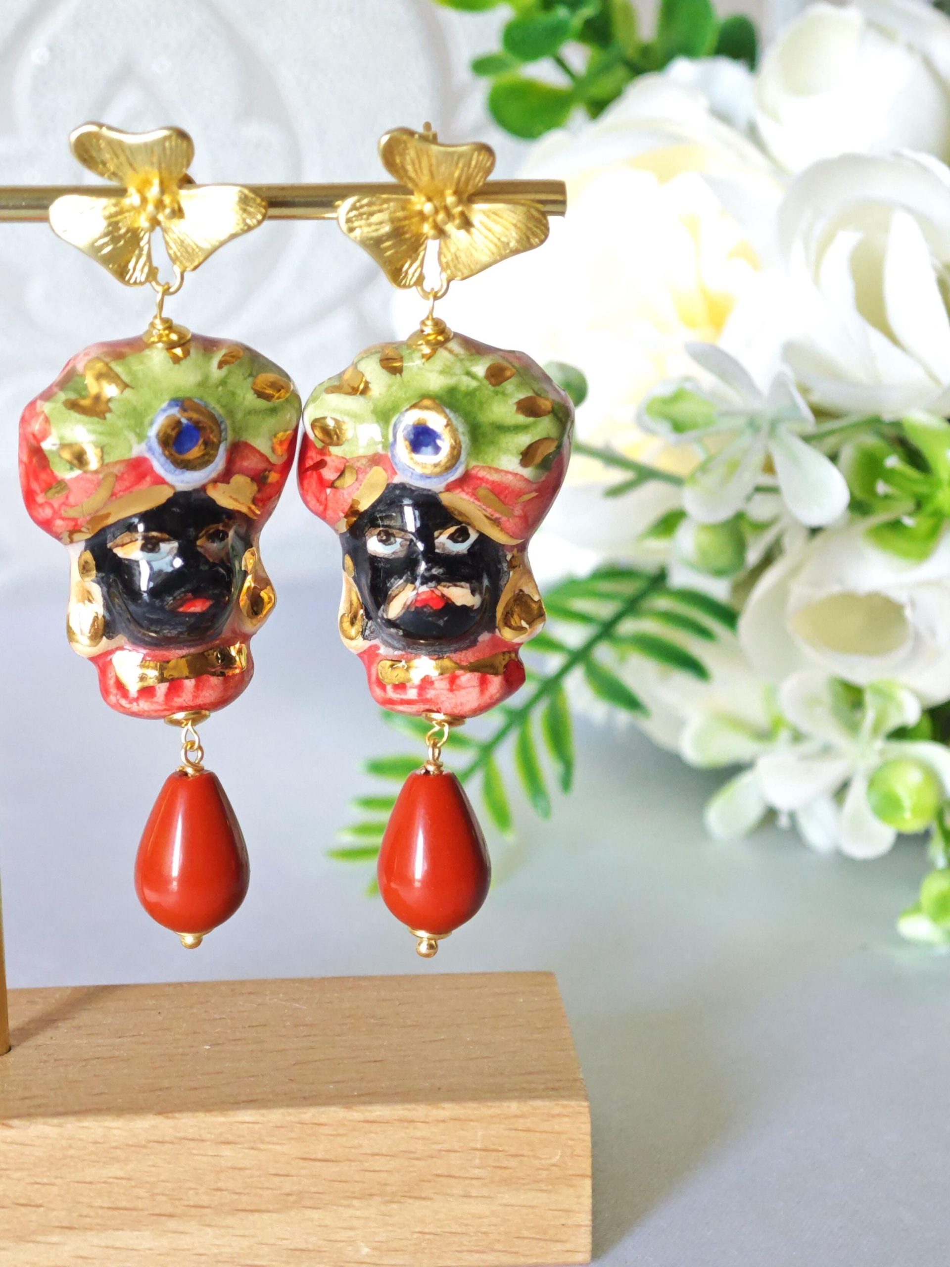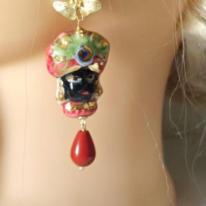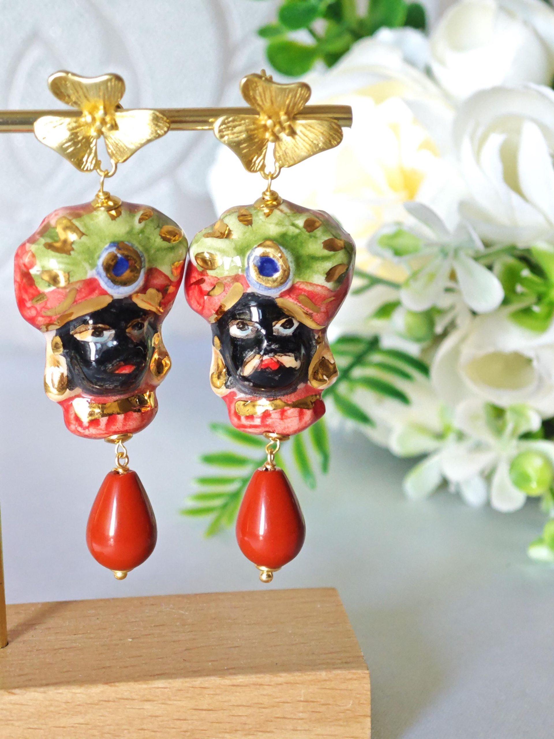 Orecchini teste di moro ceramica Caltagirone , perle pasta di corallo rosso, orecchini siciliani