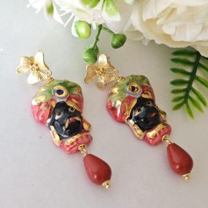 Orecchini pendenti con teste di moro in ceramica di Caltagirone realizzata e dipinta a mano con applicazioni foglia oro 22 kt, 3 cm dimensioni e perle goccia in pasta di corallo rosso imitazione.