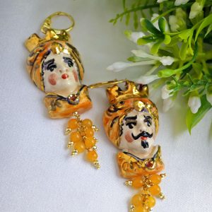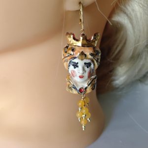 Orecchini teste di moro in ceramica Caltagirone con pietre quarzo giallo, orecchini siciliani