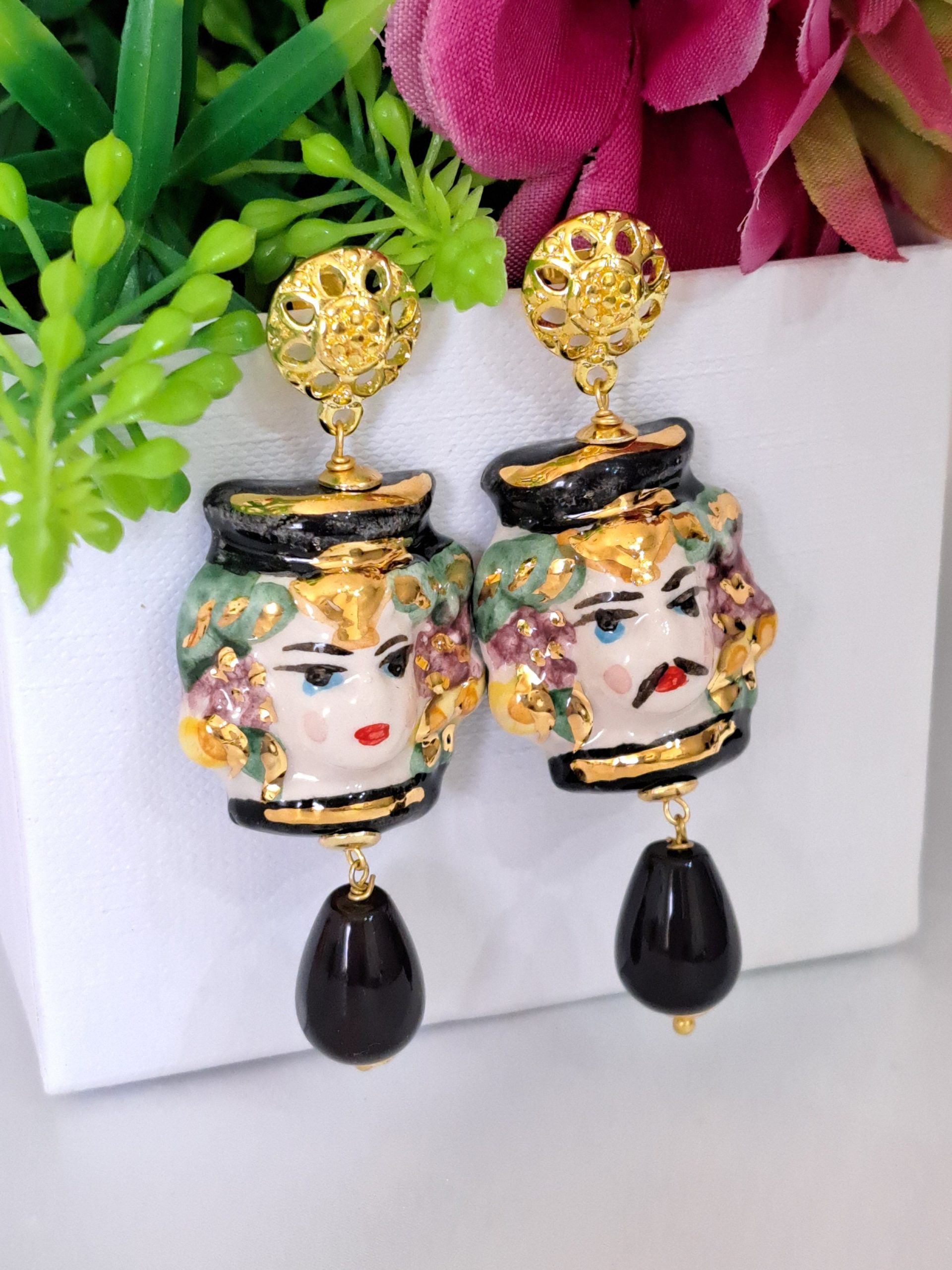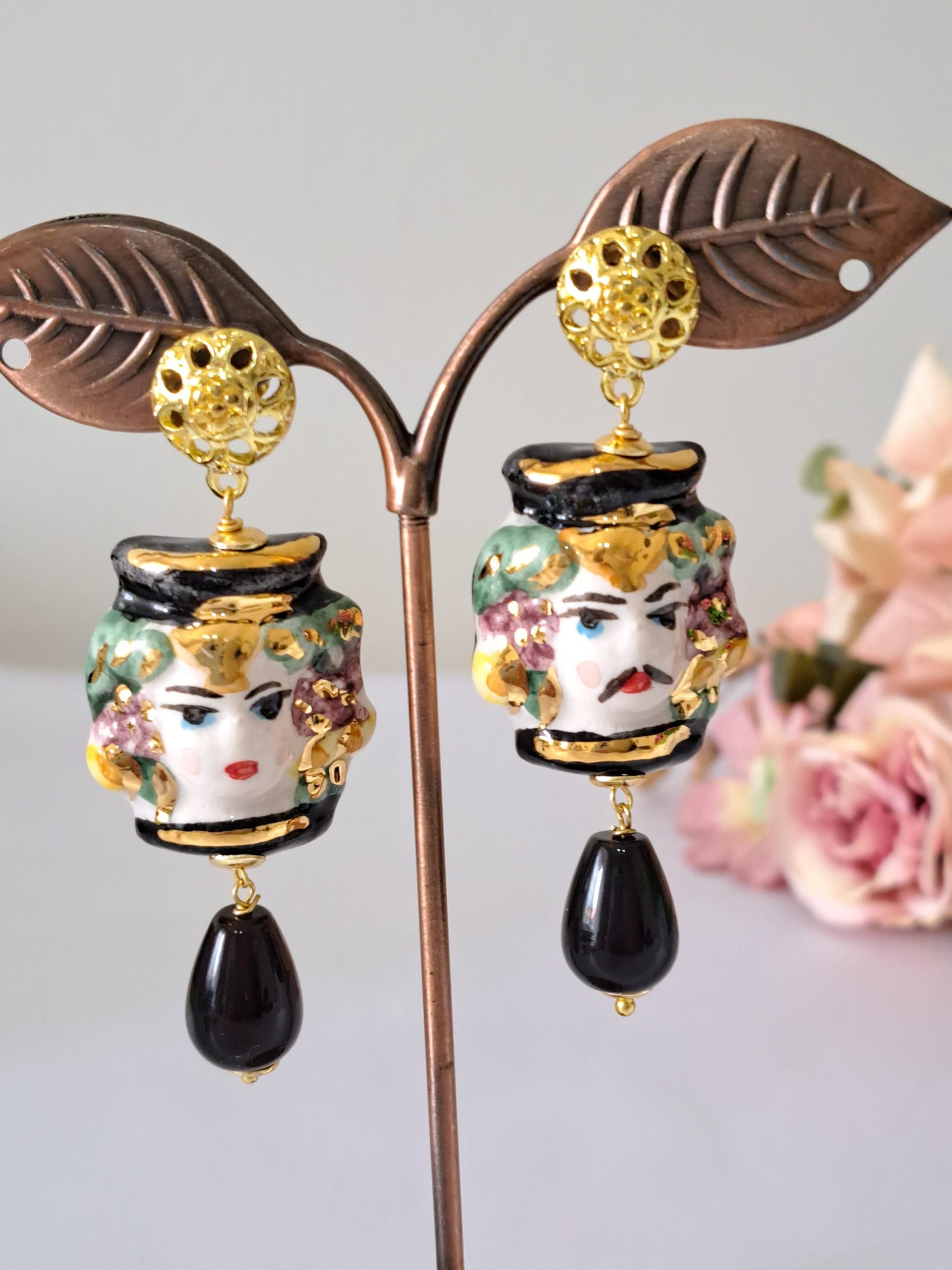 Orecchini ceramica Caltagirone , orecchini teste di moro con fiori smaltati, orecchini siciliani