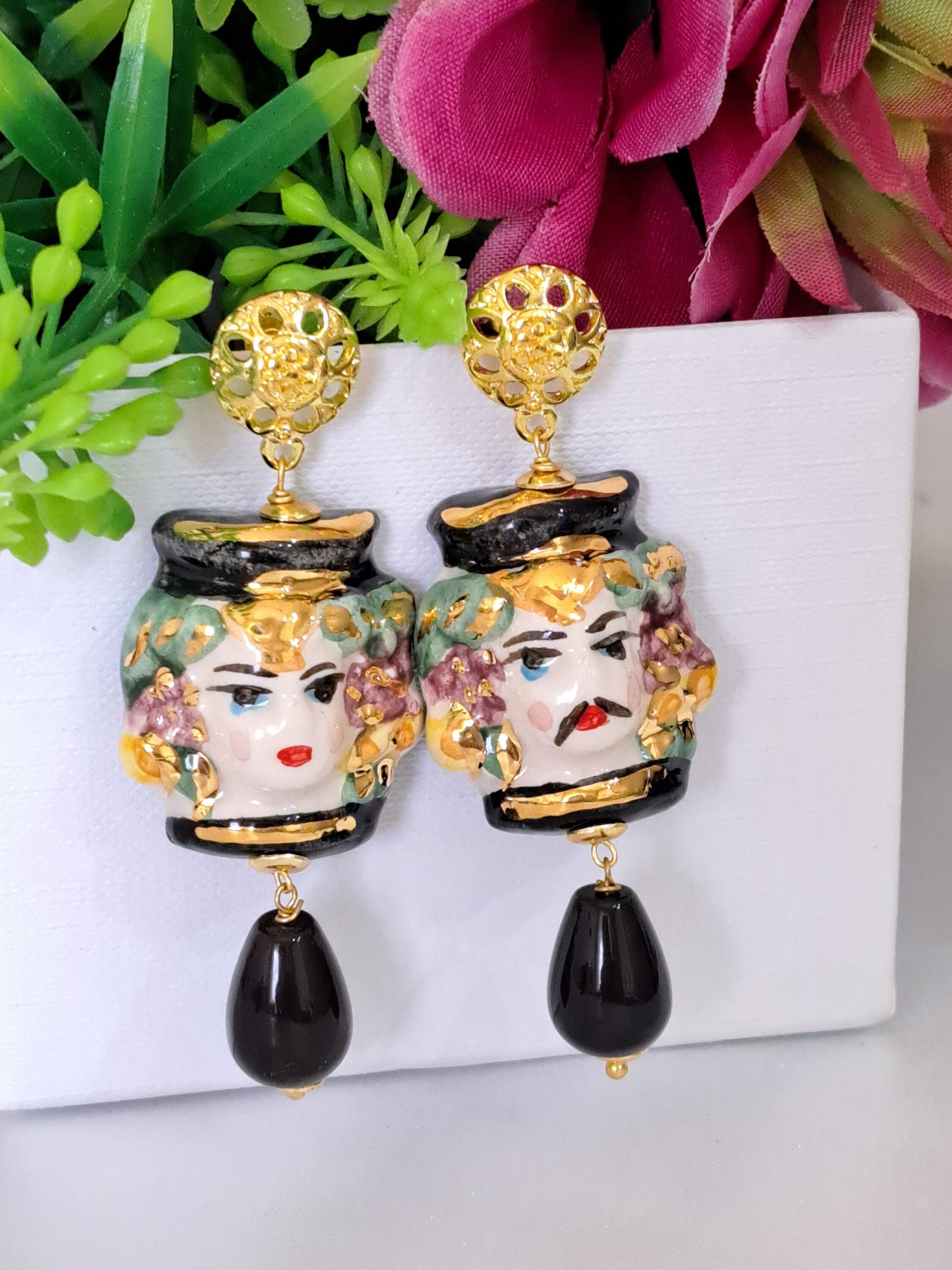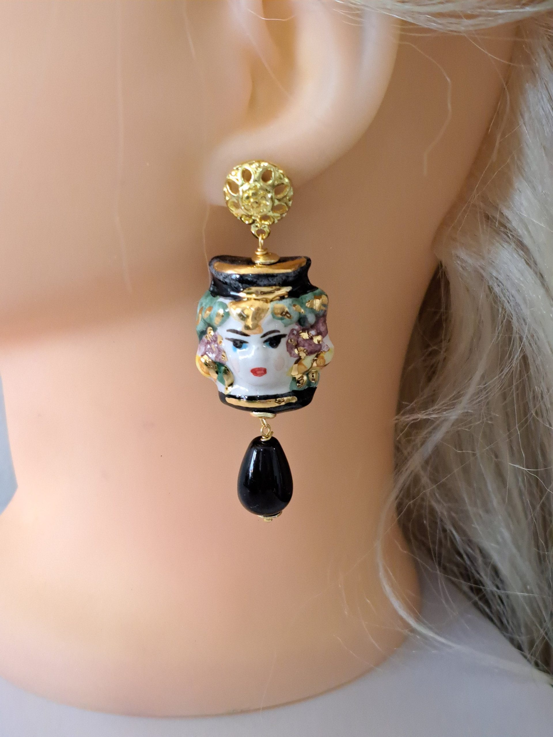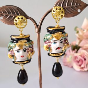 Orecchini teste di moro in ceramica Caltagirone, orecchini goccia pietre agata nera , orecchini siciliani