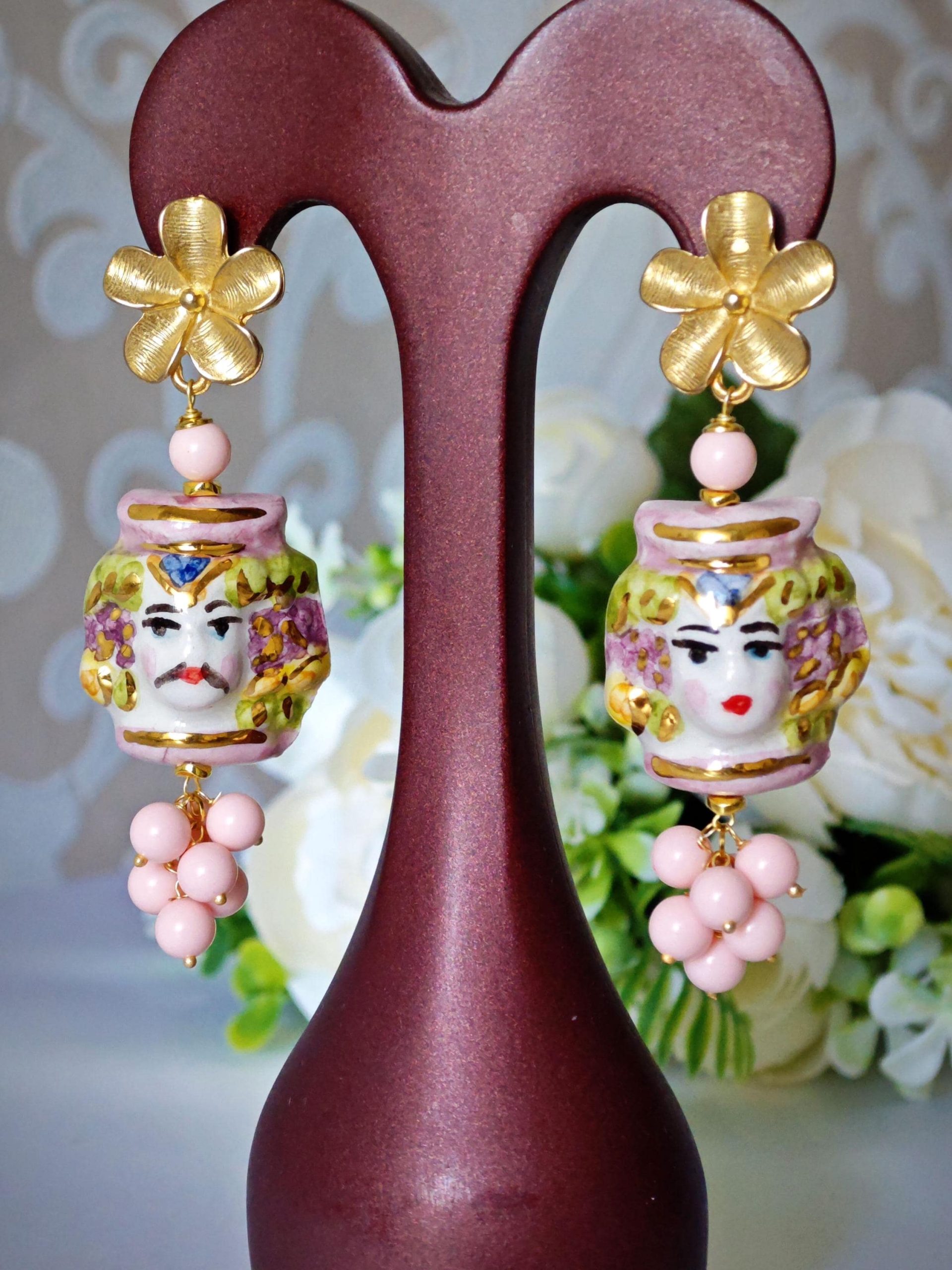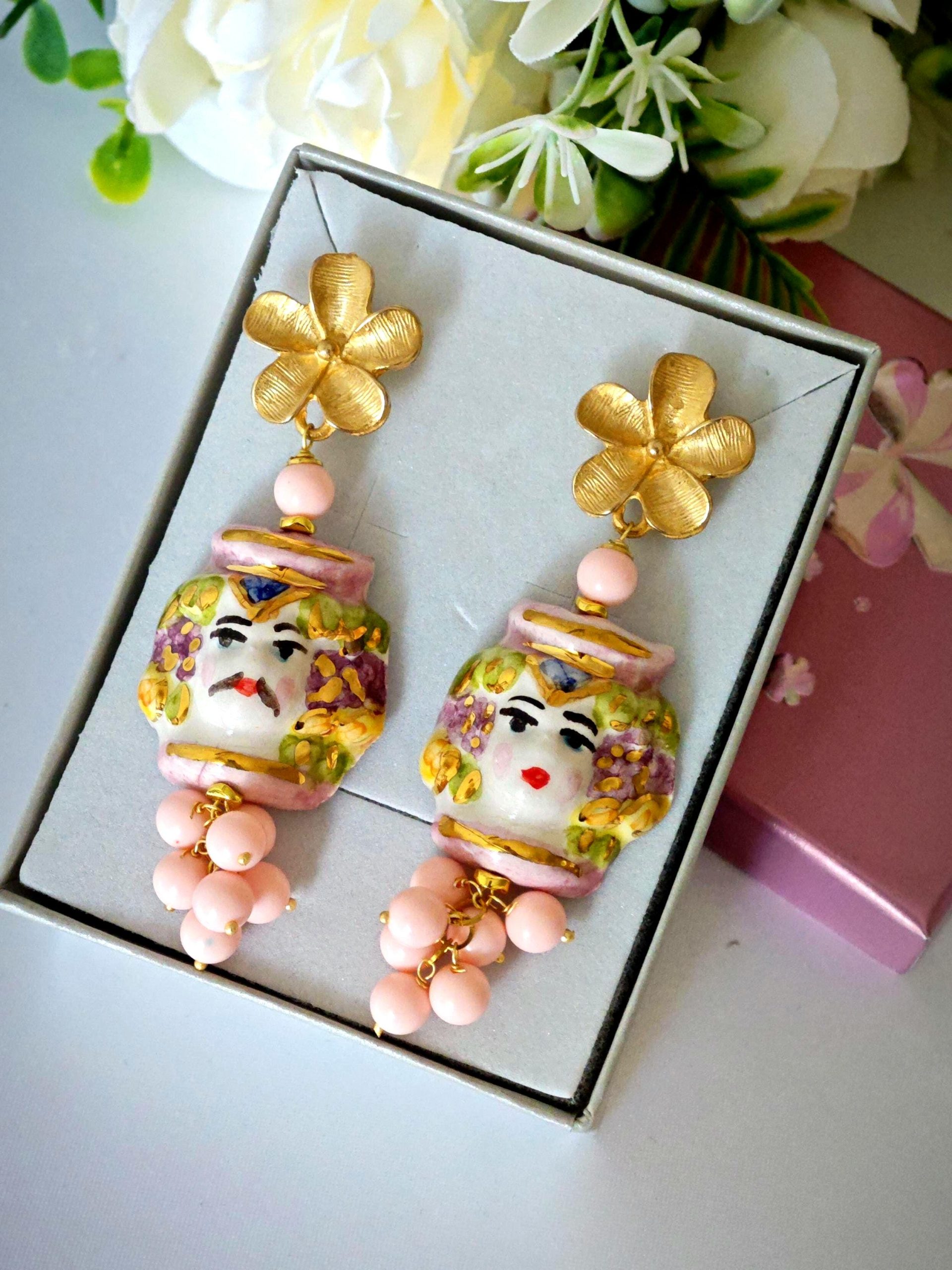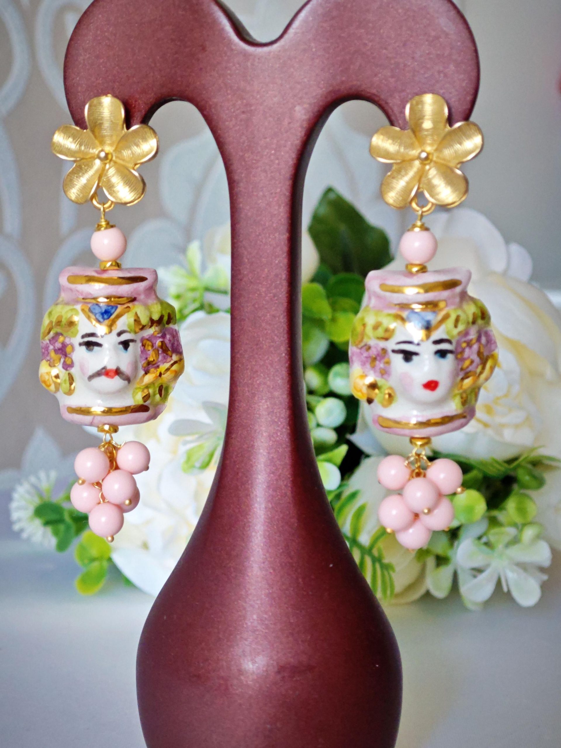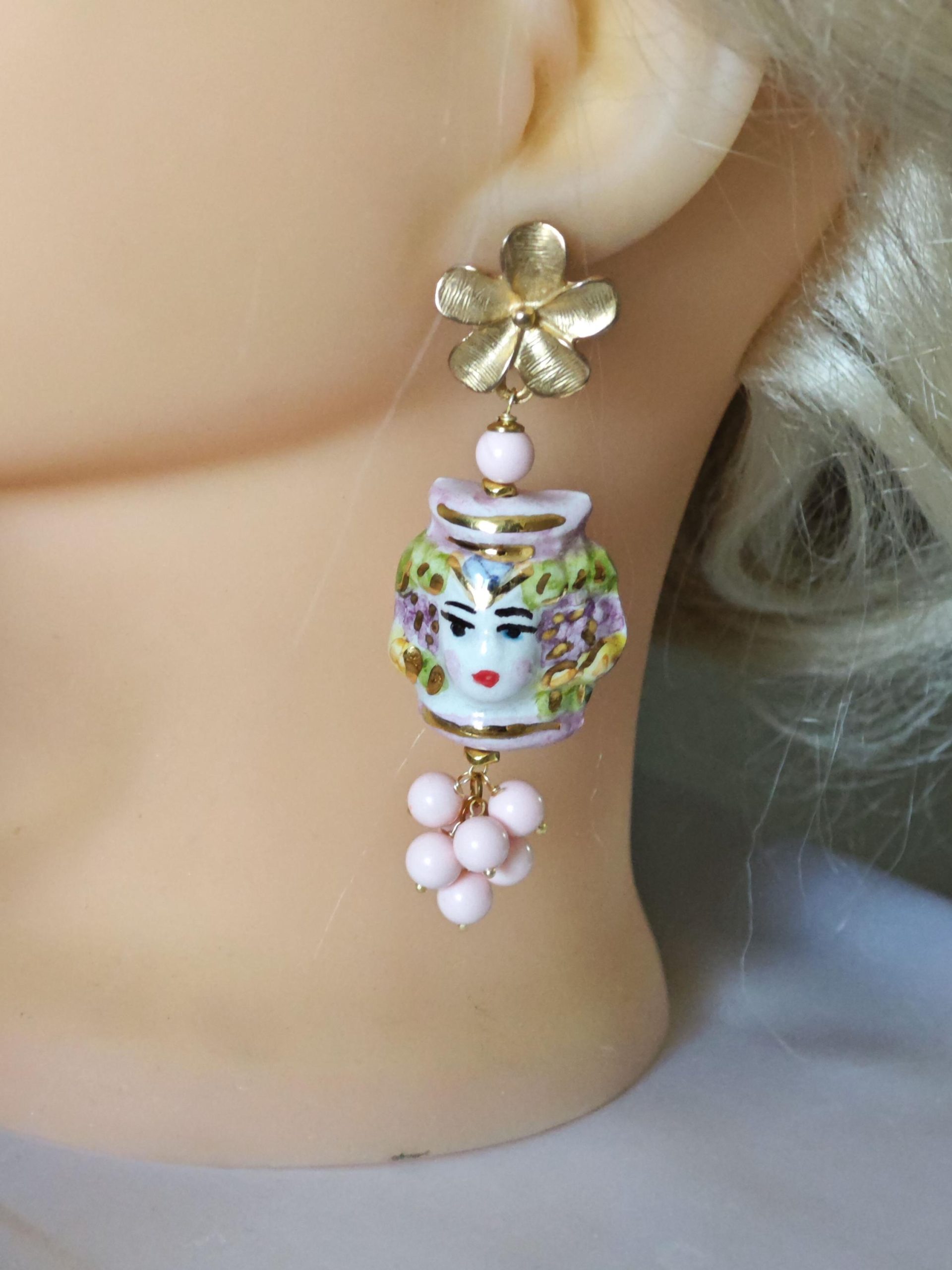 Orecchini con teste di moro in ceramica Caltagirone dipinta e realizzata a mano, con applicazioni foglia oro 22 kt, 3 cm dimensioni con grappolo perle pasta di corallo rosa imitazione ,