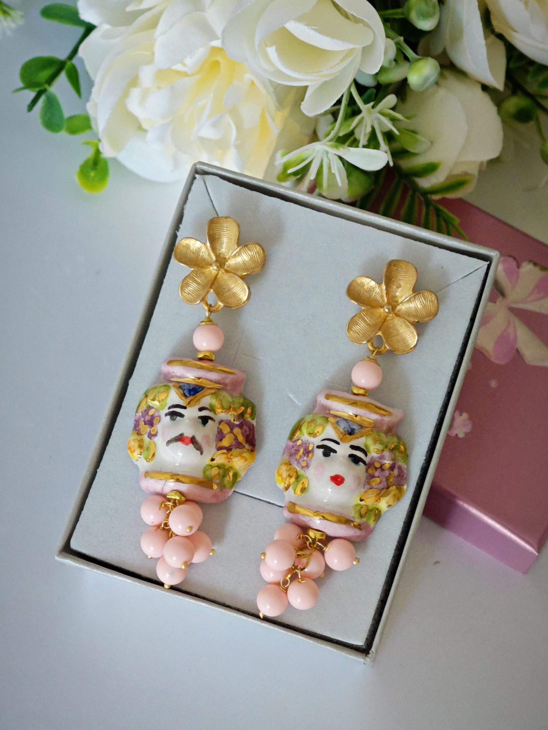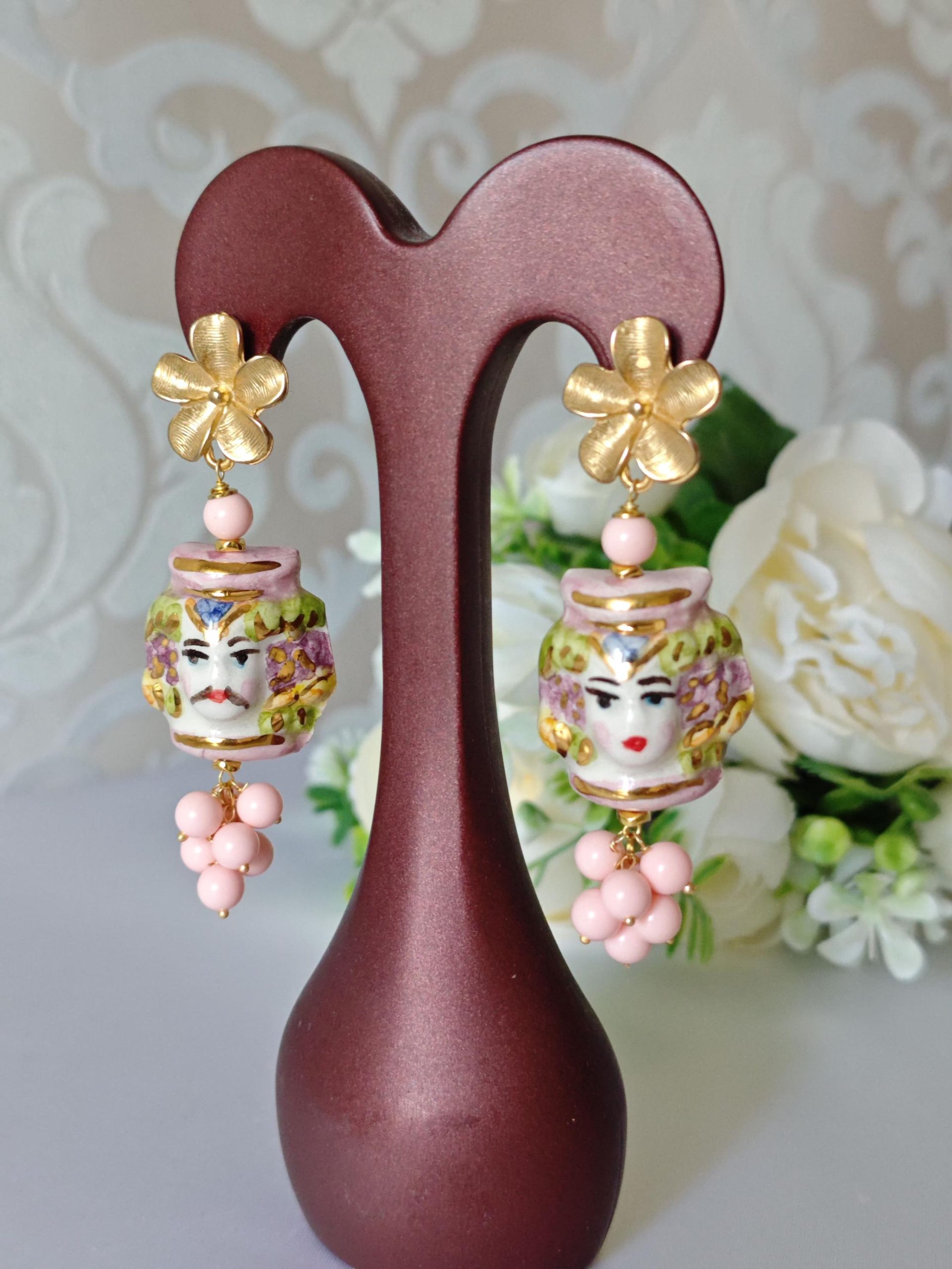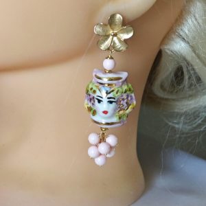 Orecchini ceramica Caltagirone, orecchini teste di moro con rose corallo bianco e gocce imitazione avorio , orecchini siciliani