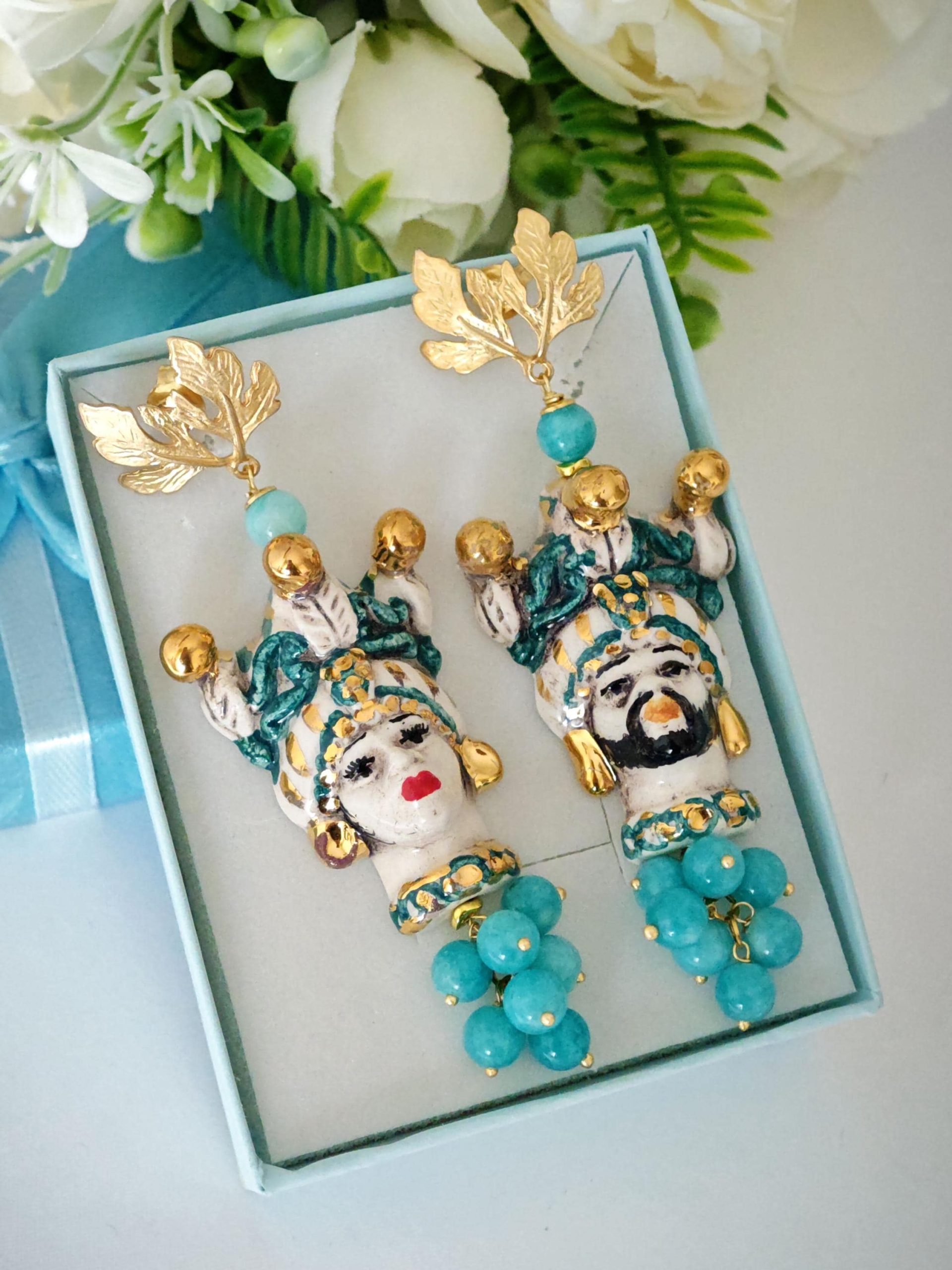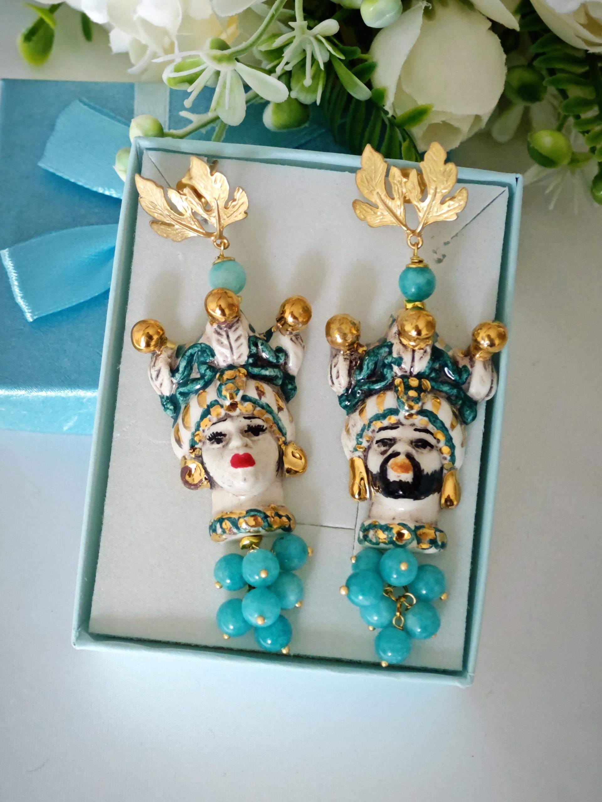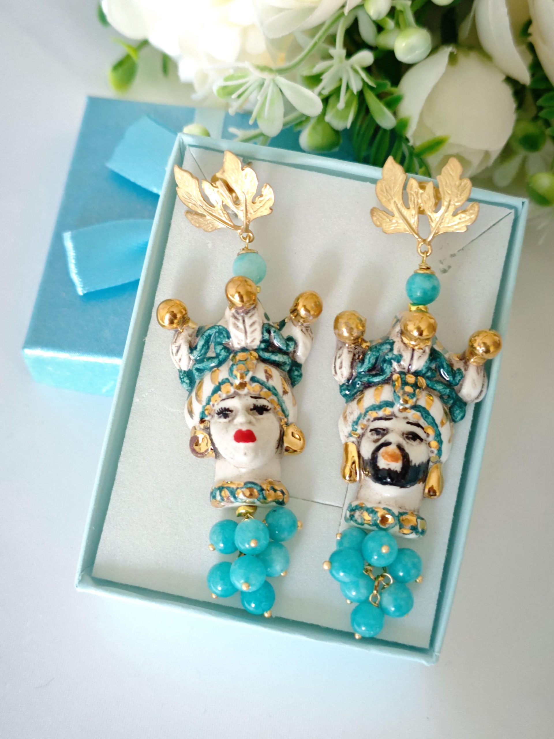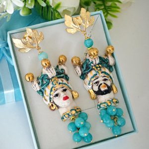 Orecchini teste di moro in ceramica di Caltagirone con grappolo pietre angelite blu, orecchini siciliani