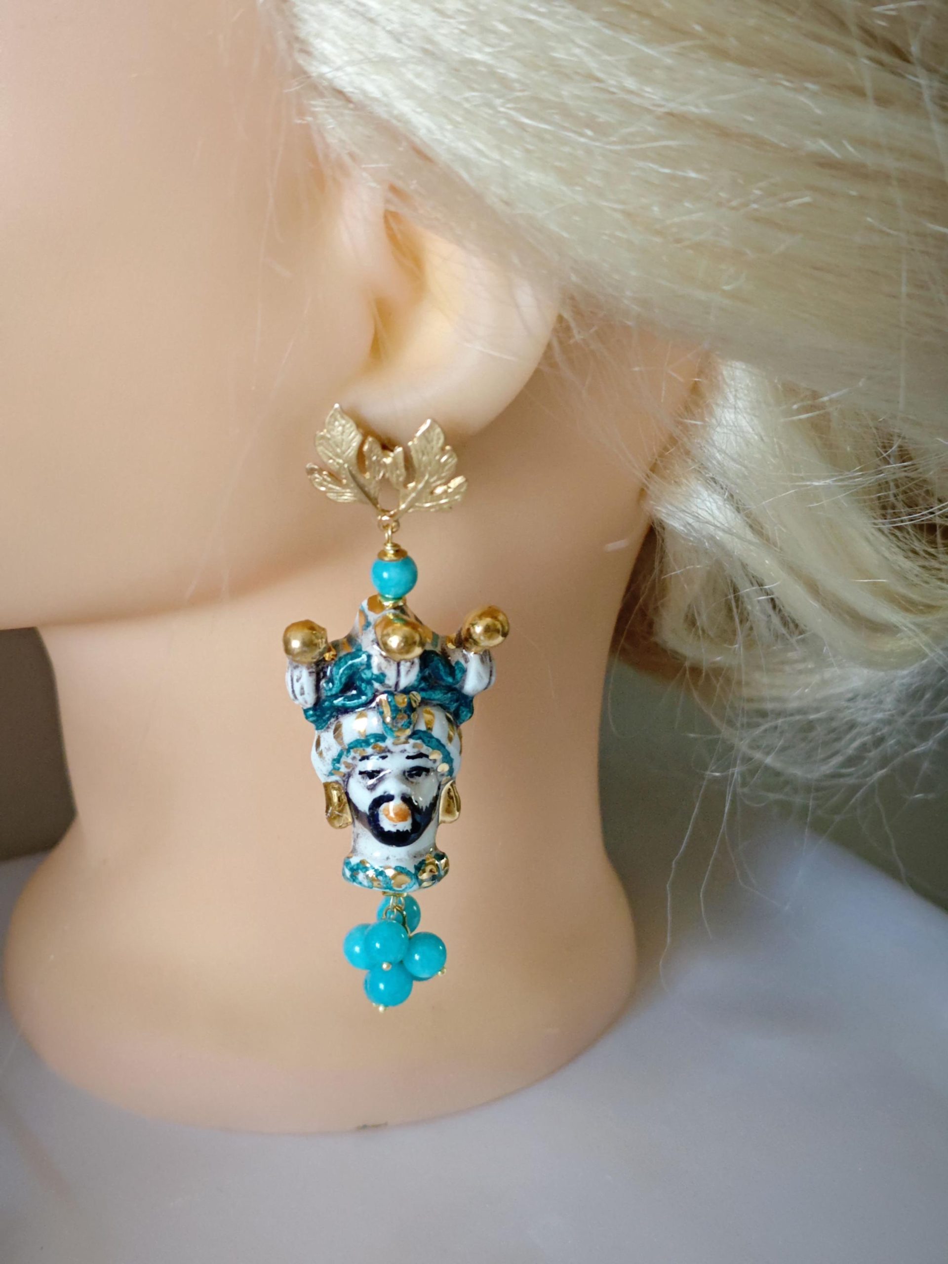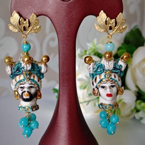 Orecchini pendenti con teste di moro in ceramica di Caltagirone realizzata e dipinta a mano con applicazioni foglia oro 22 kt, 4 cm dimensioni con grappolo pietre angelite blu e chiusura a perno con farfallina in ottone satinato .