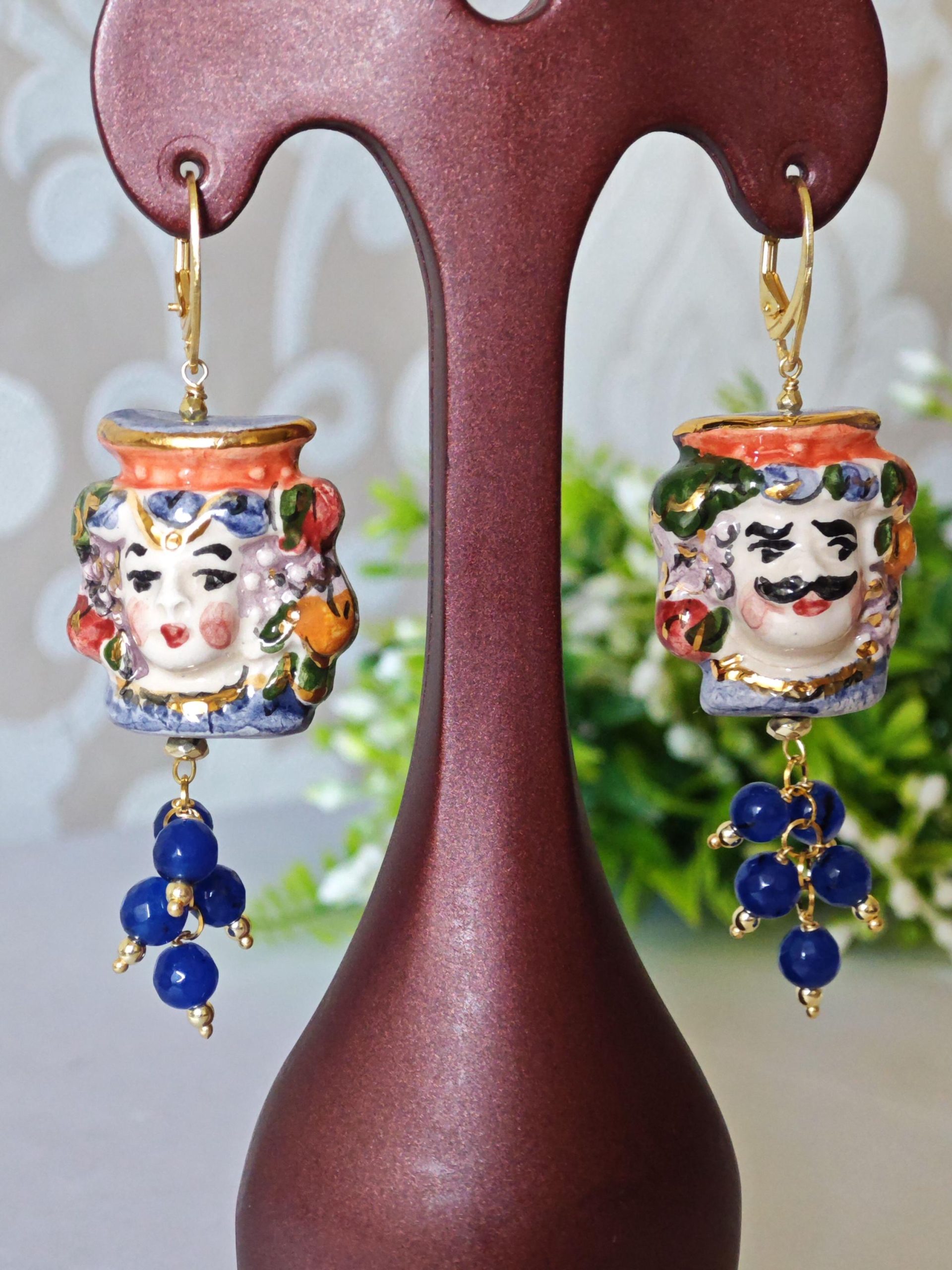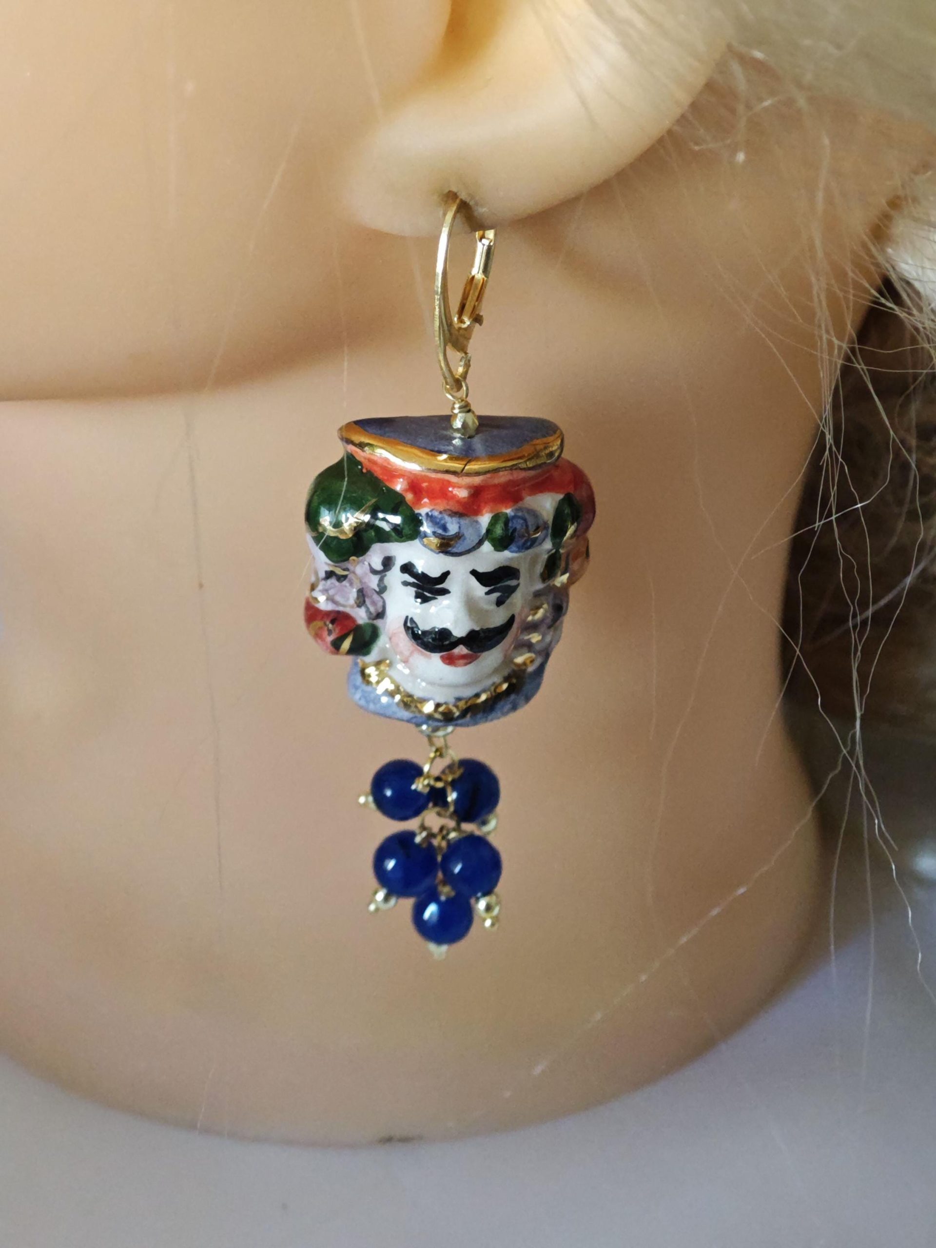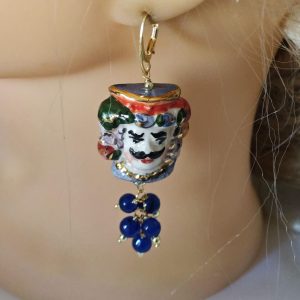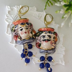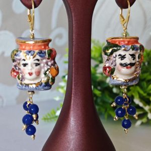 Orecchini pendenti con teste di moro in ceramica di Caltagirone realizzata e dipinta a mano con applicazioni foglia d’oro 22 kt, 3 cm dimensioni, grappolo pietre dure agata blu.