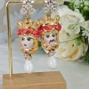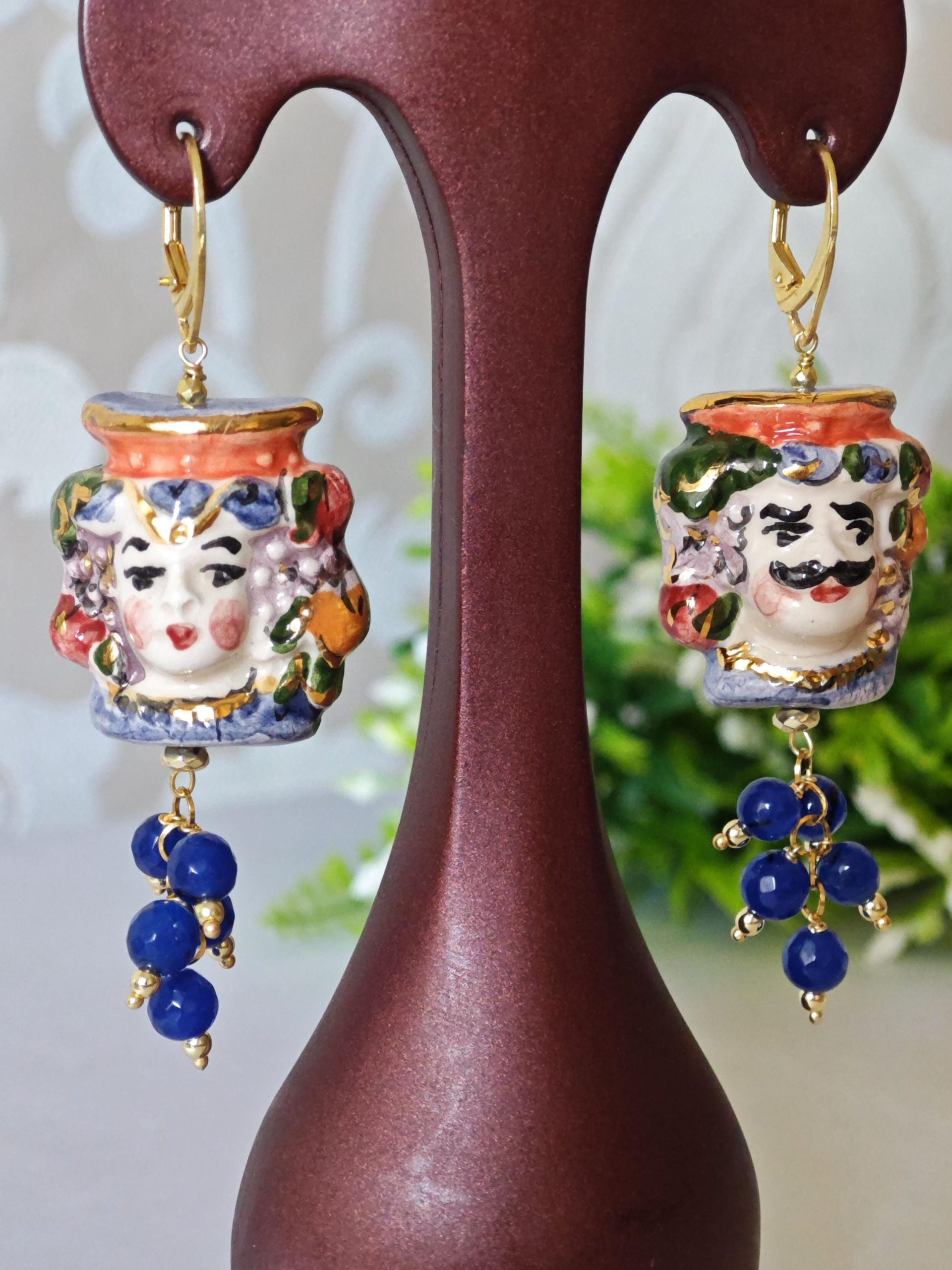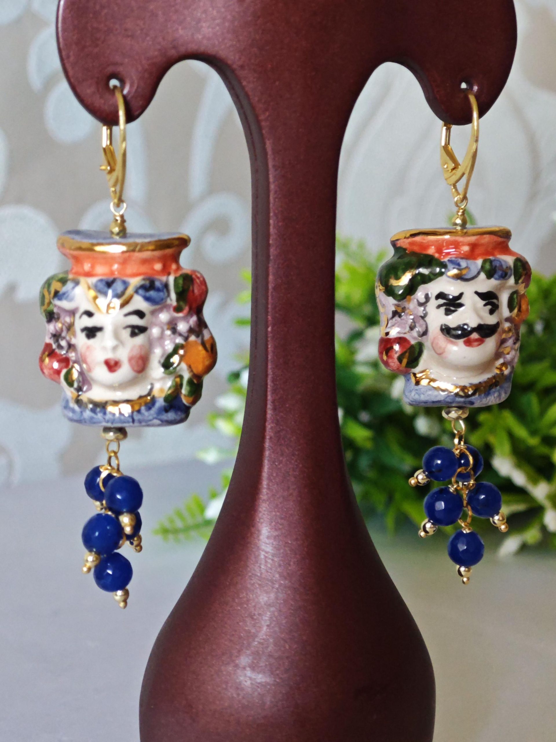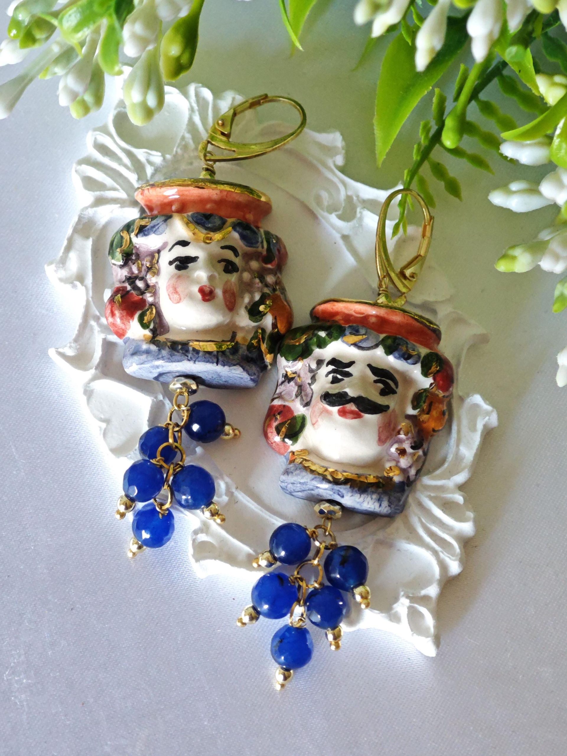 Orecchini pendenti con teste di moro in ceramica di Caltagirone realizzata e dipinta a mano con applicazioni foglia d’oro 22 kt, 3 cm dimensioni, grappolo pietre dure agata blu.
