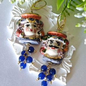 Orecchini teste di moro in ceramica di Caltagirone, orecchini grappolo pietre agata blu, orecchini siciliani