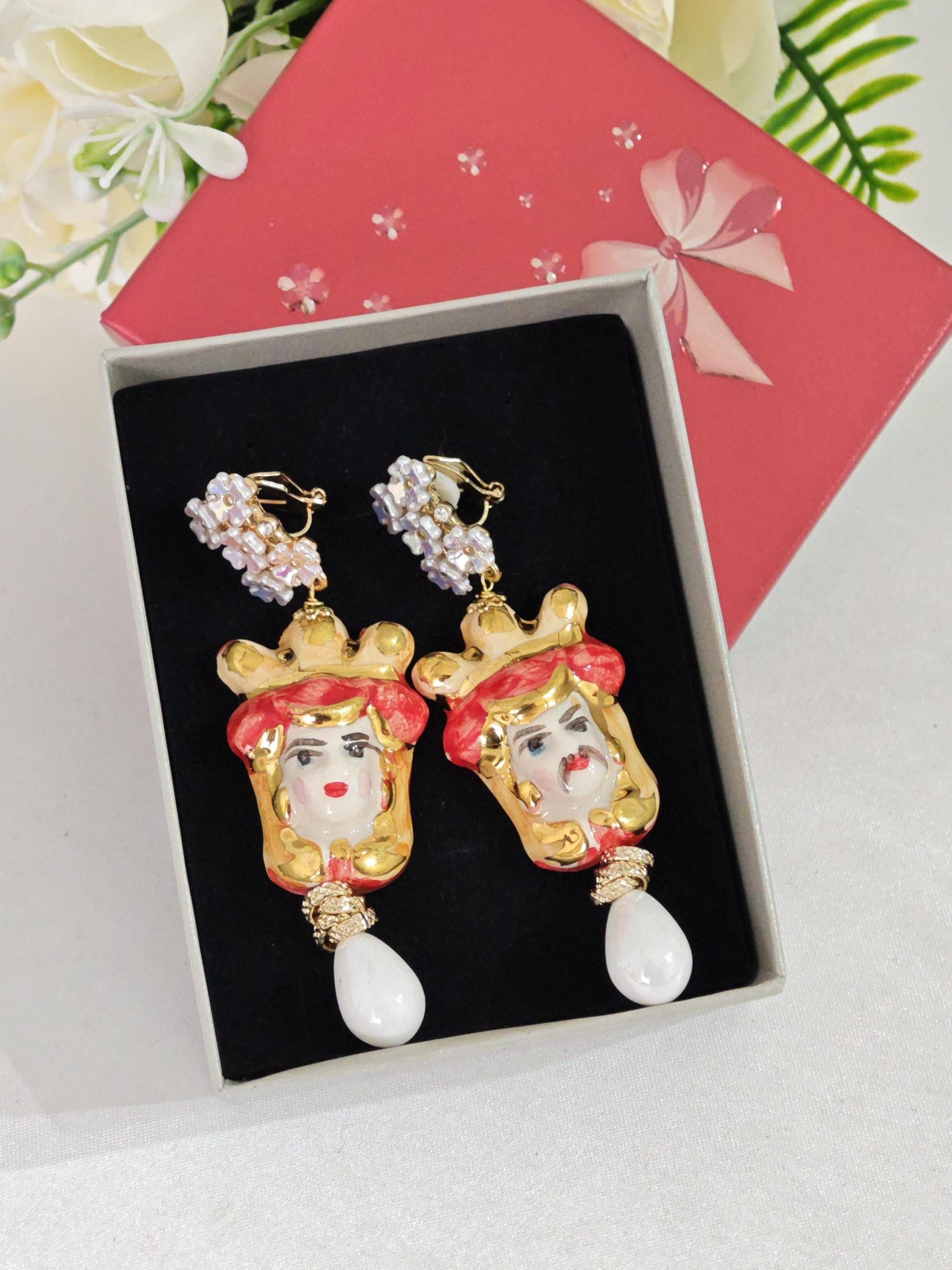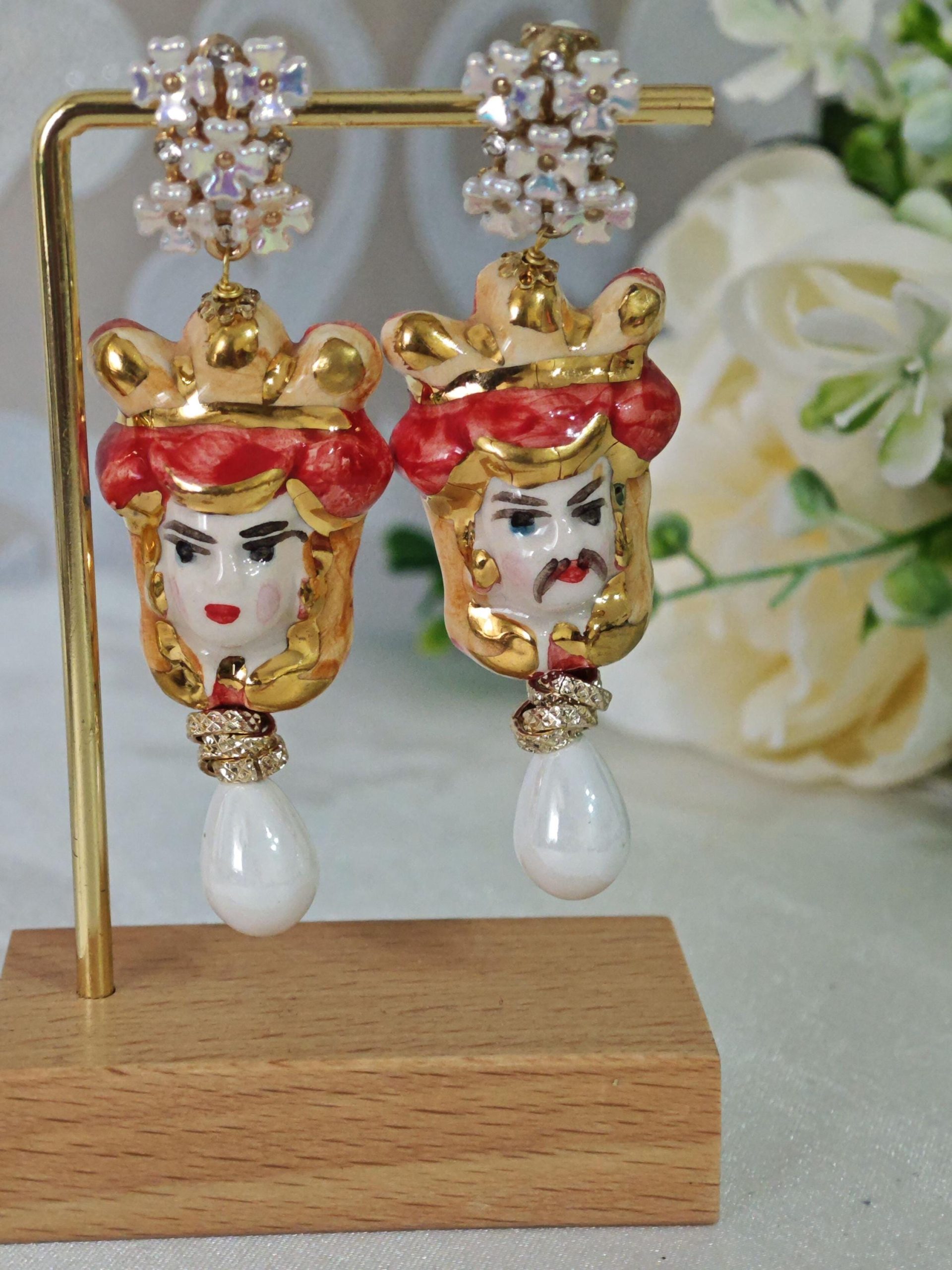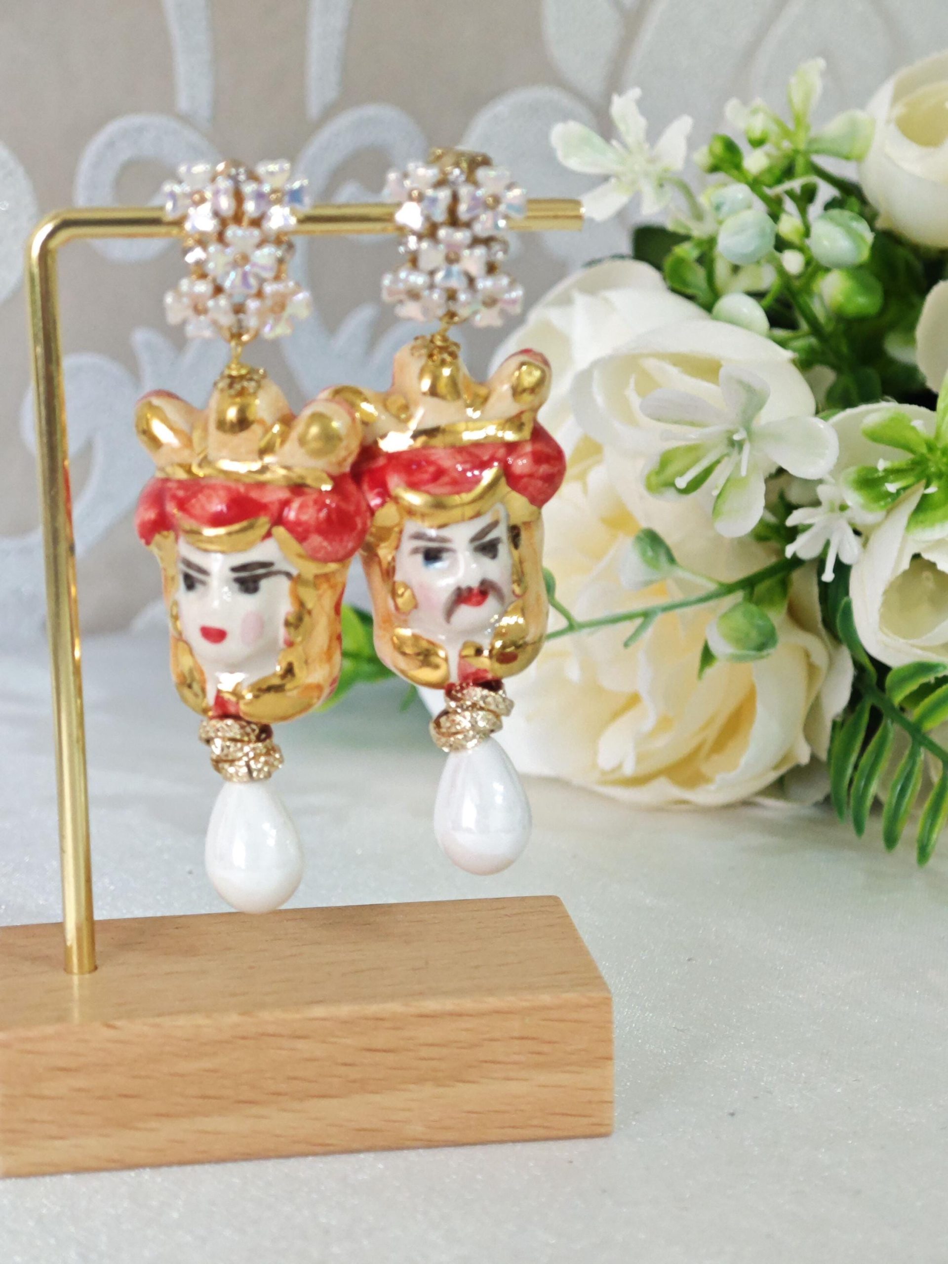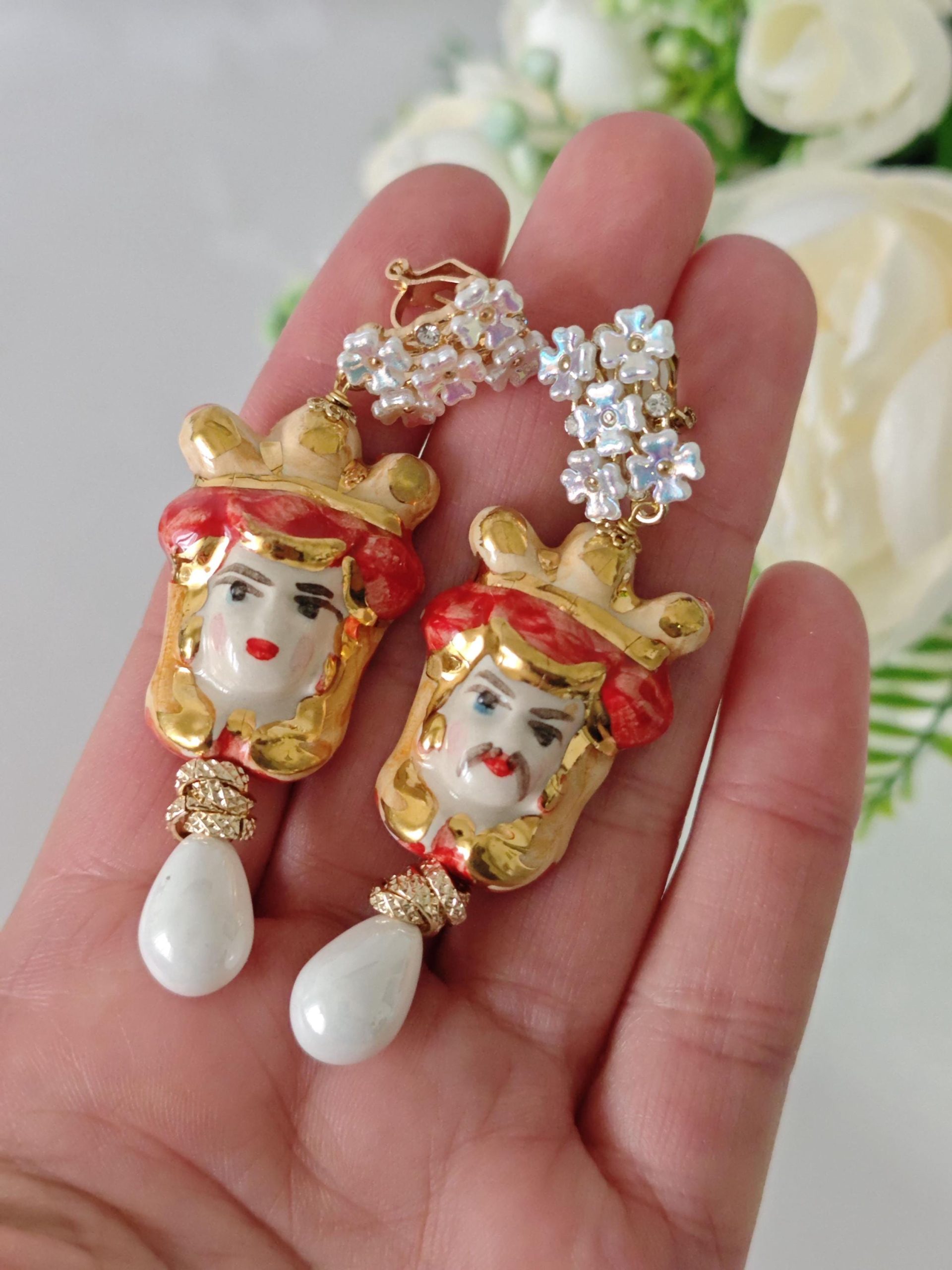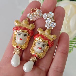 Orecchini ceramica Caltagirone, orecchini teste di moro con rose corallo bianco e gocce imitazione avorio , orecchini siciliani