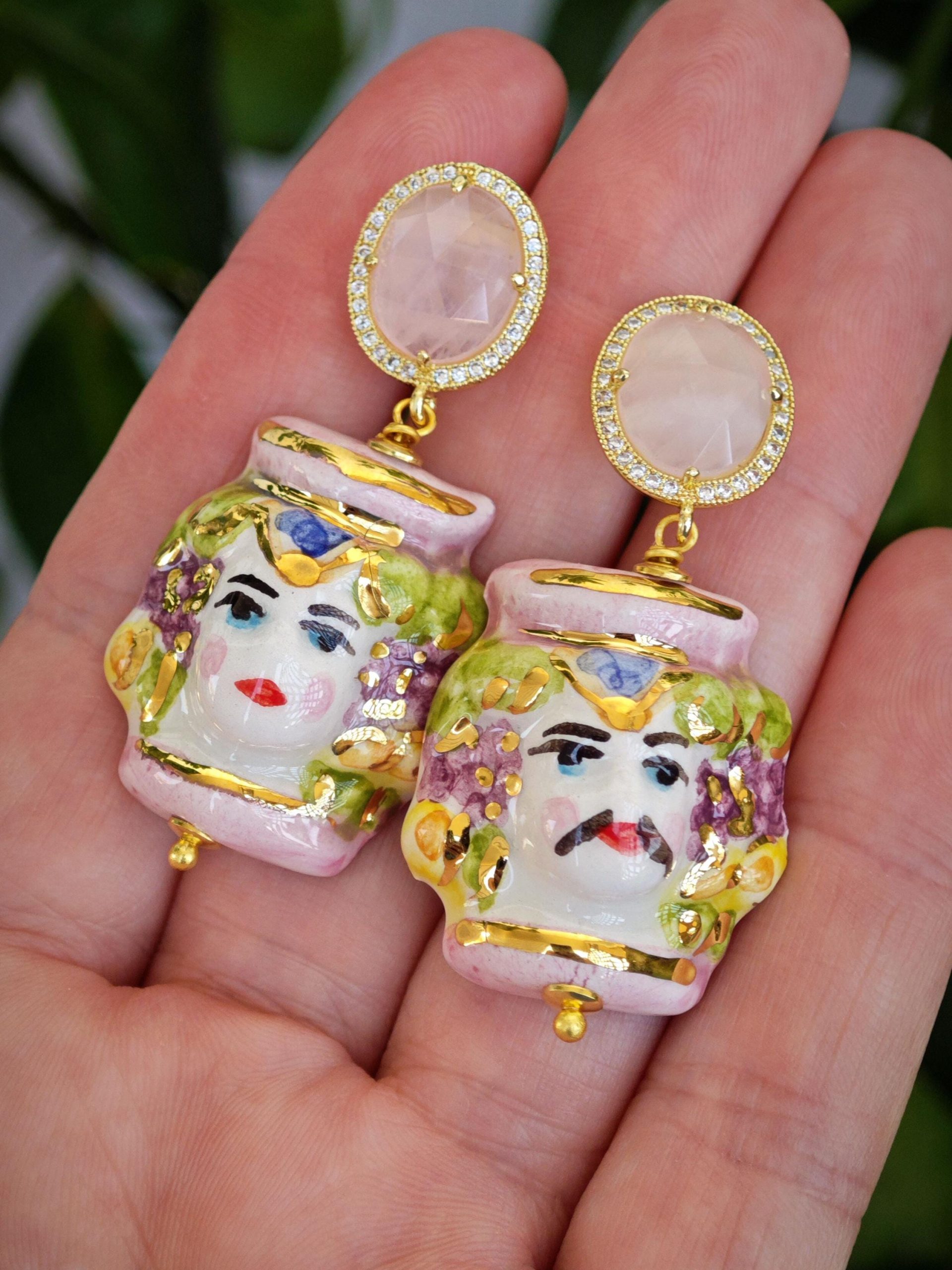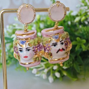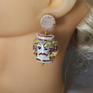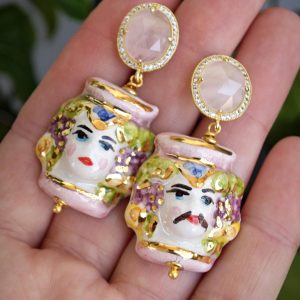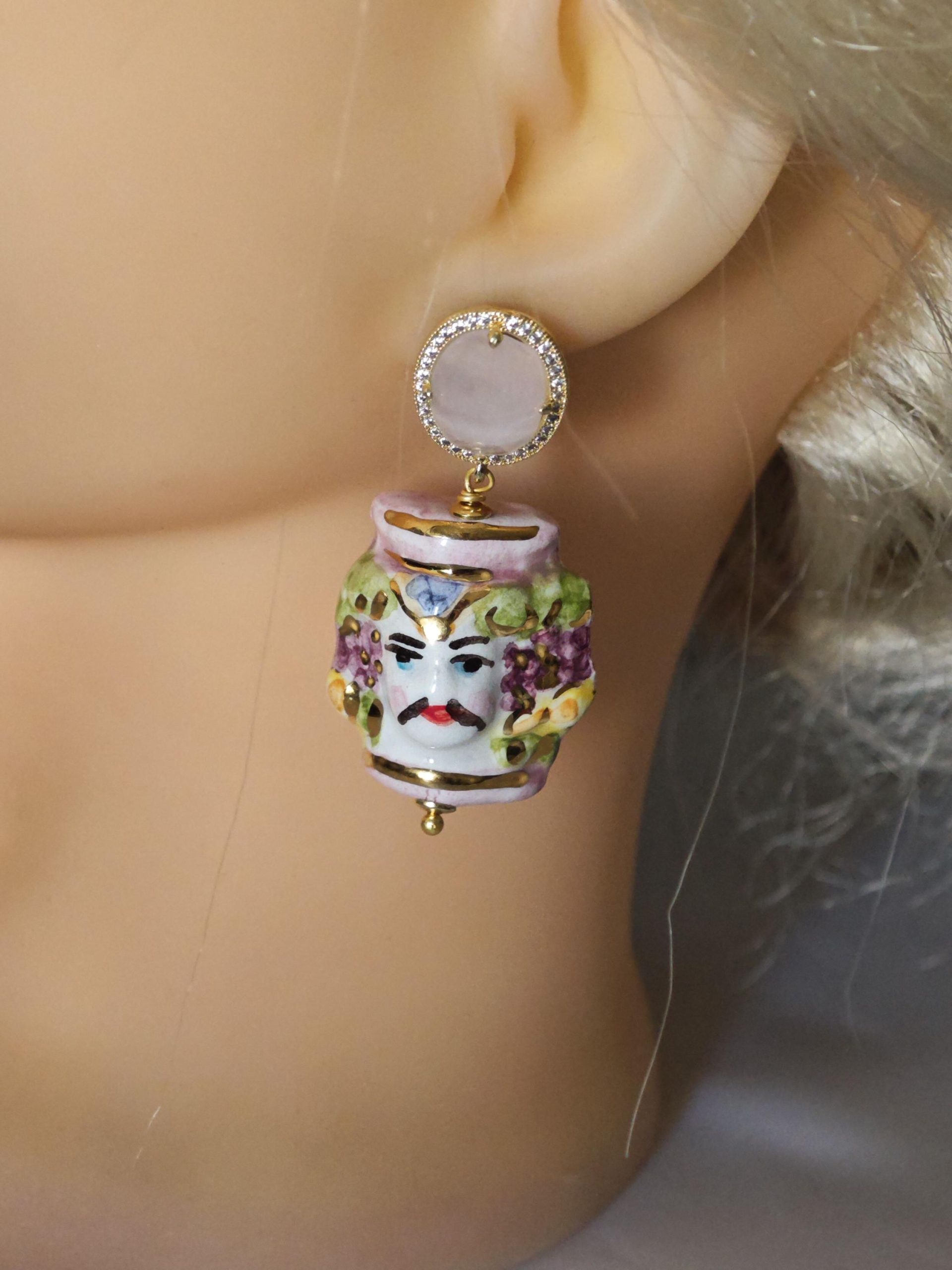 Orecchini teste moro ceramica di Caltagirone con pietre quarzo rosa , orecchini siciliani