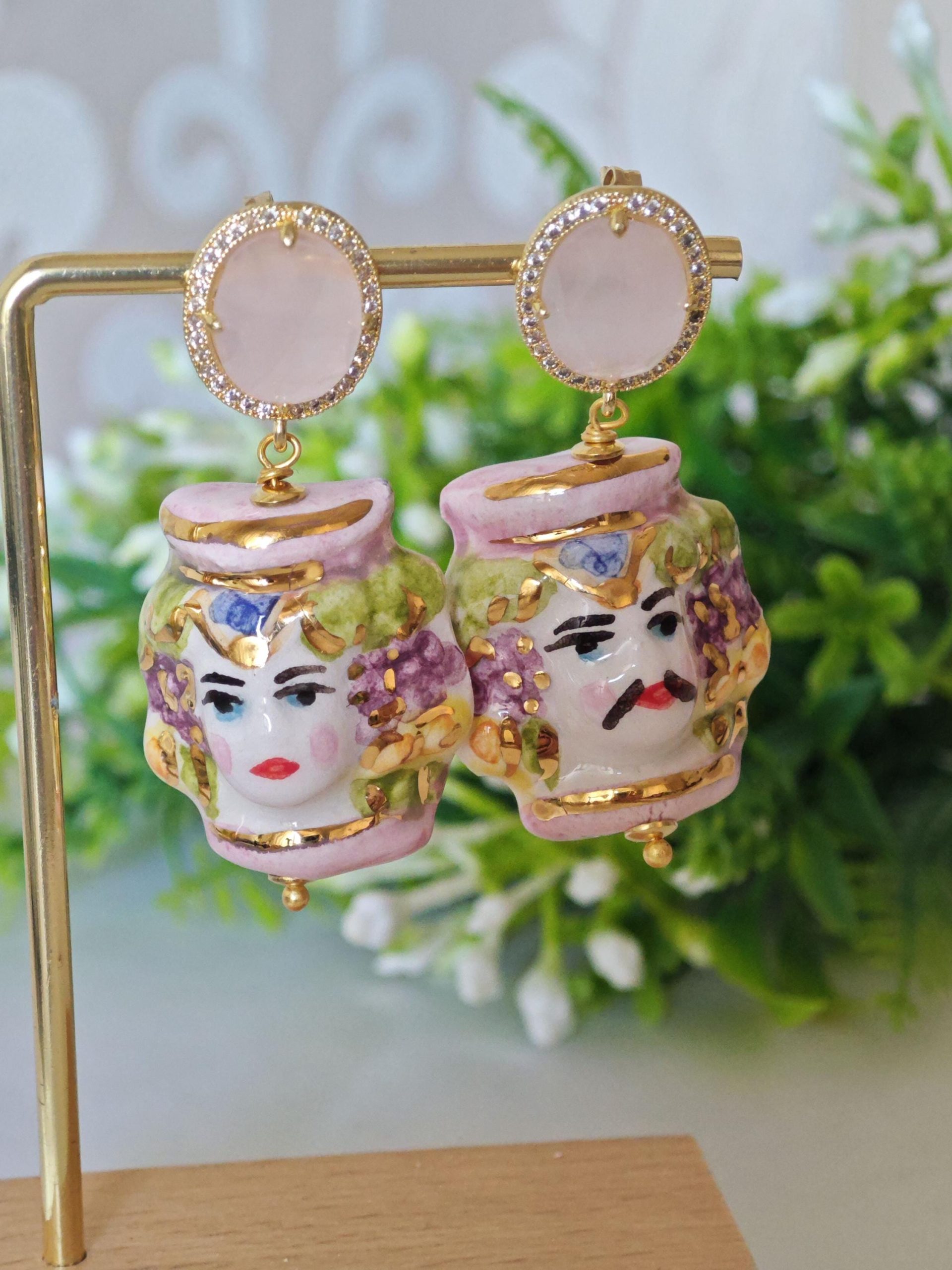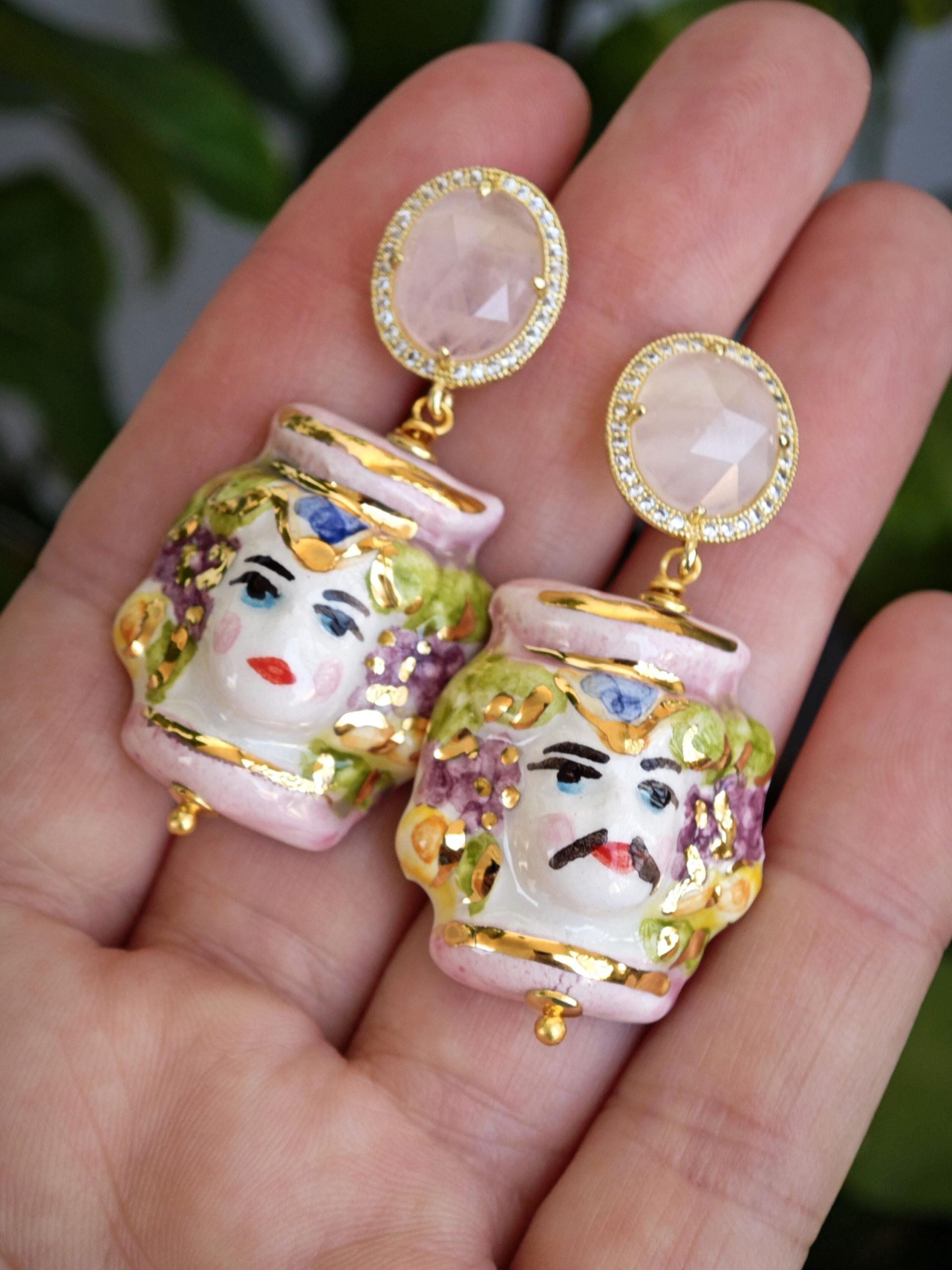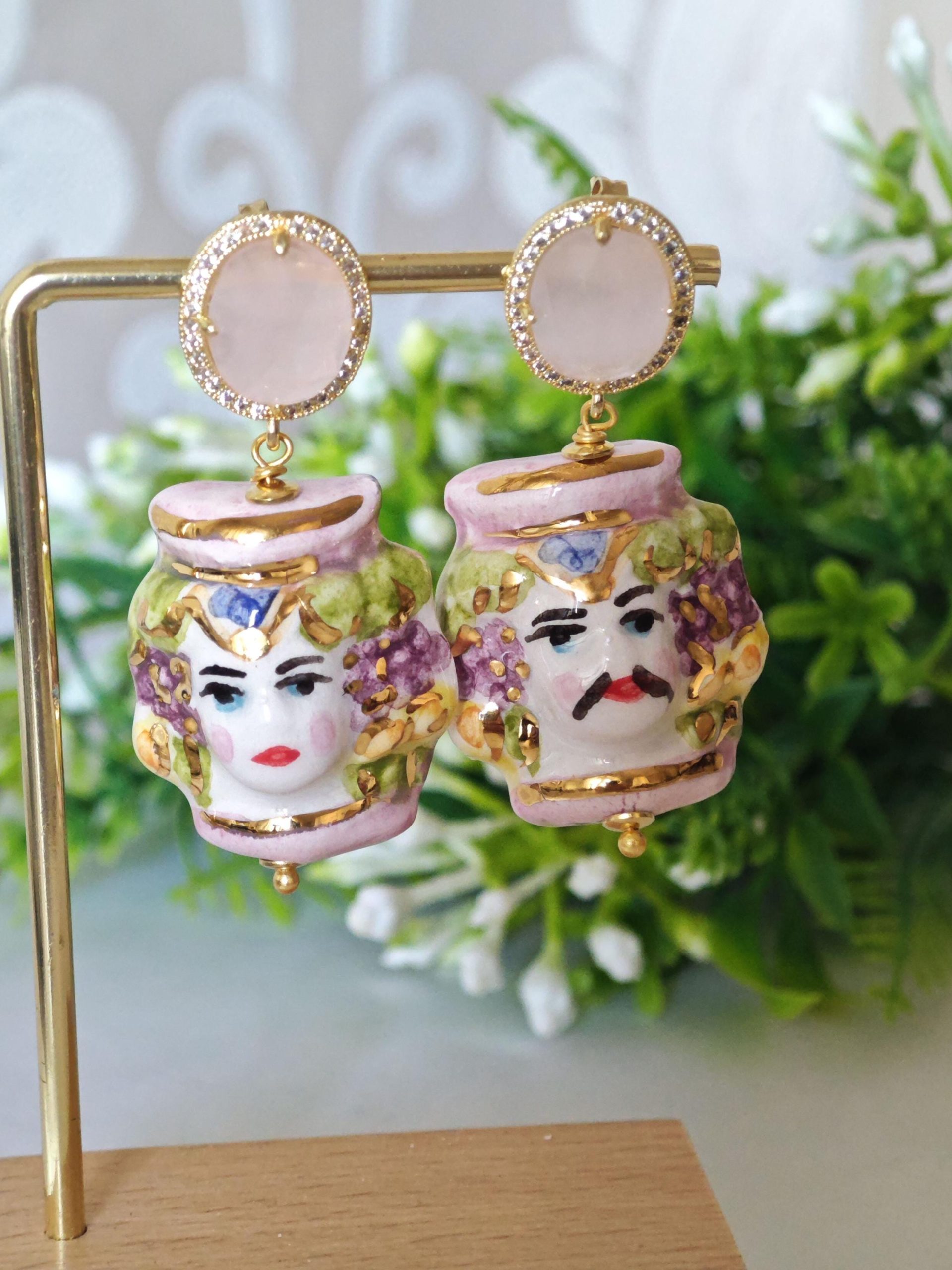 Orecchini teste moro ceramica di Caltagirone con pietre quarzo rosa , orecchini siciliani