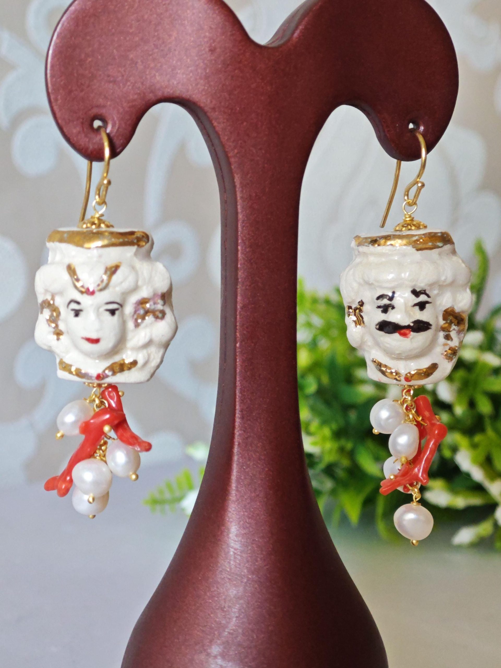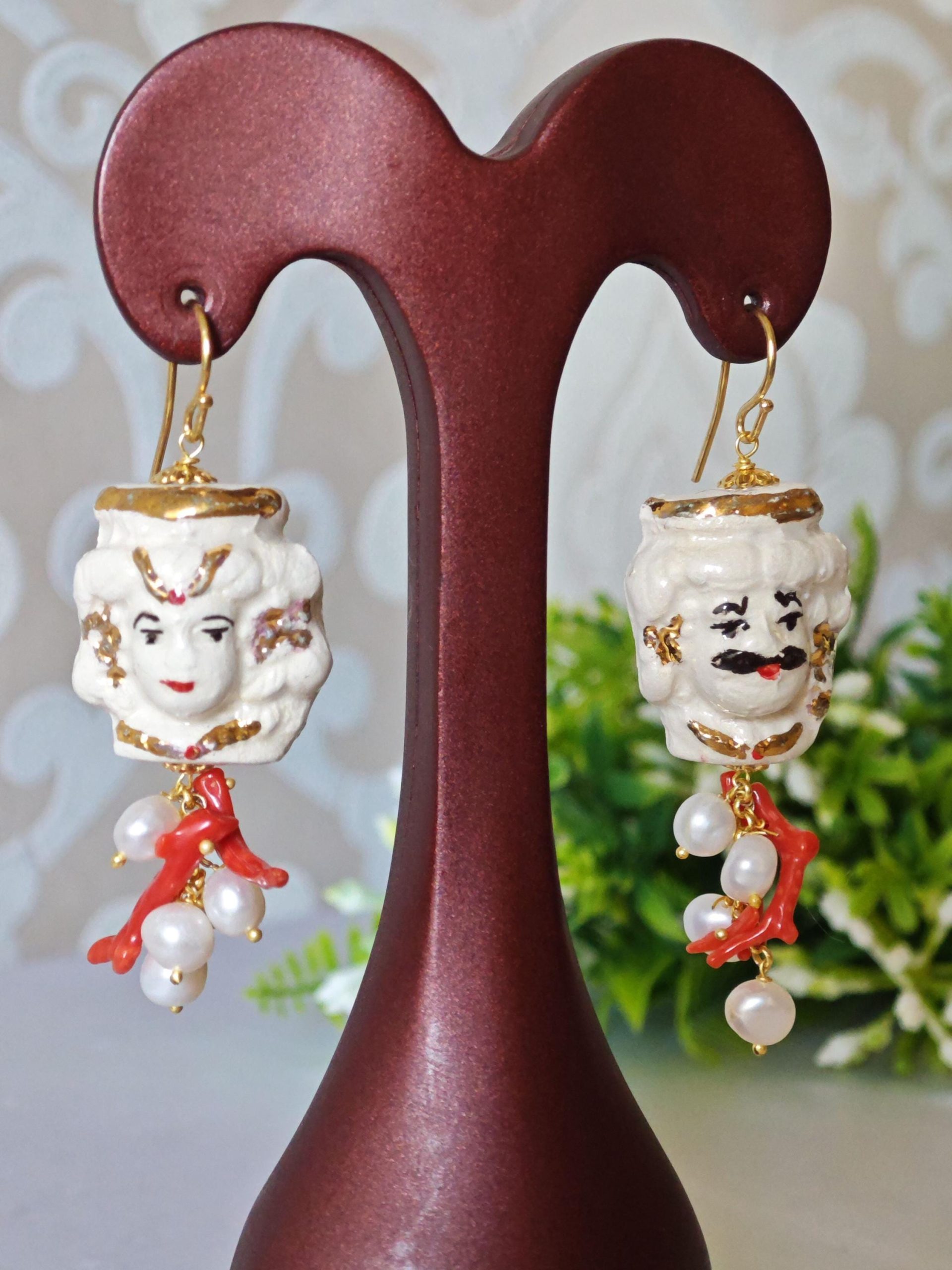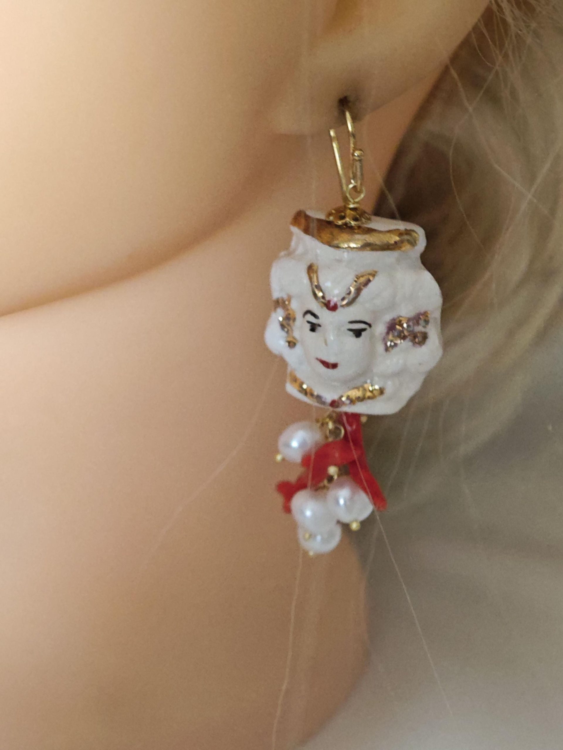 Orecchini con teste di moro in ceramica Caltagirone dipinta e realizzata a mano, con applicazioni foglia oro 22 kt, 3 cm dimensioni con grappolo perle bianche naturali e rametti corallo rosso naturale mediterraneo.