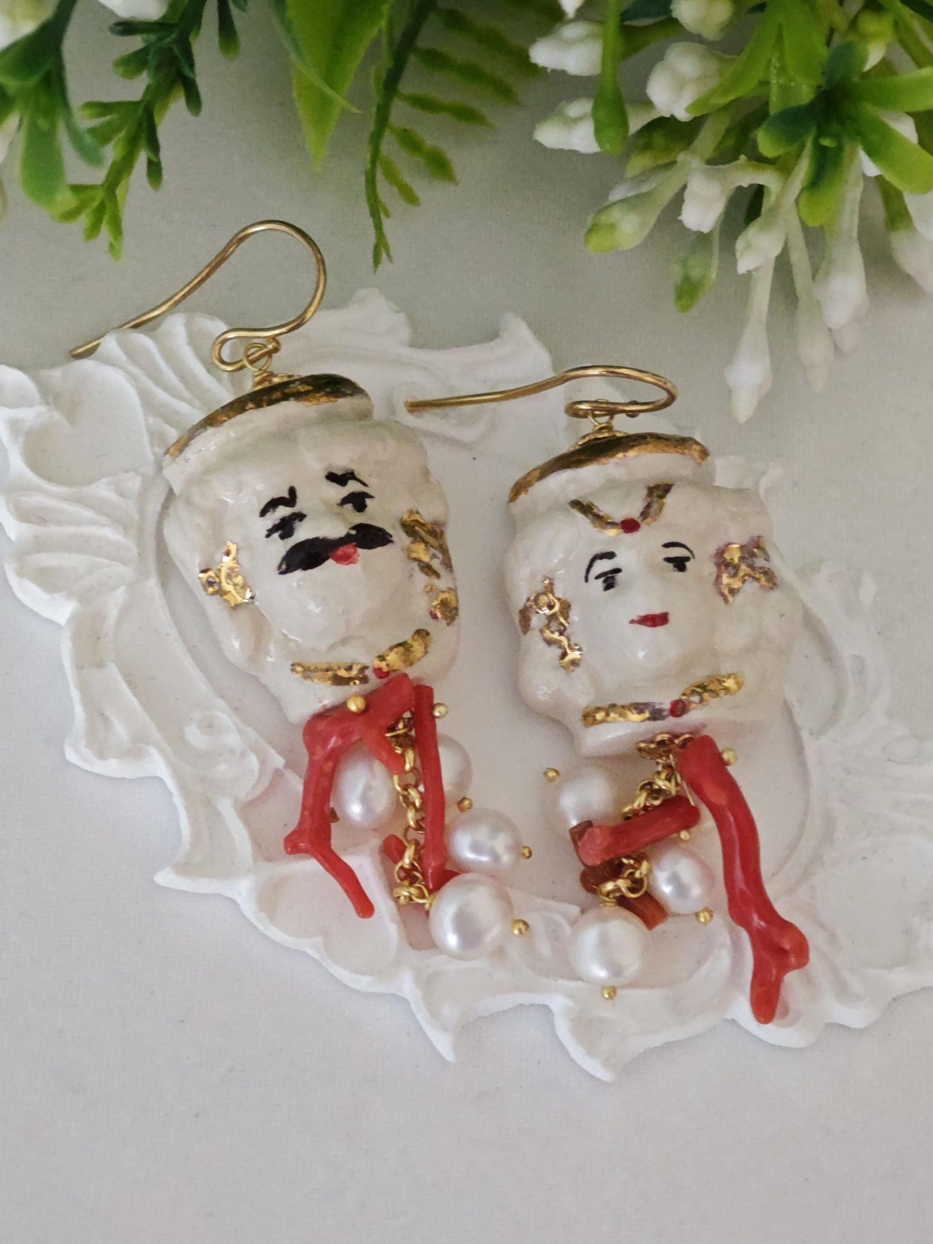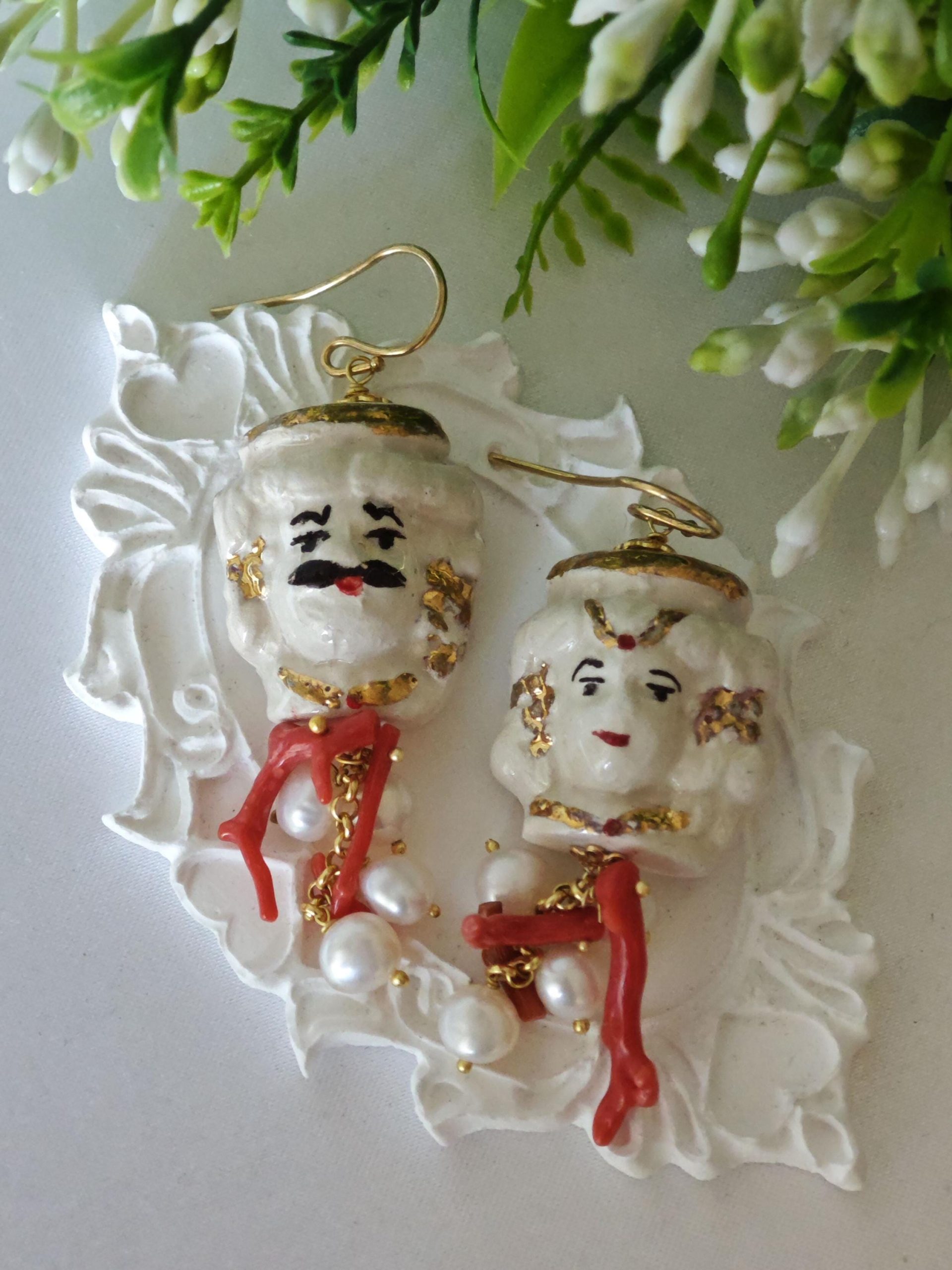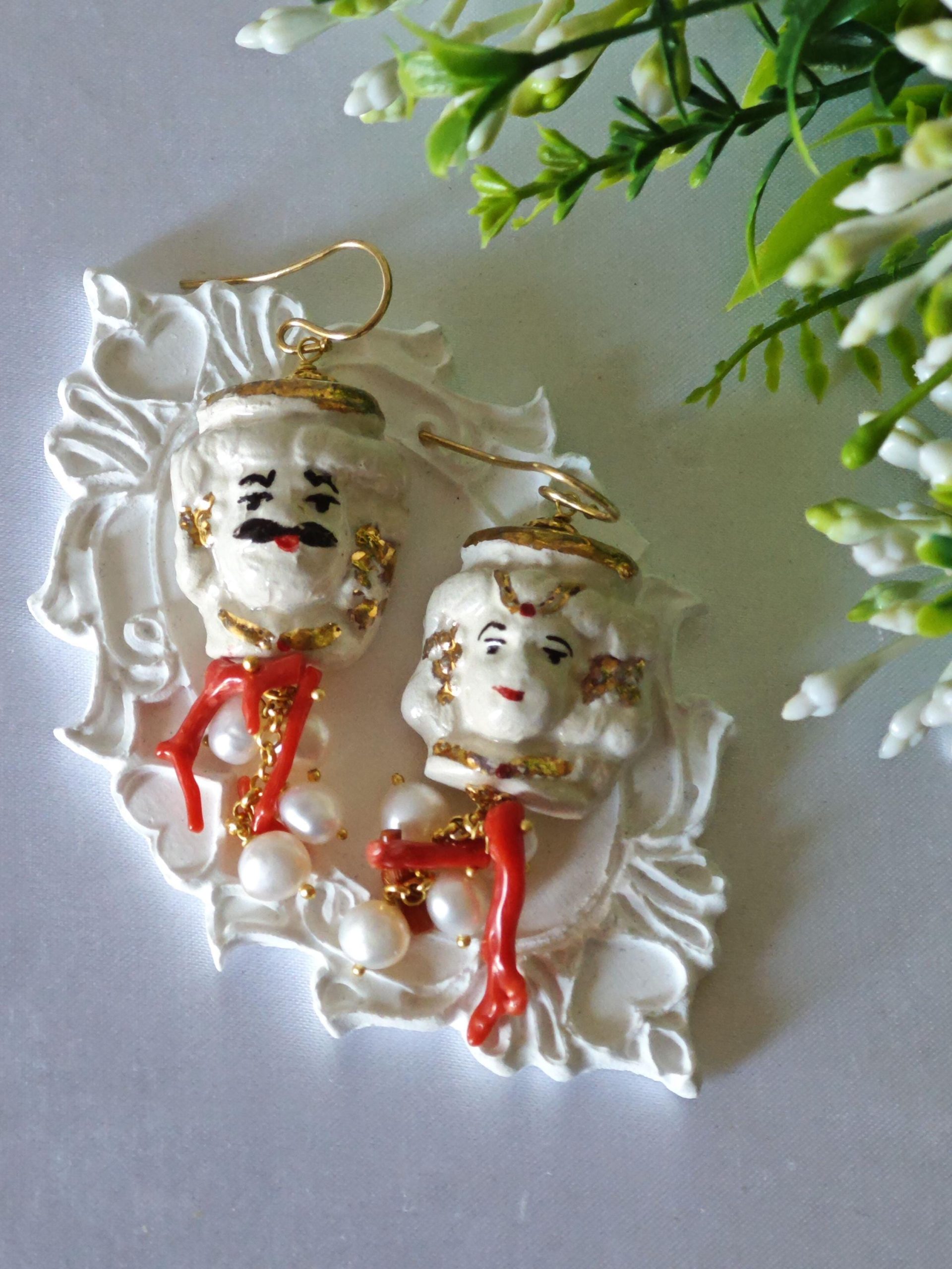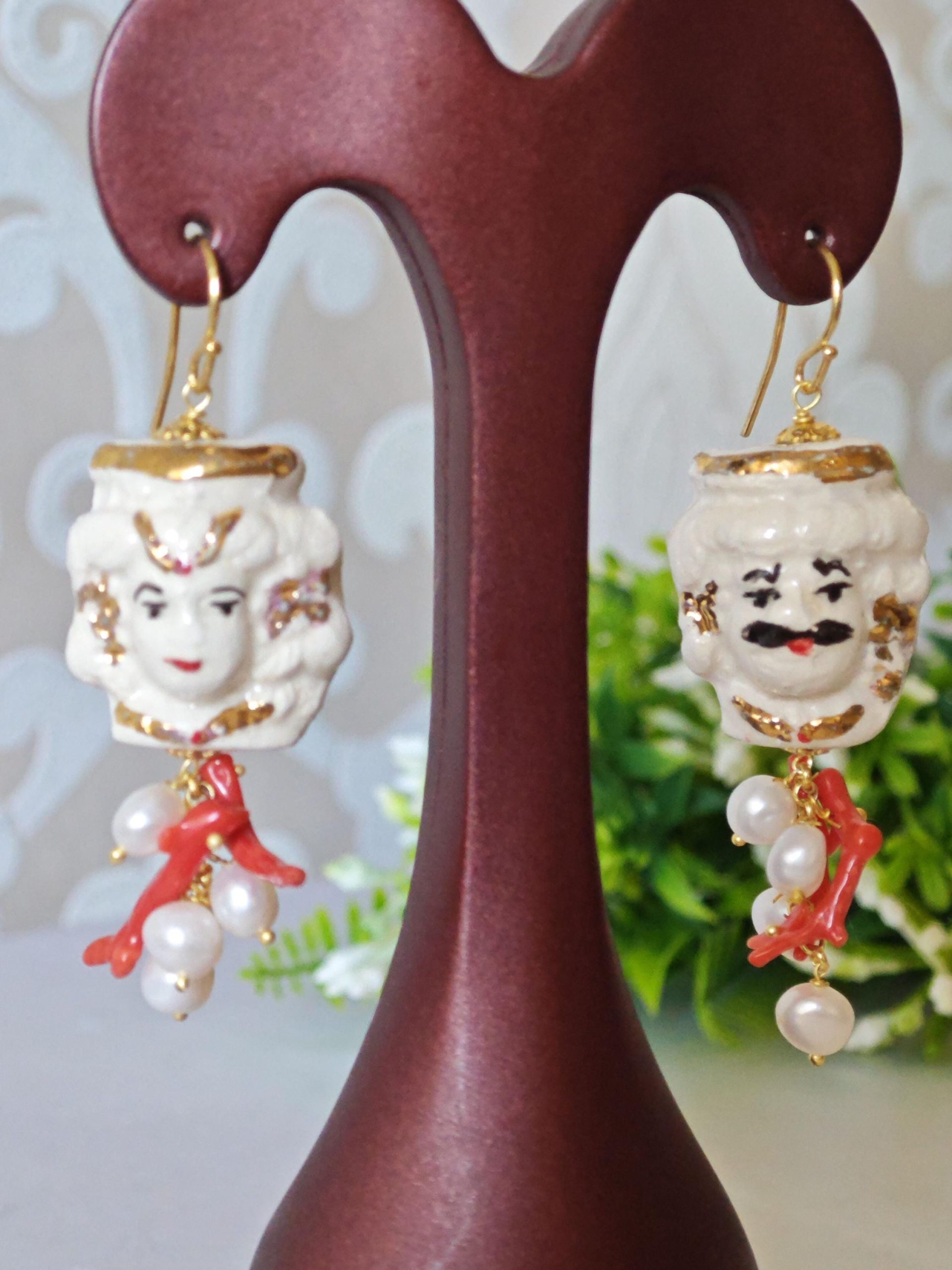 Orecchini con teste di moro in ceramica Caltagirone dipinta e realizzata a mano, con applicazioni foglia oro 22 kt, 3 cm dimensioni con grappolo perle bianche naturali e rametti corallo rosso naturale mediterraneo.
