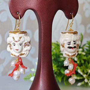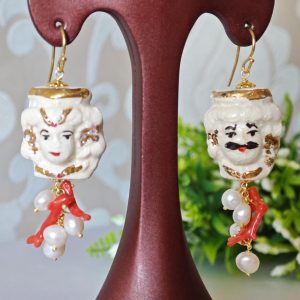 Orecchini teste moro in ceramica di Caltagirone con perle bianche e corallo naturale, orecchini siciliani