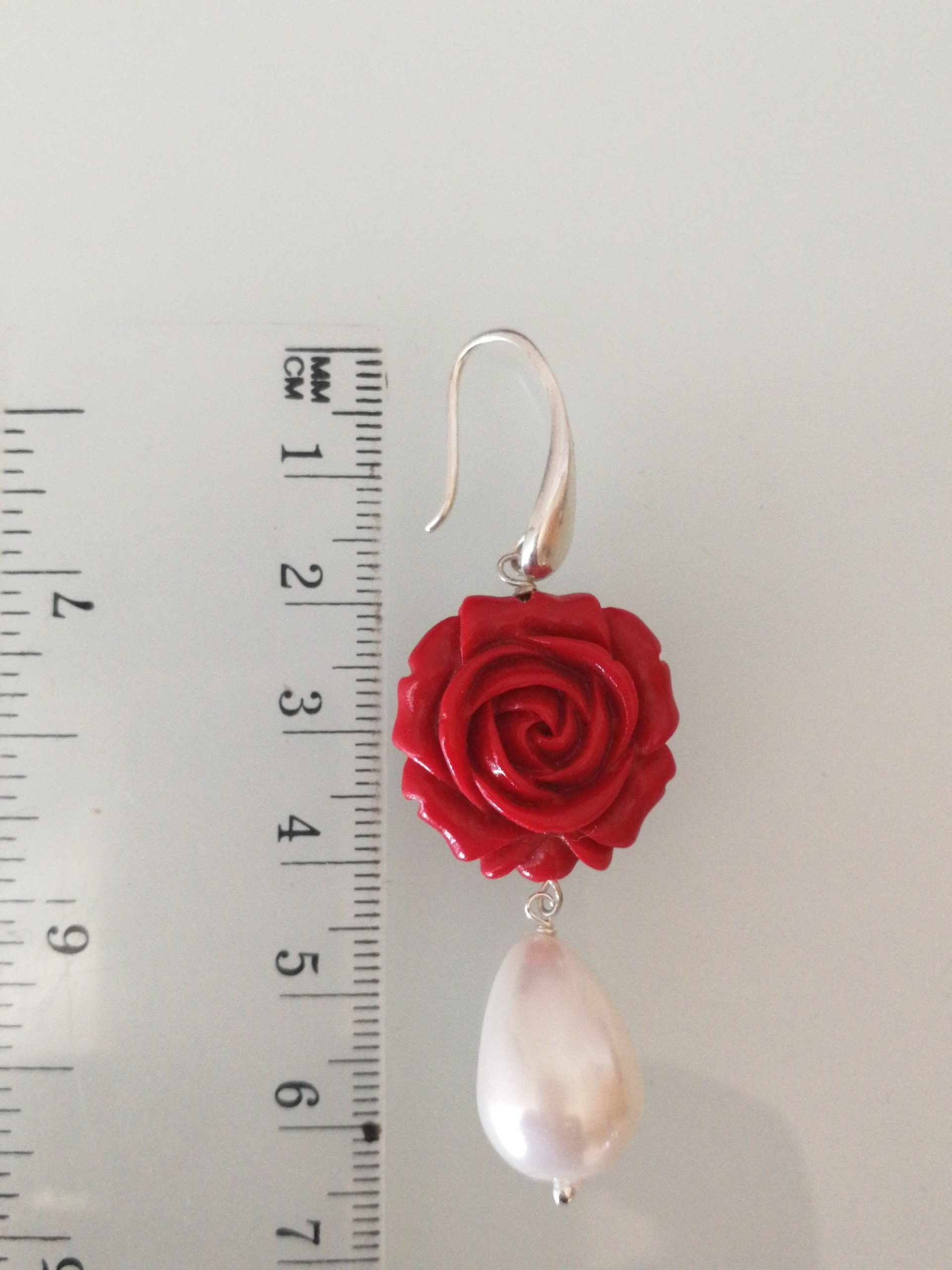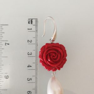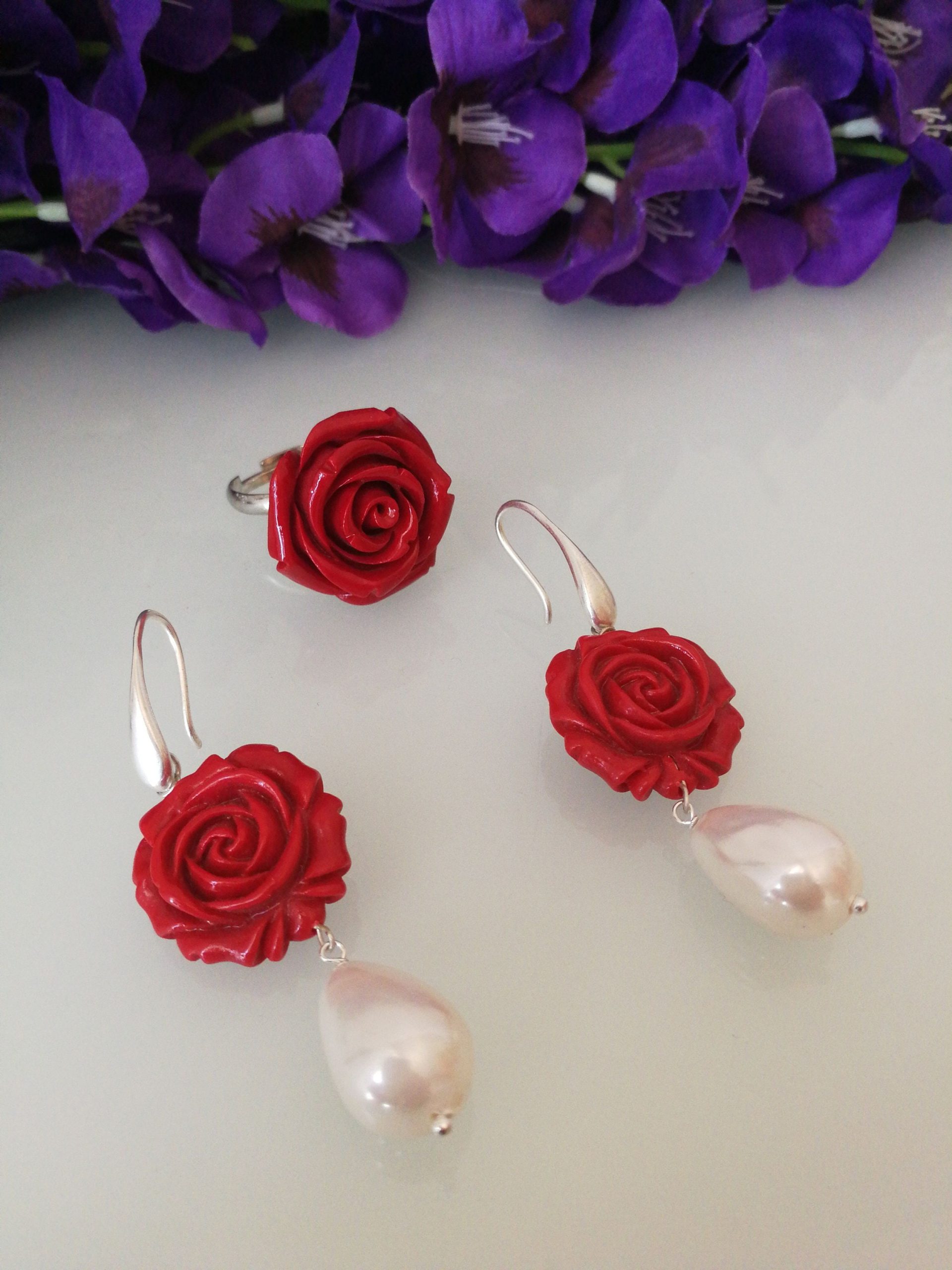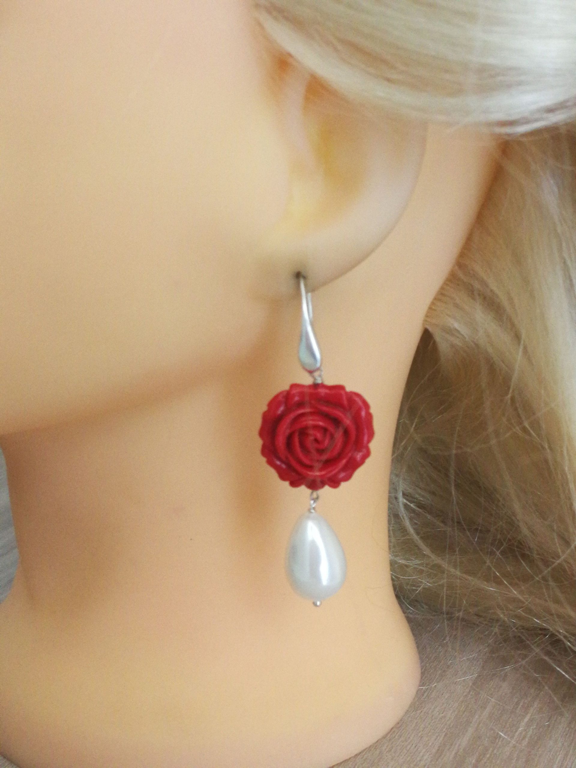 Elegante set di orecchini e anello con rosa rossa in corallo lavorato , imitazione, monachella argento con perla bianca finale a goccia . Misura diametro rosa 2 cm. Anello misura regolabile.Non è corallo naturale.
