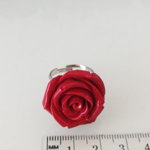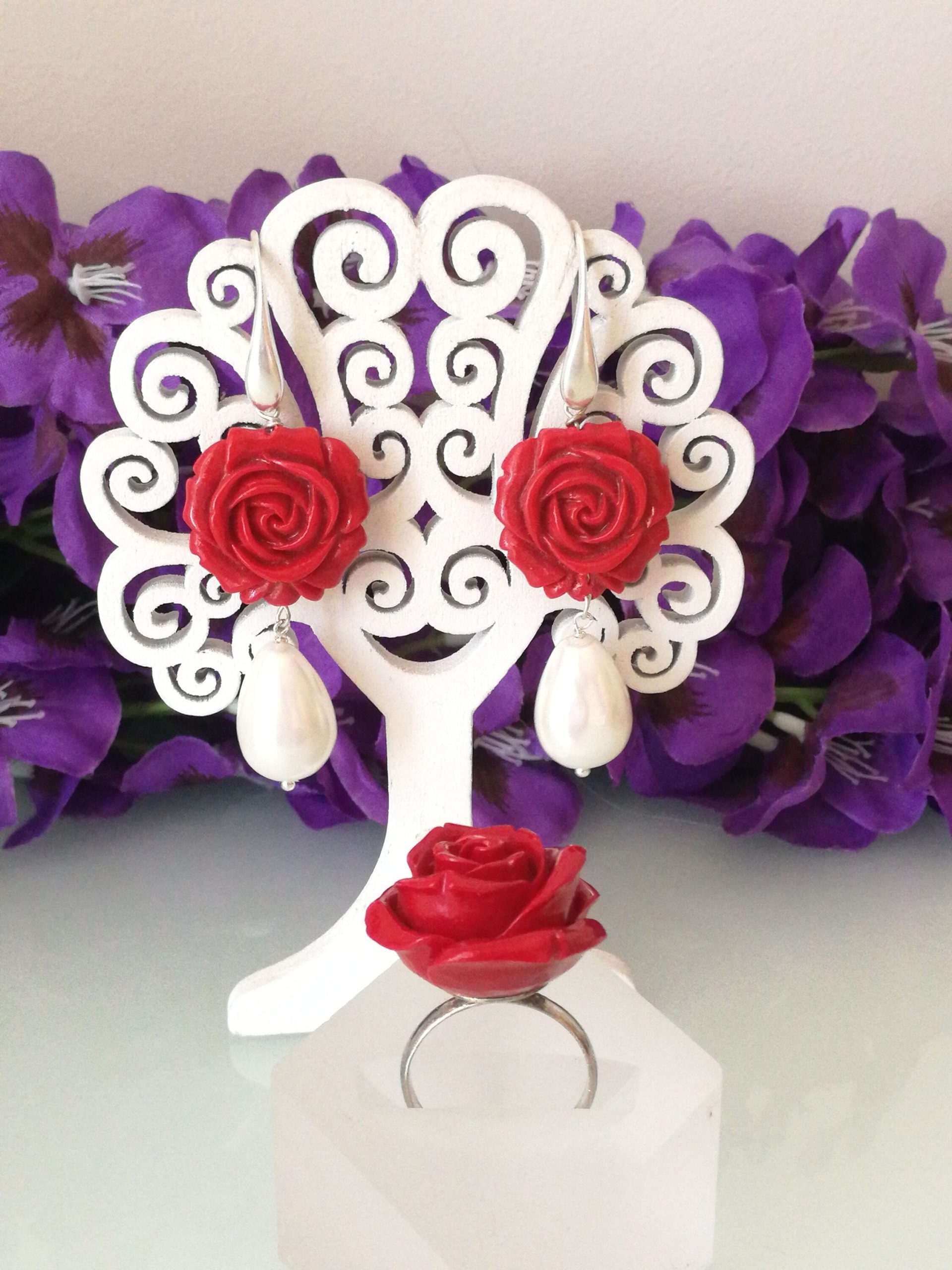 Paroure orecchini rosa rossa, anello rosa rosa resina corallo rosso imitazione.