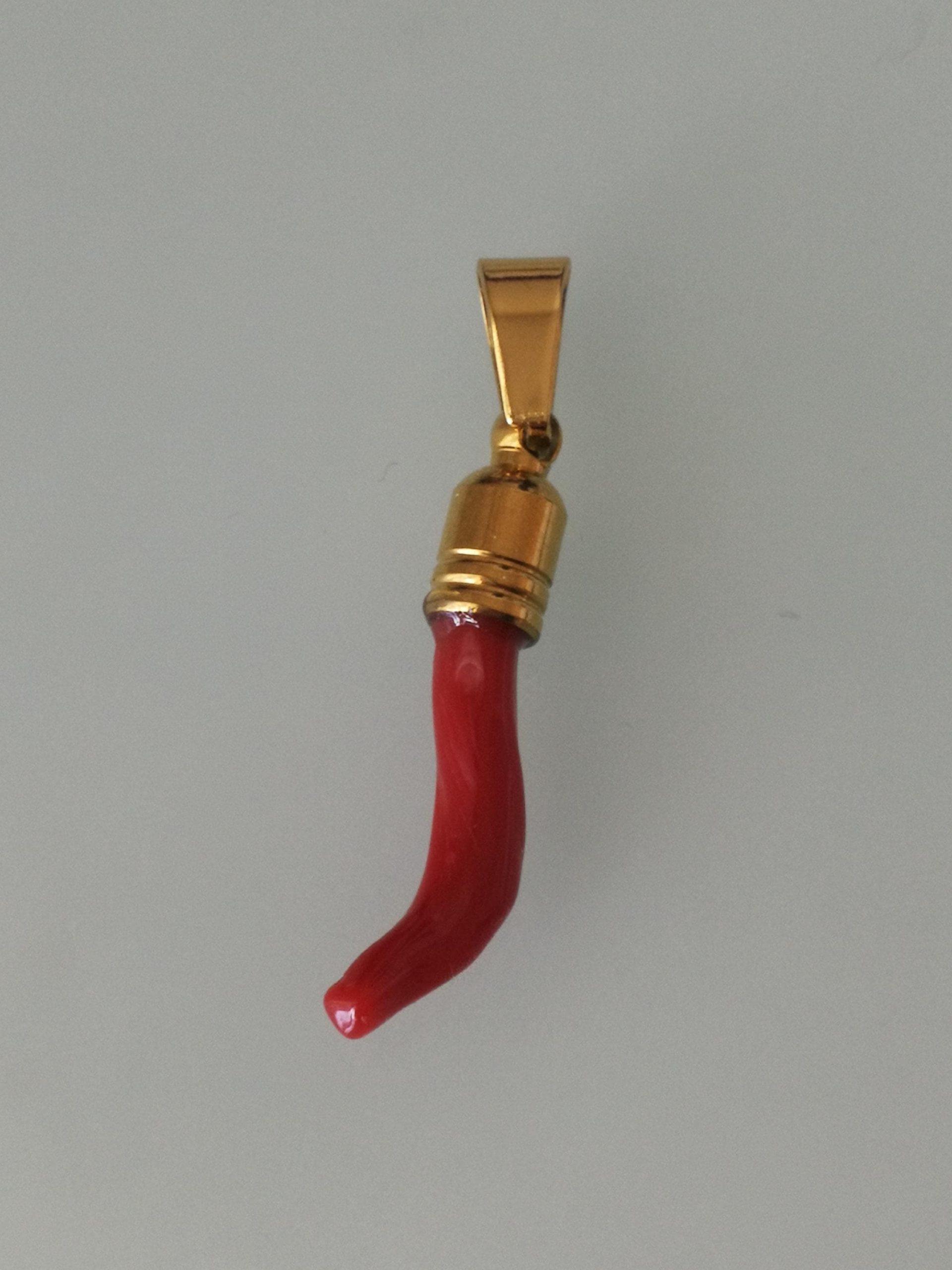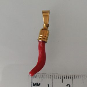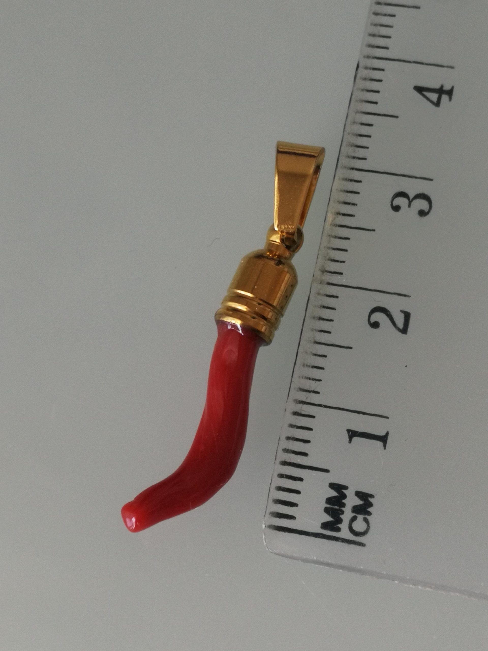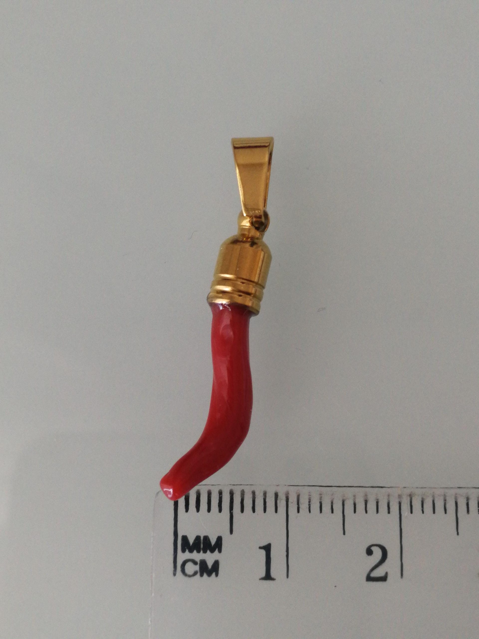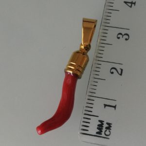 Ciondolo rametto corallo rosso del mediterraneo naturale con montatura in ottone dorato . Misura Lunghezza 3 cm, spessore 0,5 cm. Rametto corallo vero. Rametto portafortuna.