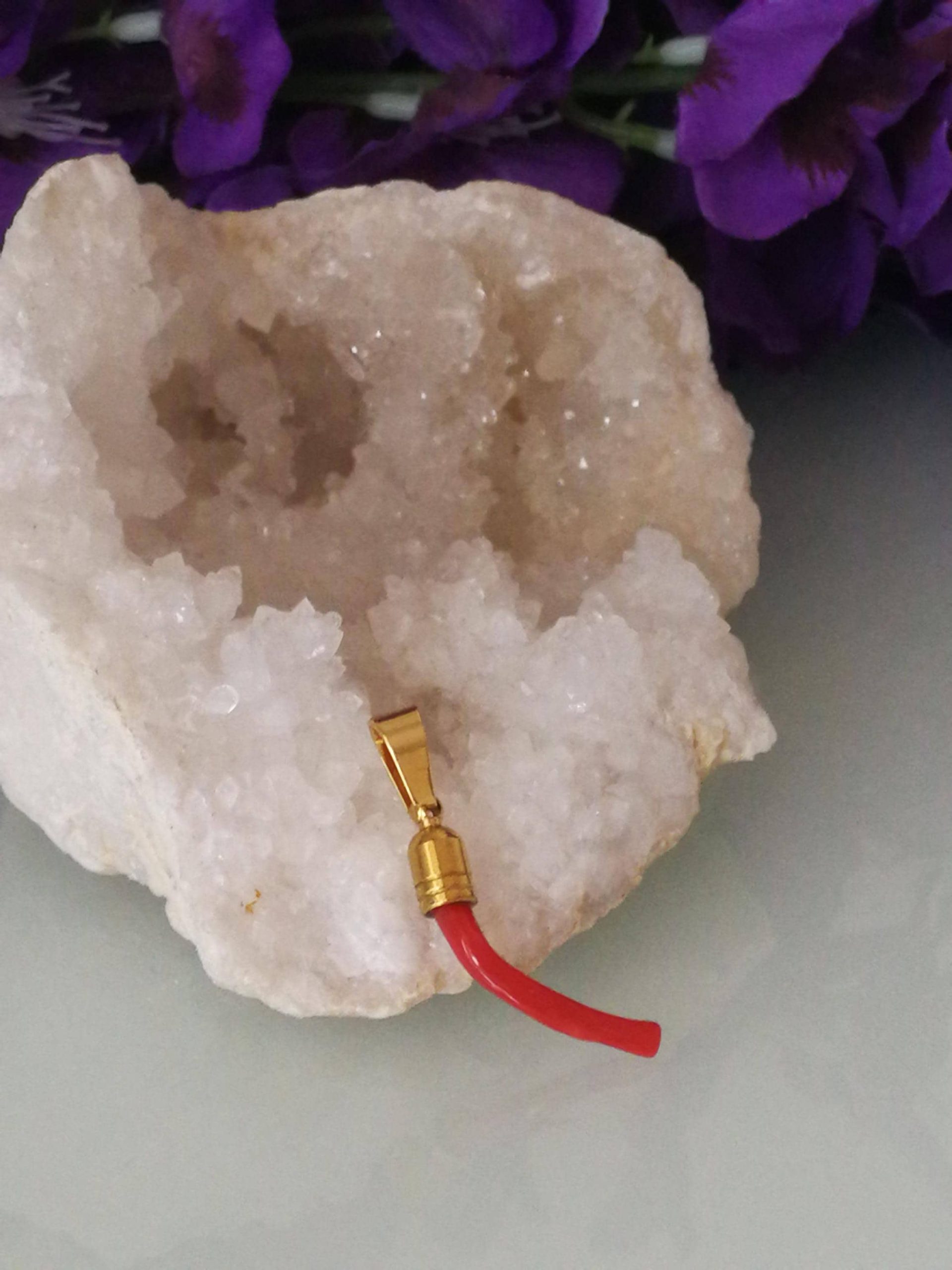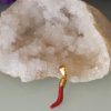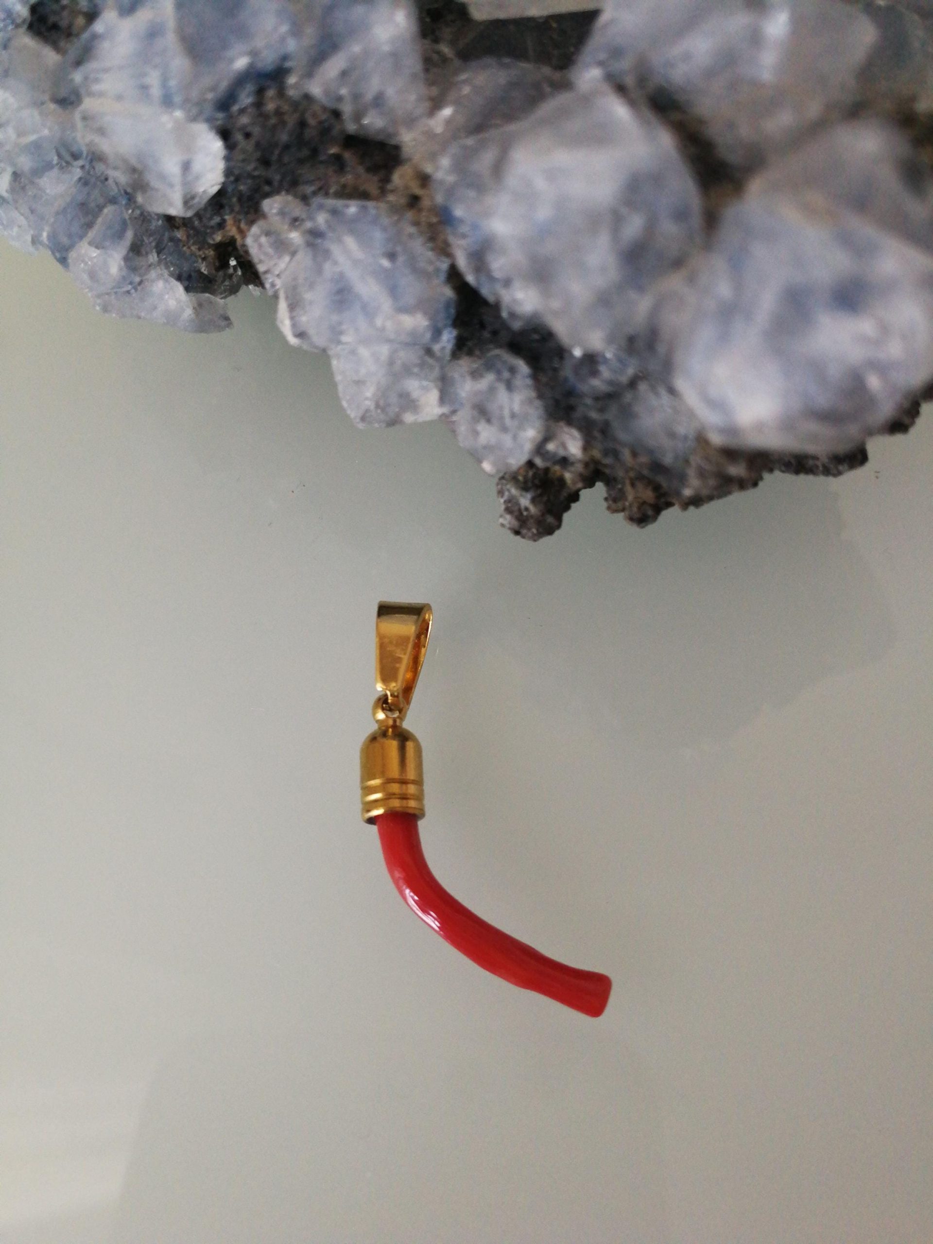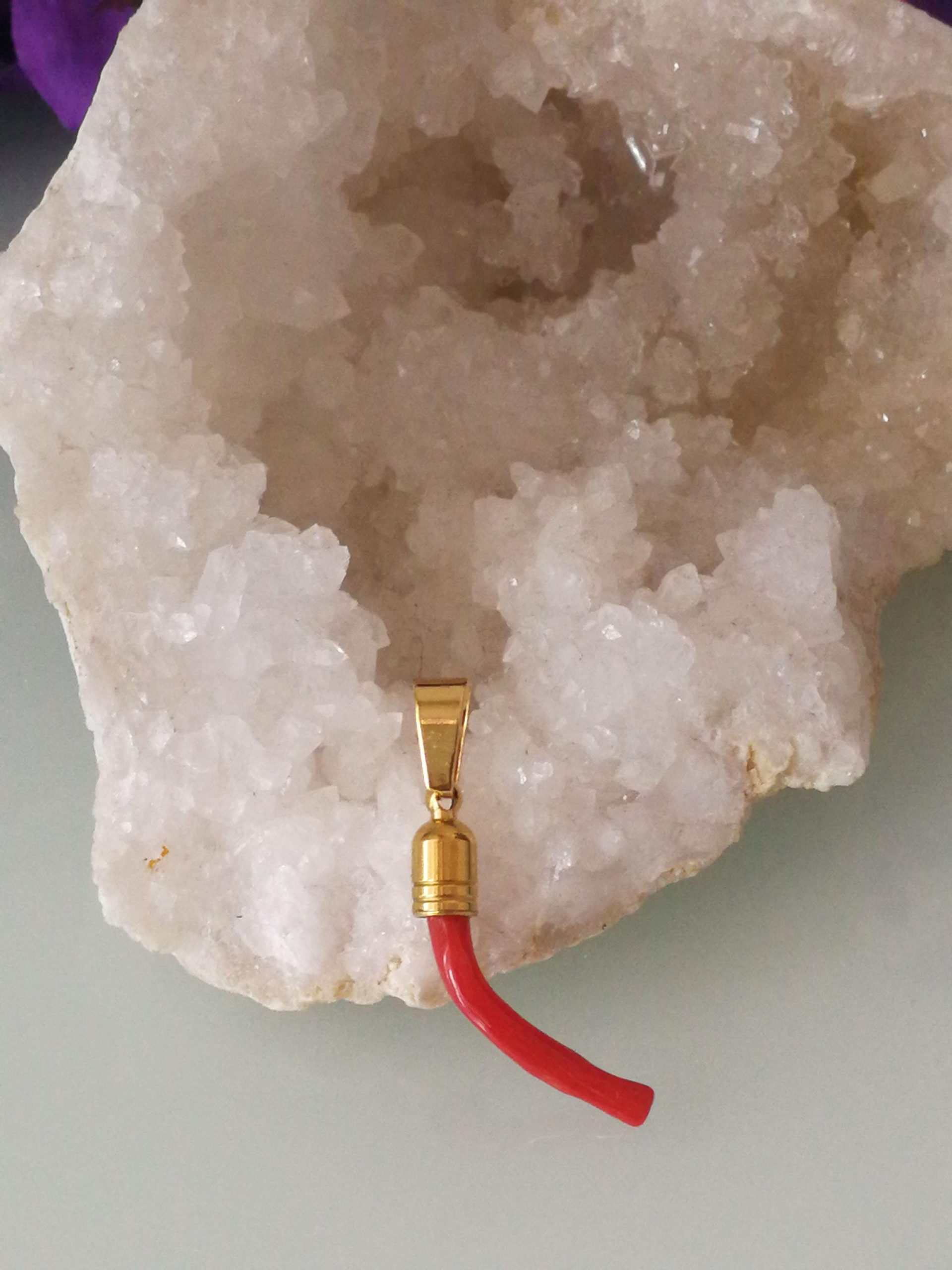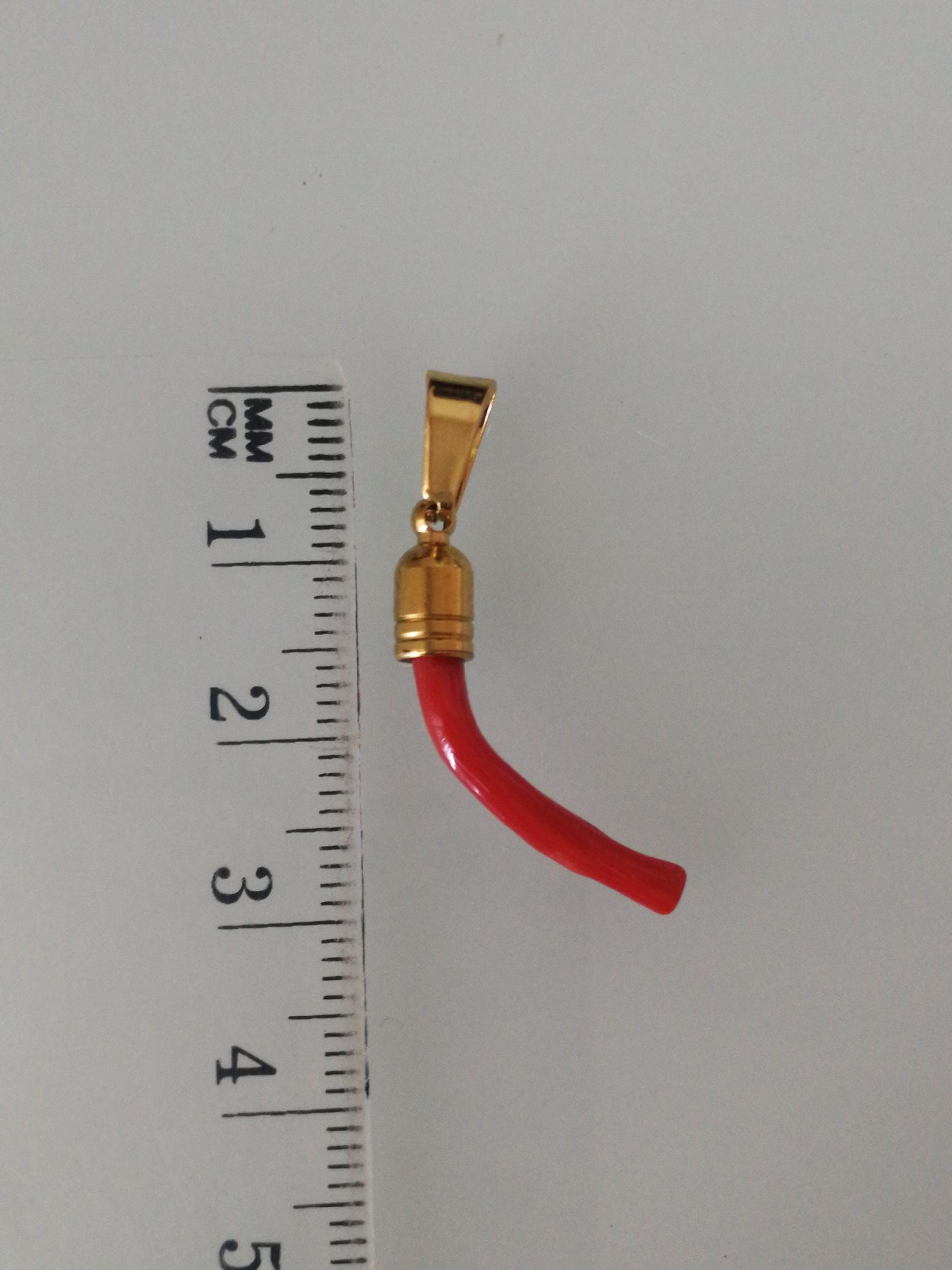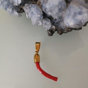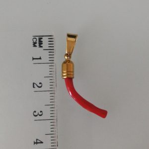 Ciondolo rametto corallo rosso del mediterraneo naturale con montatura in ottone dorato . Misura Lunghezza 3 cm, spessore 0,5 cm. Rametto corallo vero. Rametto portafortuna.