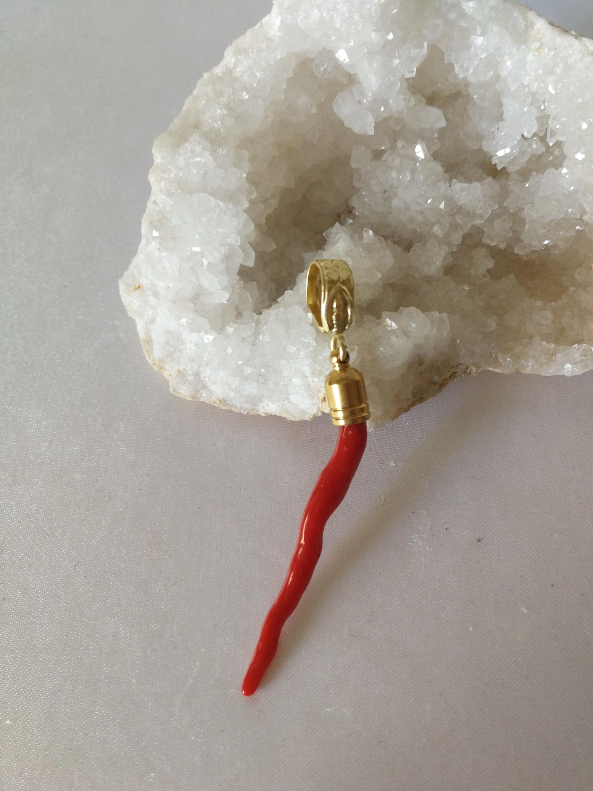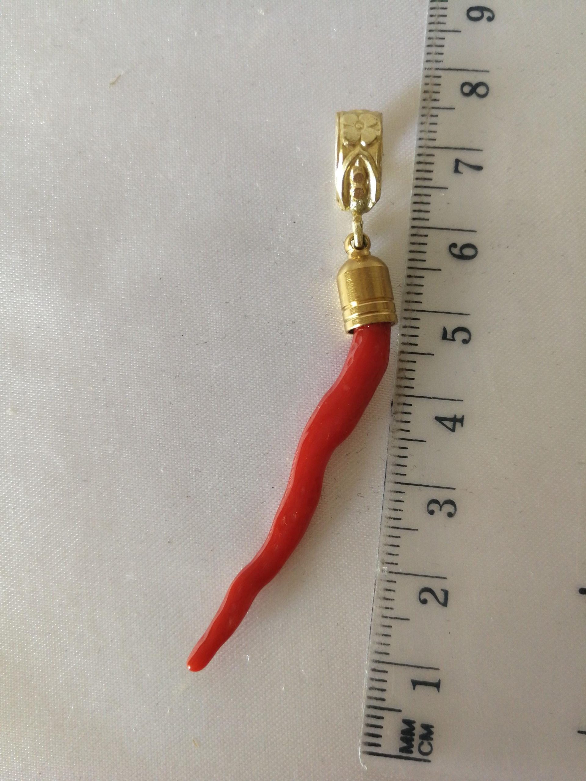 Ciondolo rametto corallo rosso del mediterraneo naturale con montatura in ottone dorato . Misura Lunghezza 7 cm , spessore 0,5 cm. Rametto corallo vero. Rametto portafortuna.