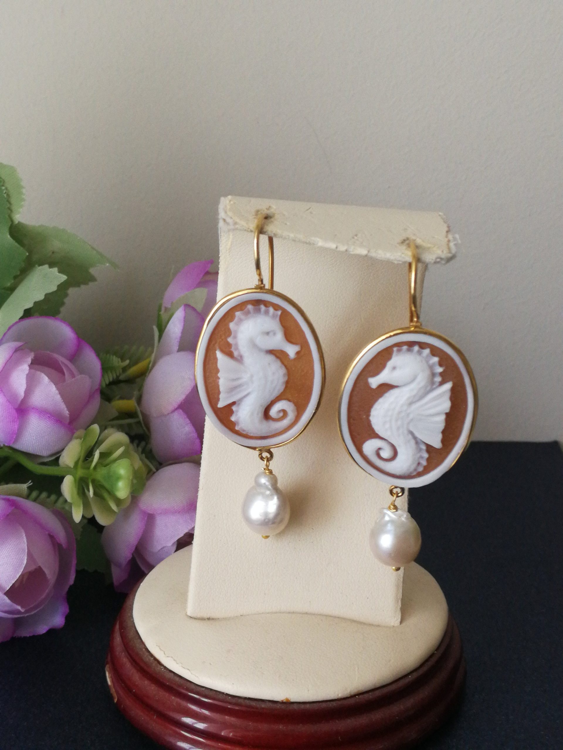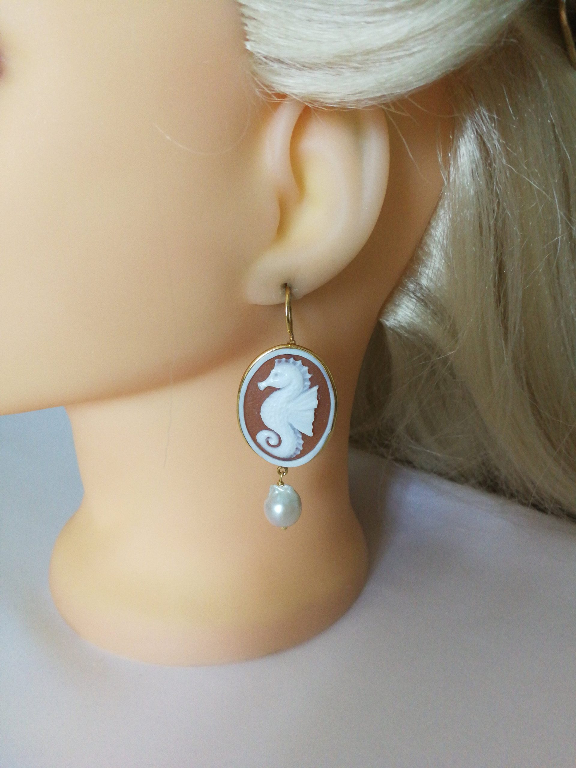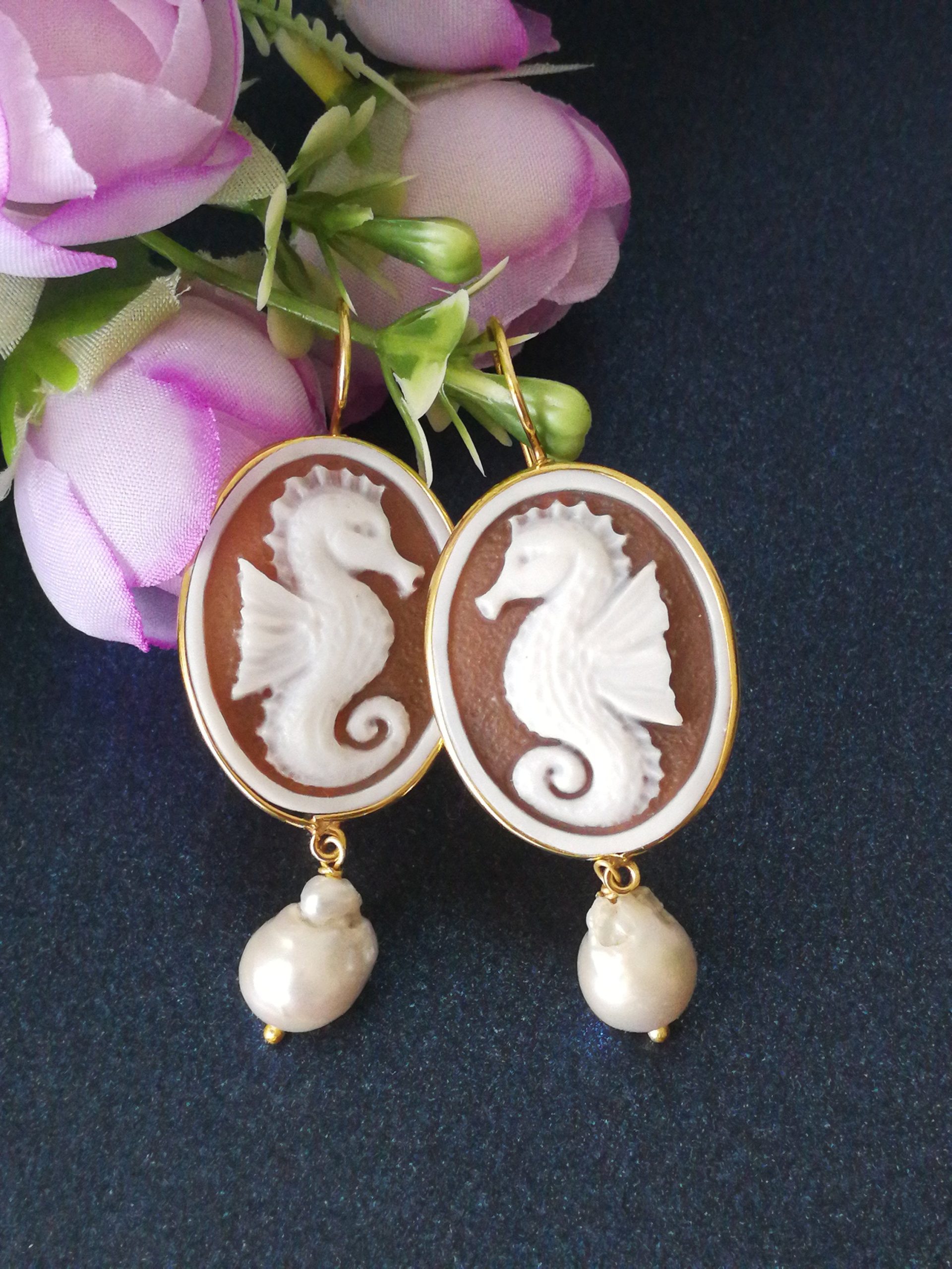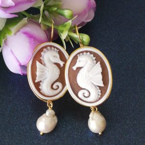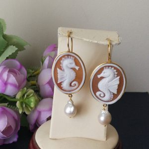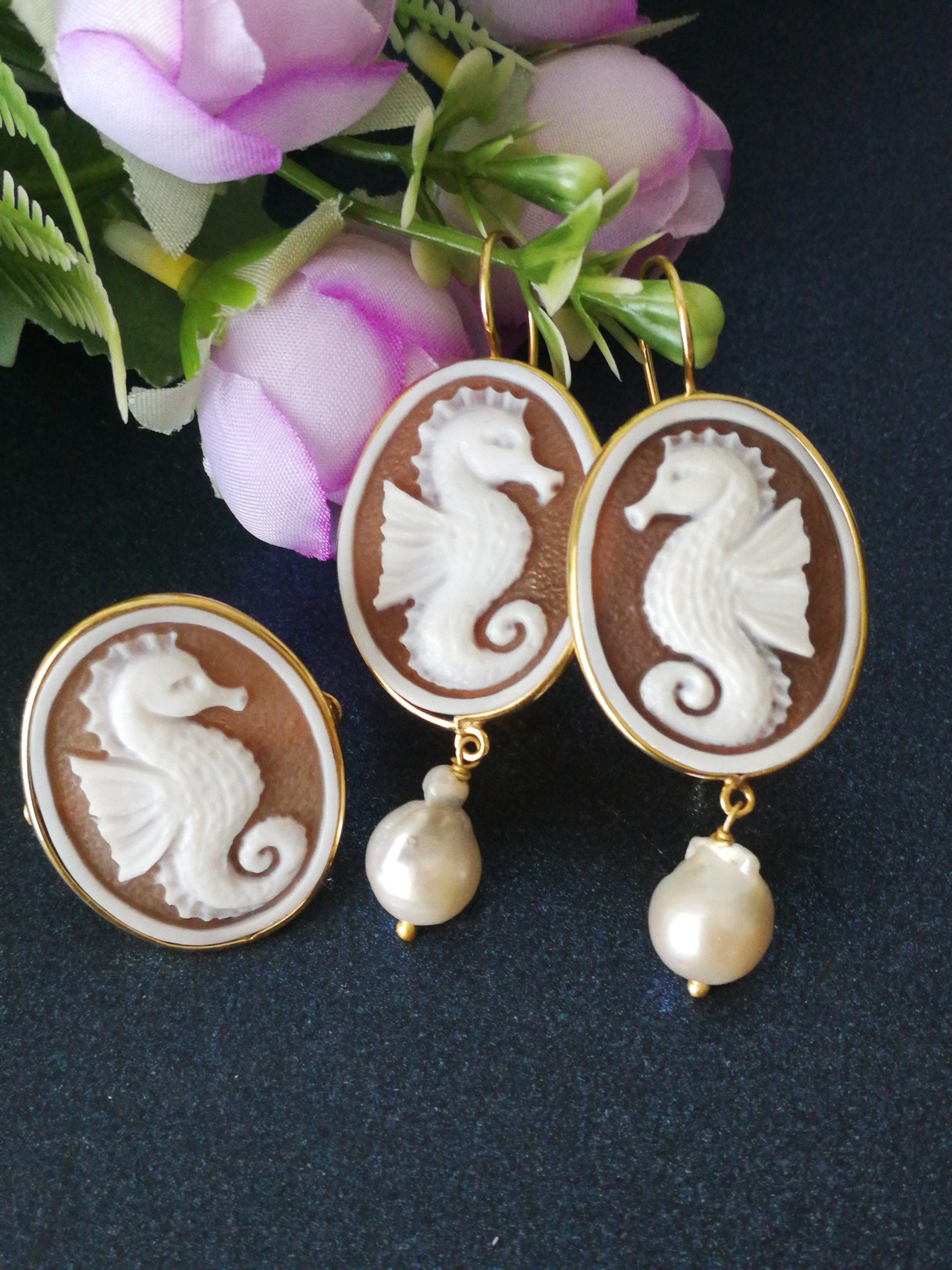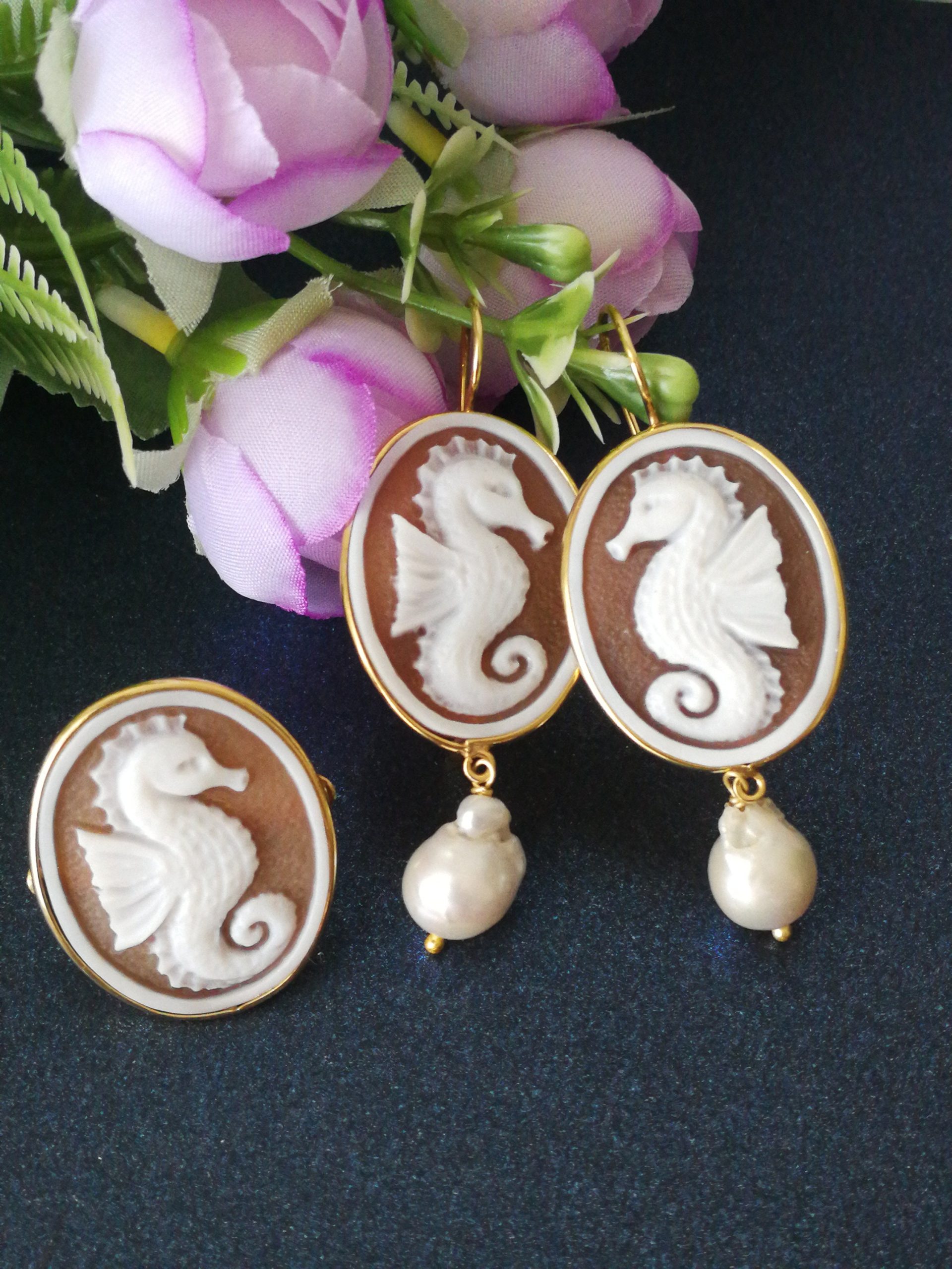 Set Orecchini anello cammeo conchiglia originale. Orecchini Cavalluccio .Orecchini argento con perle barocche bianche. Gioielli Italiani