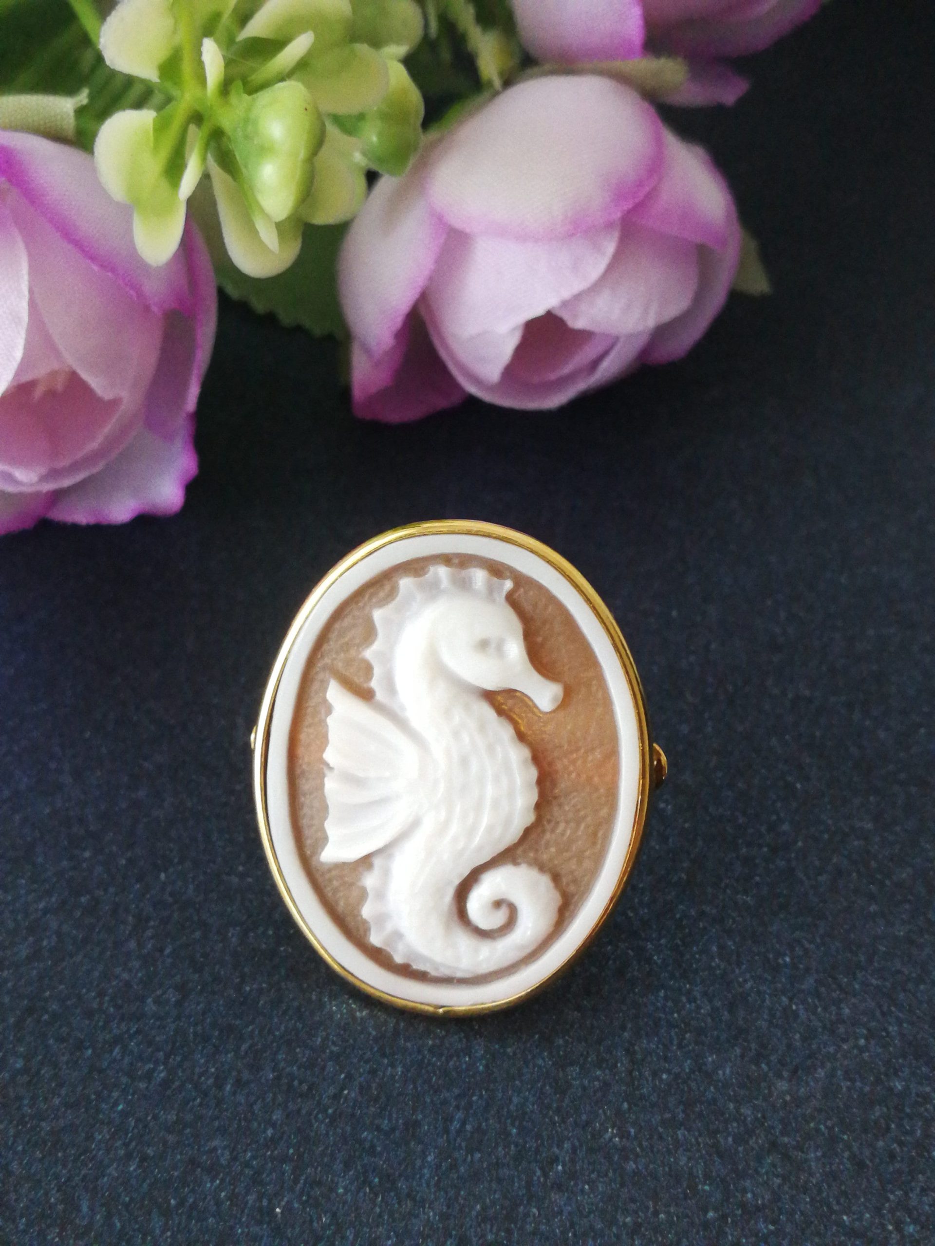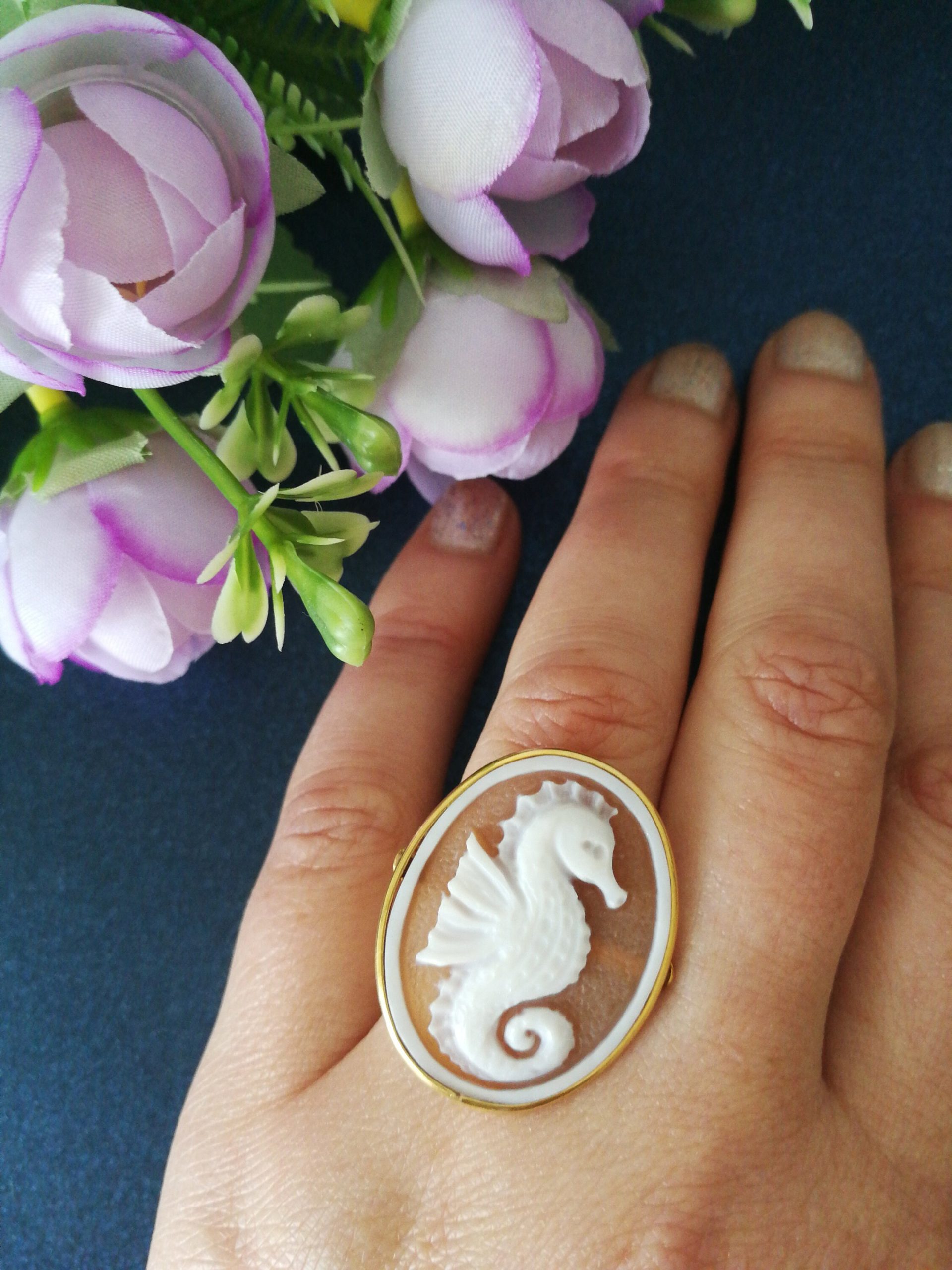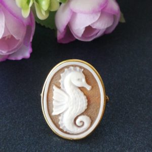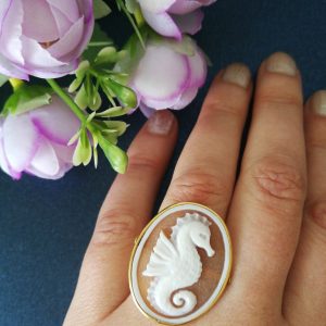 Set orecchini cammeo originale e anello cammeo. Orecchini con cammeo originale di Torre del Greco Italia raffigura Cavalluccio marino, con montatura in argento placcata oro a monachella chiusa e perla naturale barocca bianca finale. Anello con cammeo che raffigura Cavalluccio marino, montatura in argento placcata oro. Misura cammeo lunghezza 3 cm/ Larghezza 2, 5 cm. Misura anello regolabile. Cammei perfetti.