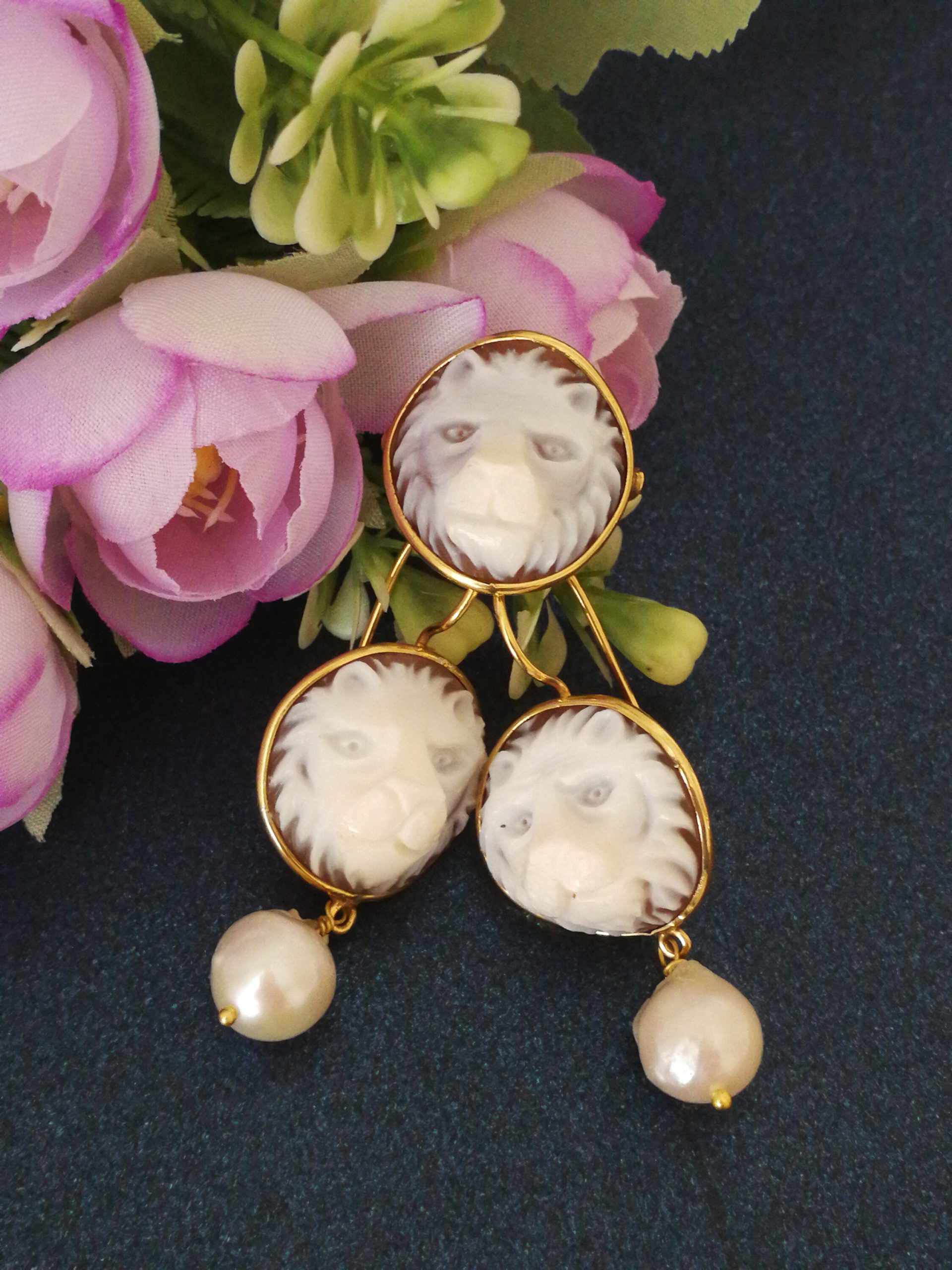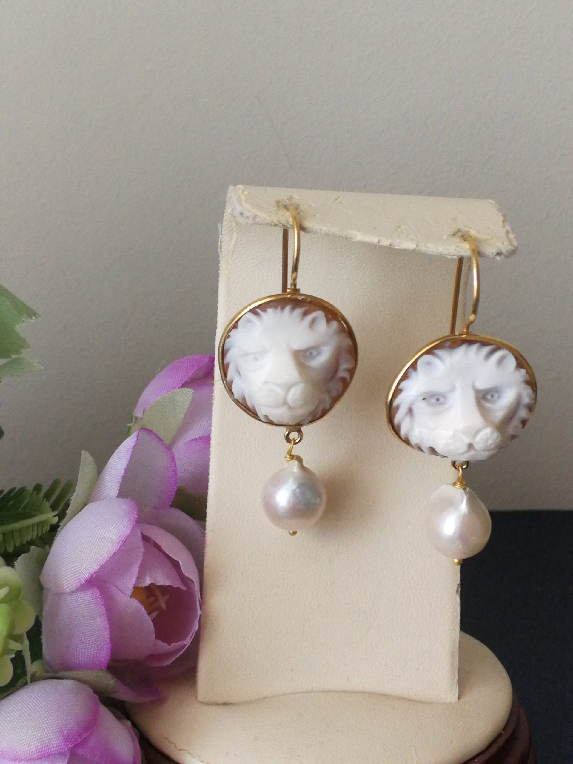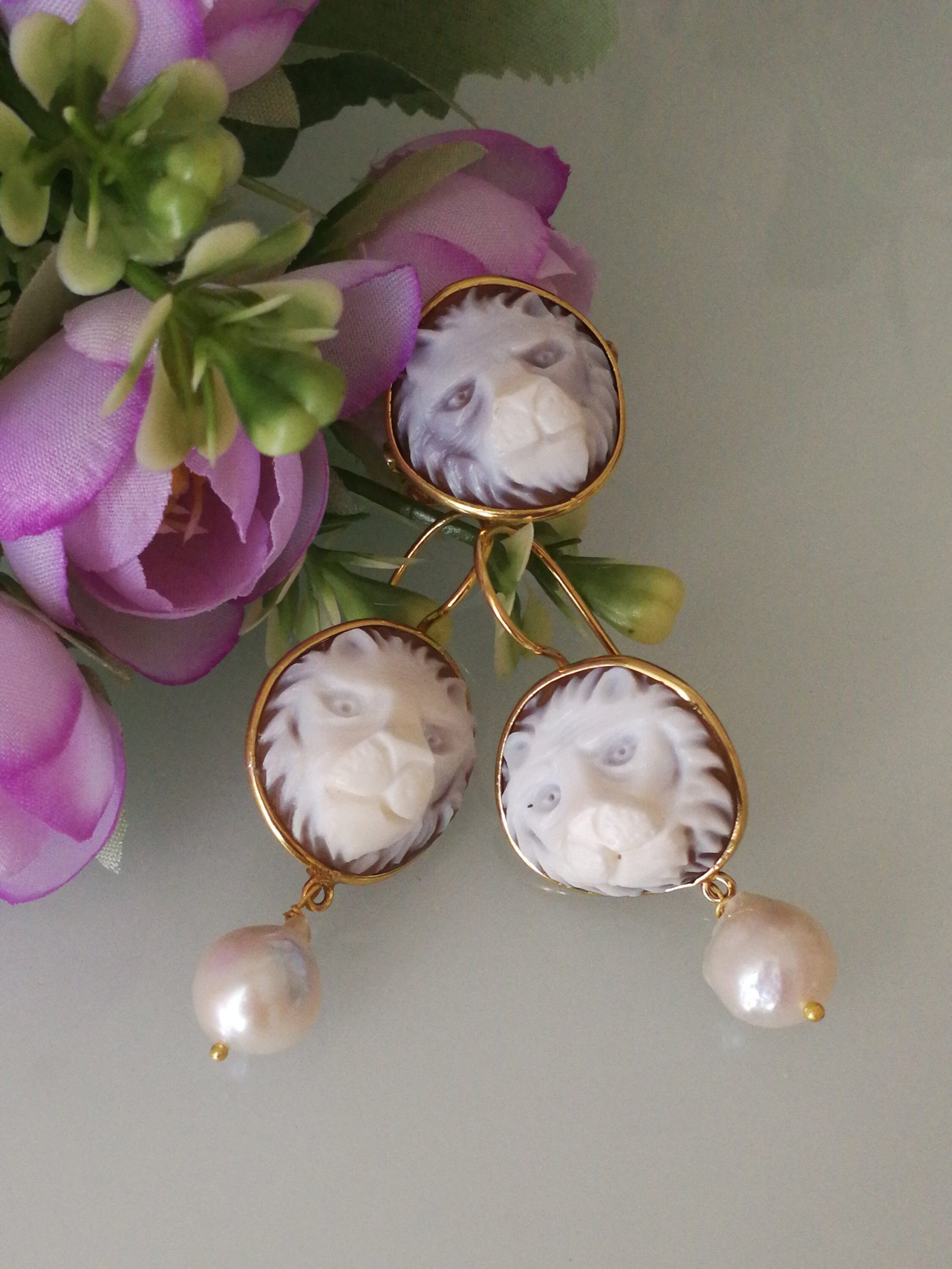 Set Orecchini anello cammeo conchiglia originale. Orecchini Leone .Orecchini argento con perle barocche bianche. Gioielli Italiani