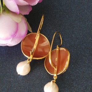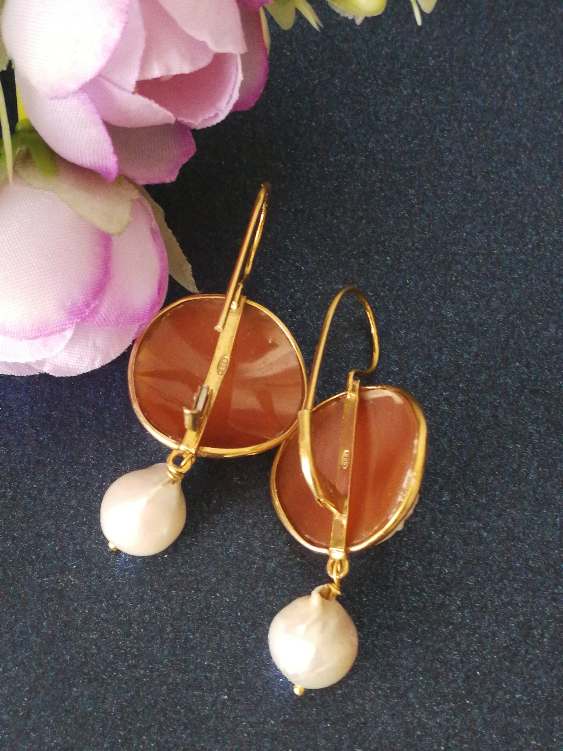 Orecchini  cammeo conchiglia sardonica e perle barocche bianche, orecchini argento 925 placcato oro, gioielli italiani