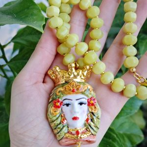 Collana cammeo ceramica di Caltagirone con pietre dure giada rosa e perle, collana siciliana