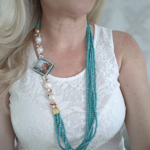 Collana piastrella ceramica di Caltagirone, collana multifilo cristalli blu , collana siciliana