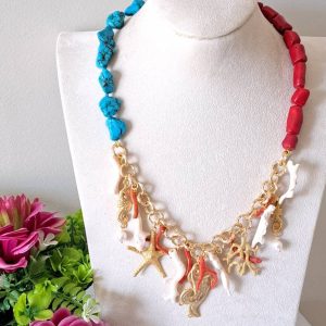 Collana pietre turchese e corallo rosso e corallo bianco , collana girocollo, collana charms