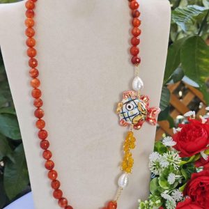 Collana girocollo corallo rosso con pesce in ceramica Caltagirone, collana  siciliana